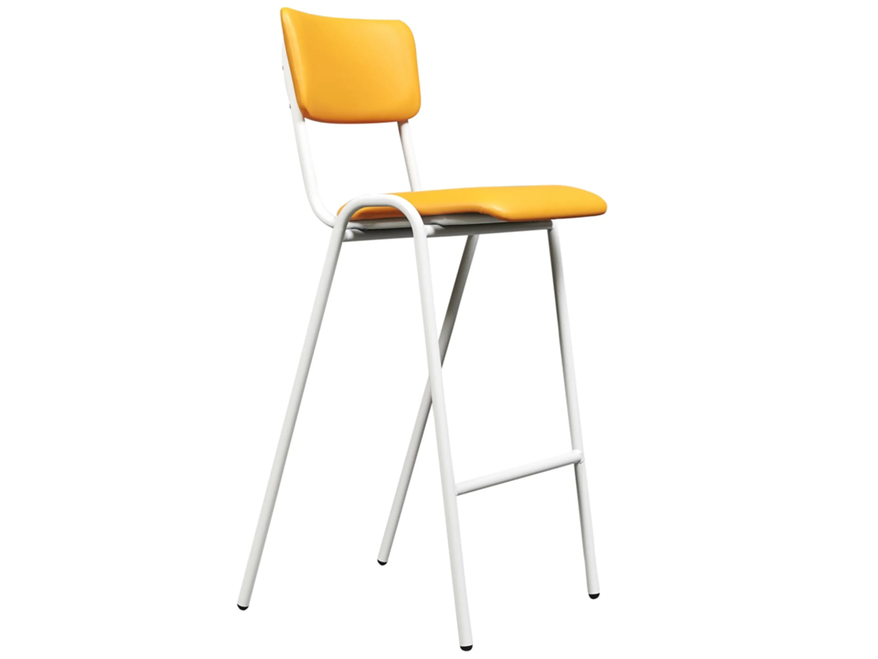 Barkruk op 4 poten, met voetensteun, met gestoffeerde zitting en rugleuning.