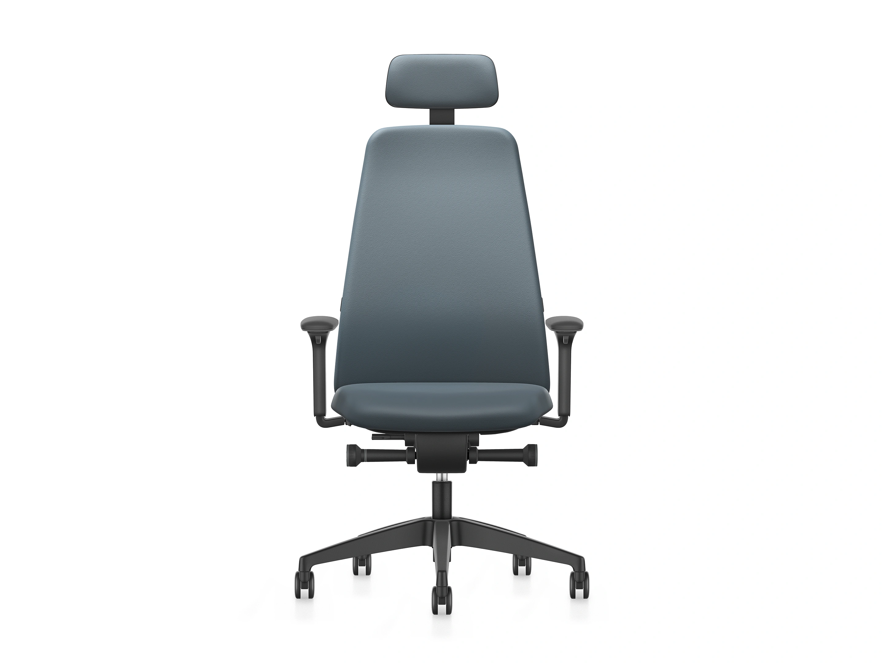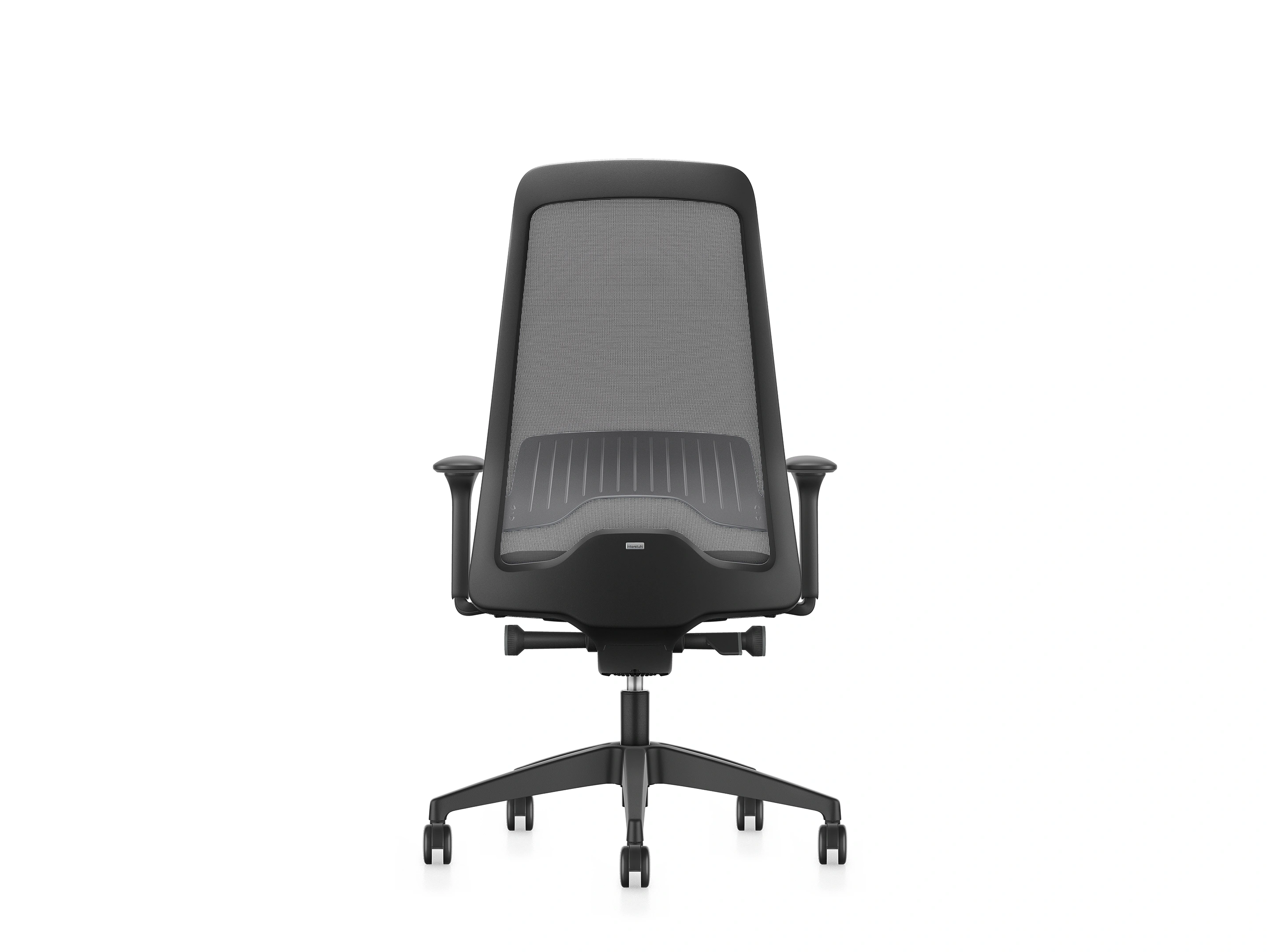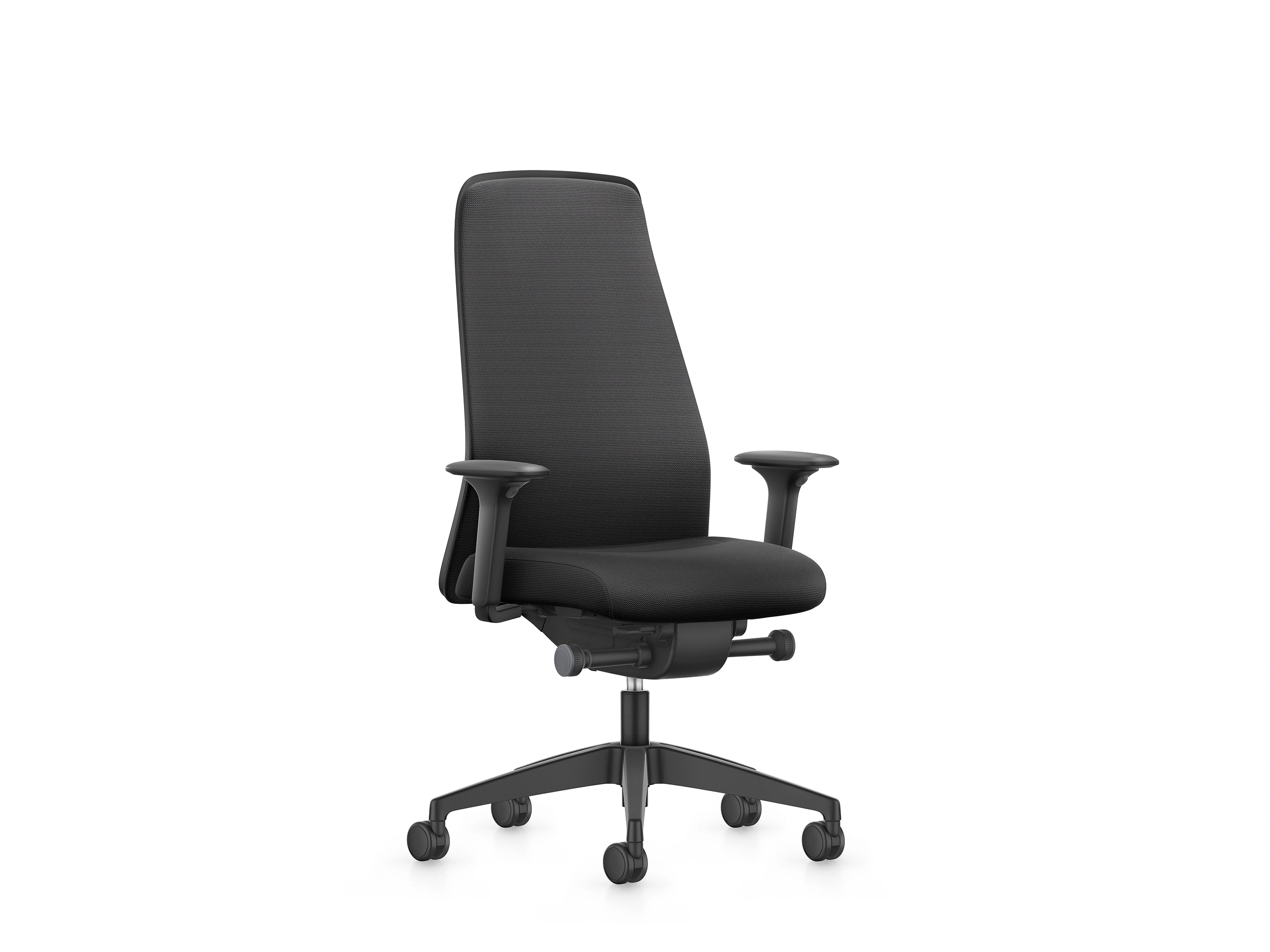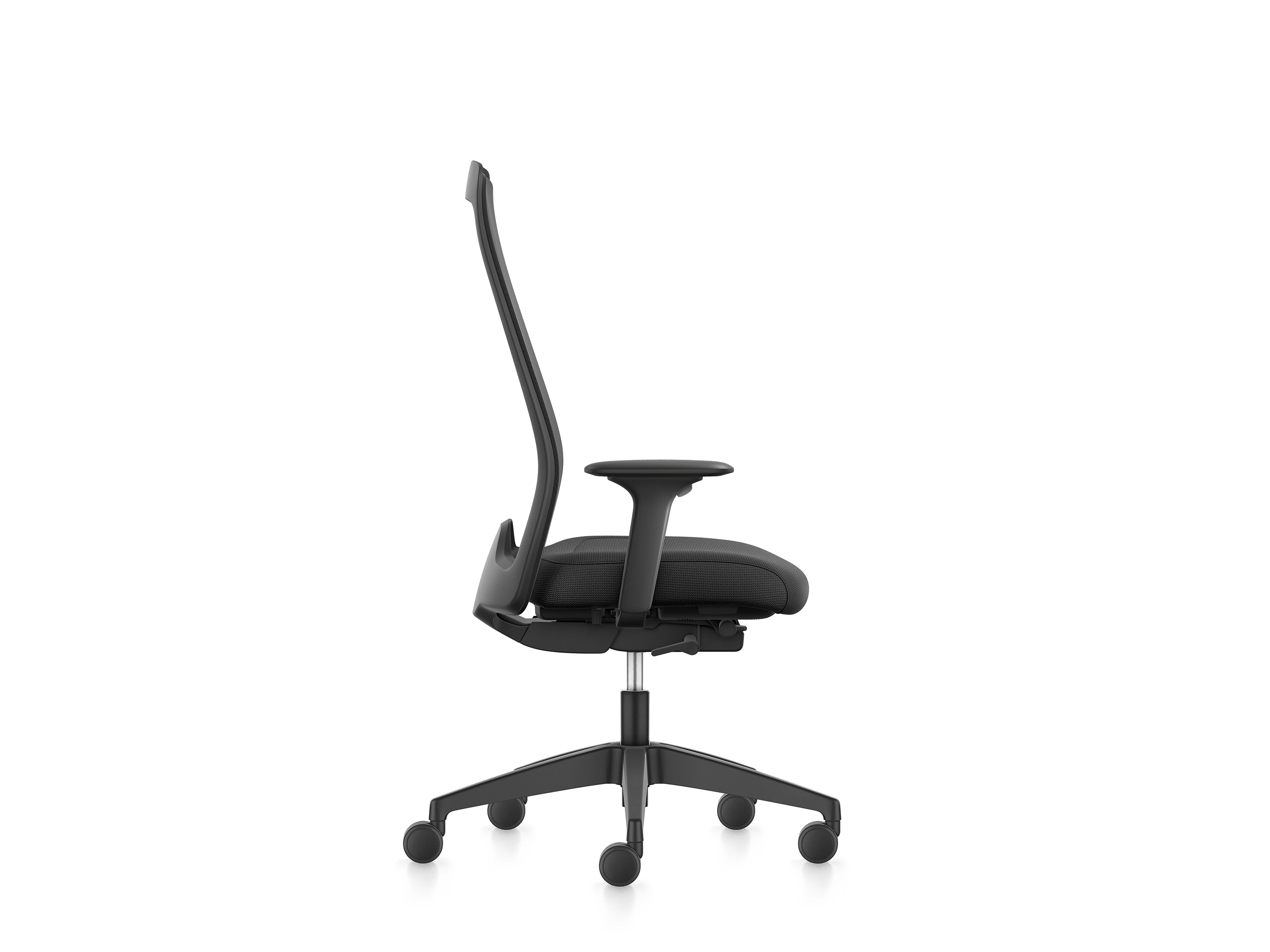 Standaard met: Synchroonmechaniek met gewichtsregeling, 4D armleggers (hoogte, 2x breedte, diepte verstebaar), Zithoogte-, Zitdiepte verstelling, hoogte verstelbare lendensteun, Universele wielen. Volledig zwart