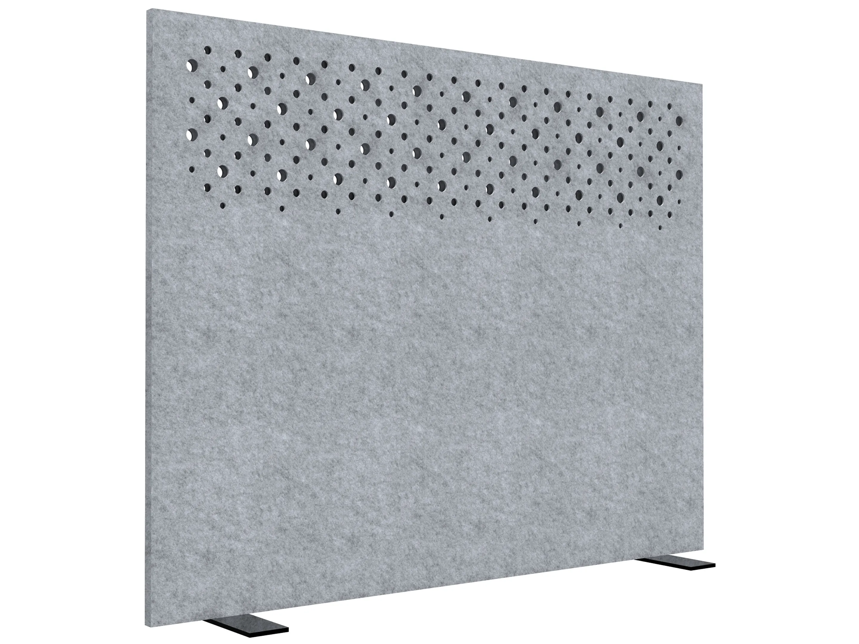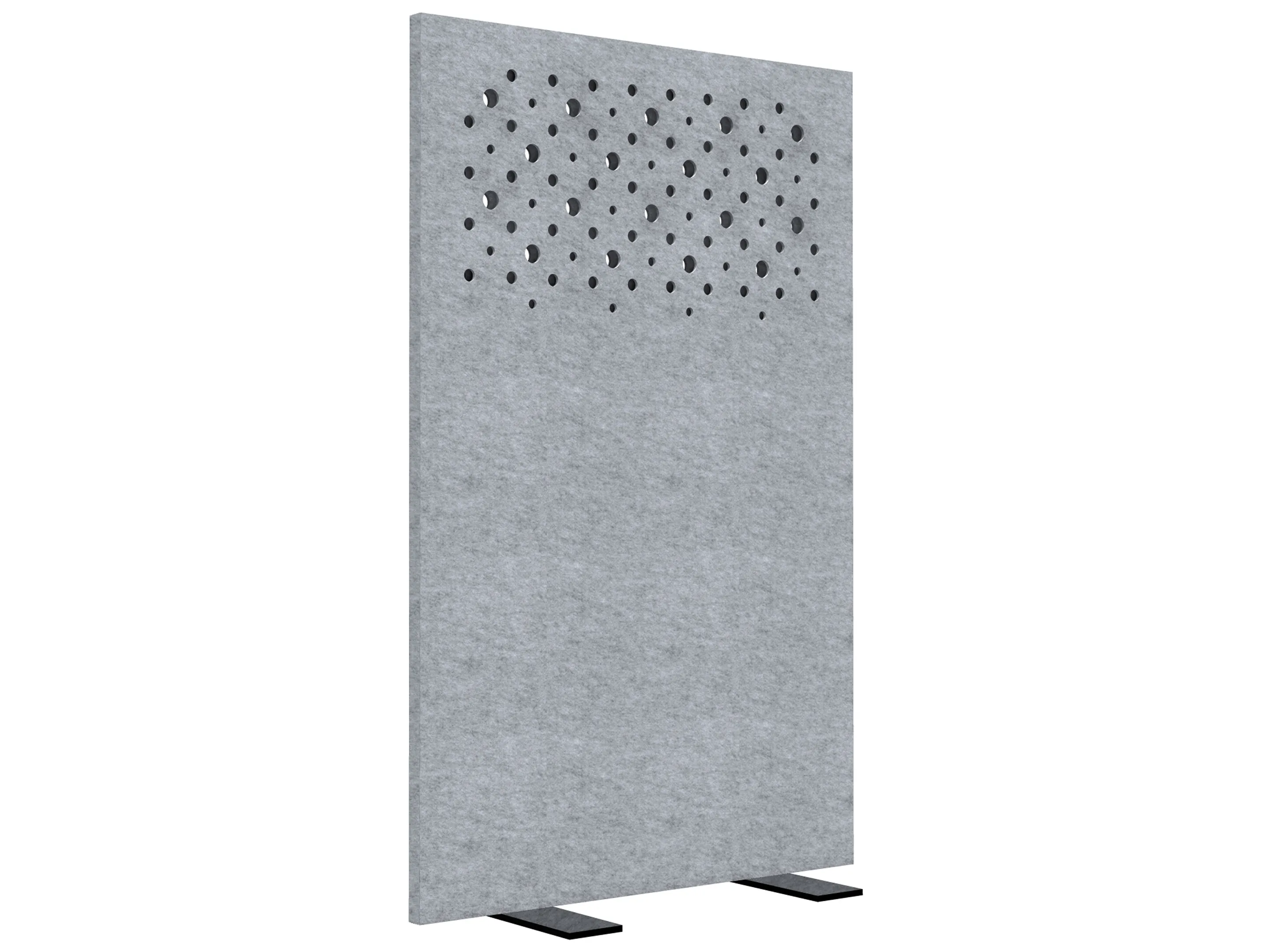 Vrijstaand akoestisch paneel met een circel patroon incl. voet + aluminiumprofiel met aan beide zijden viltpanelen en een NRC Waarde van 0,60.