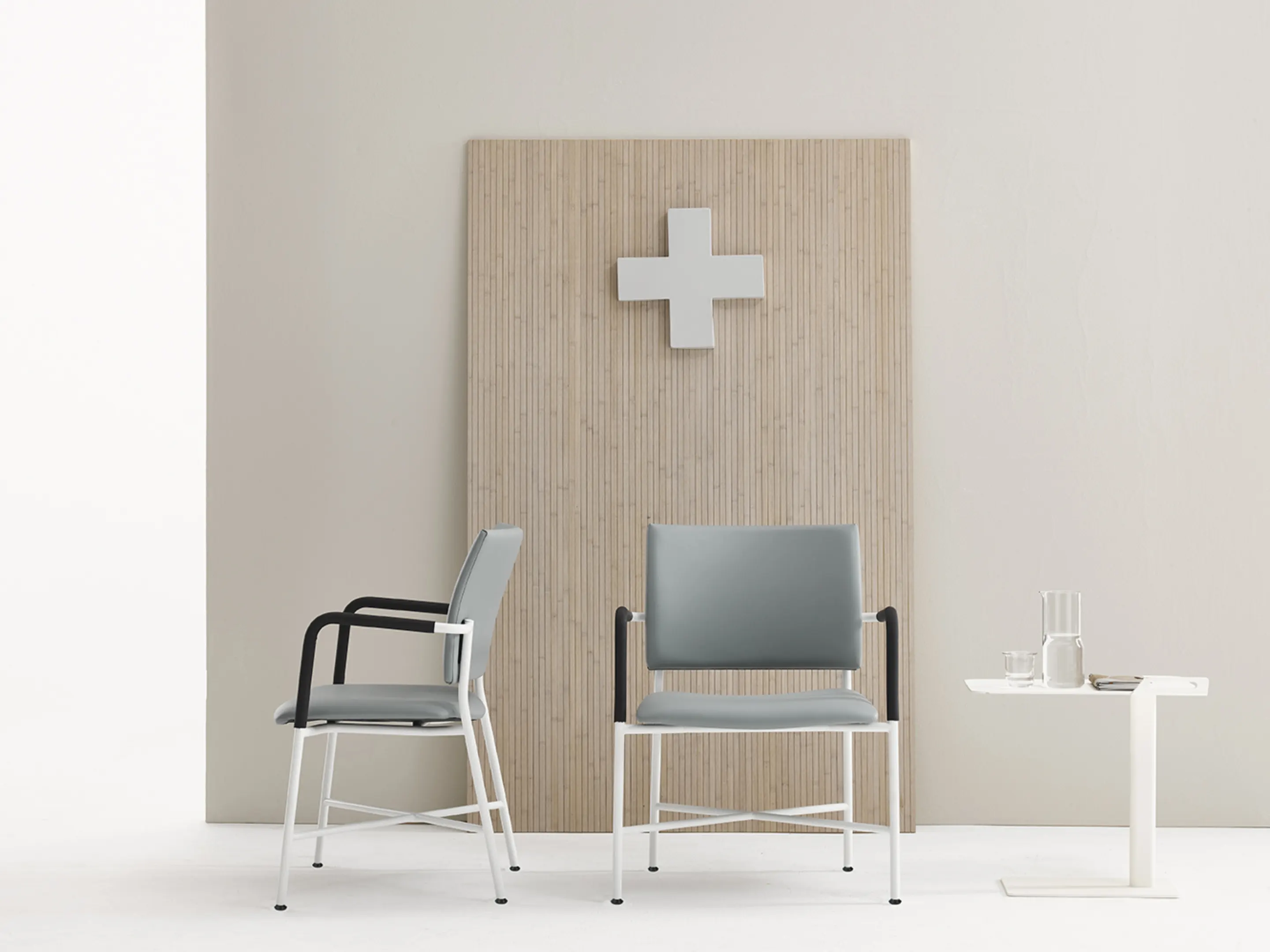 4-poots frame op kunststof glijders met een gestoffeerde zitting en rug. Inclusief armleggers. Niet stapelbaar.