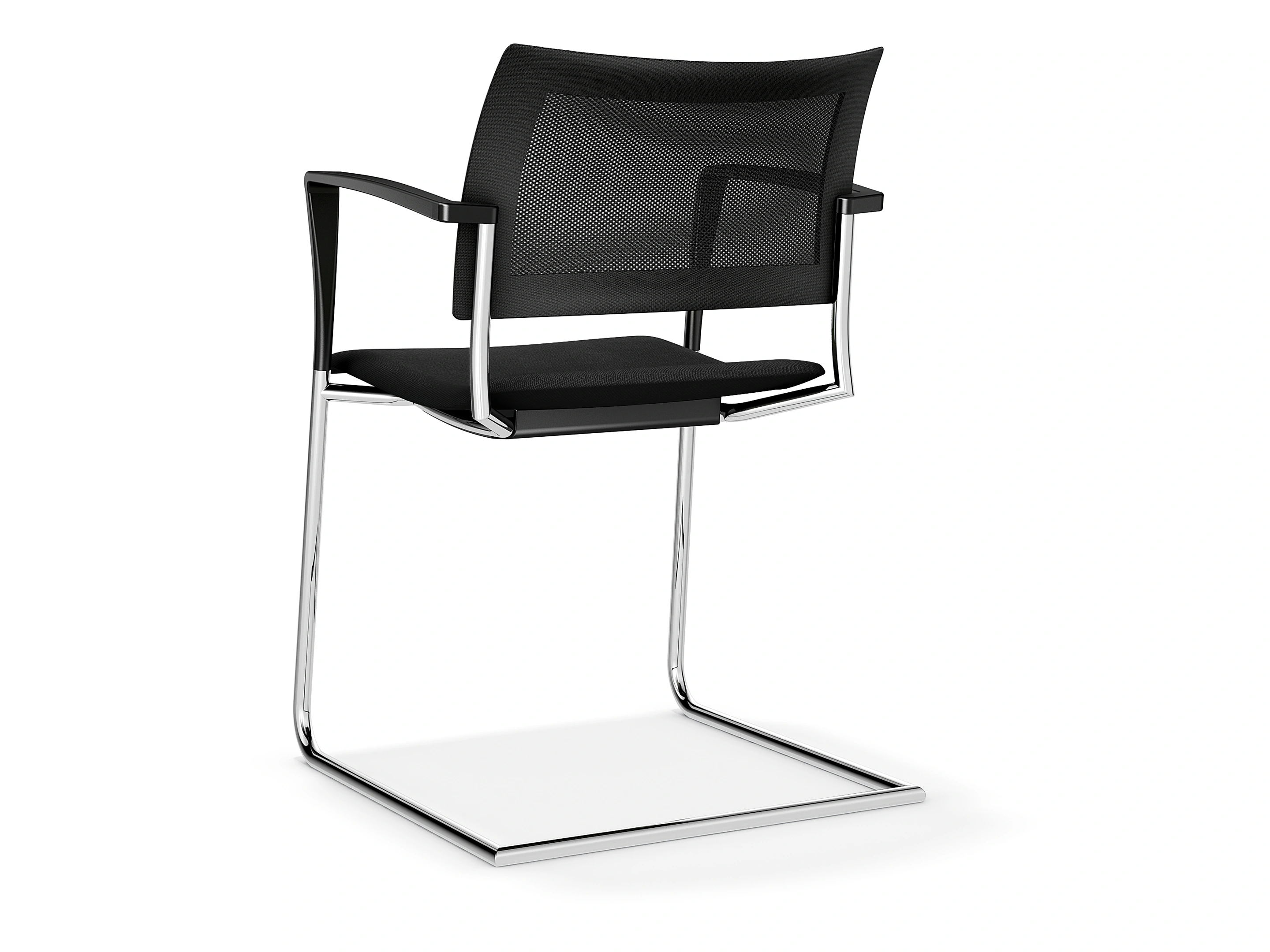 Sledeframe met een gestoffeerde zitting en netbespannen rug. Incl. armleggers. Stapelbaar tot 8 stuks