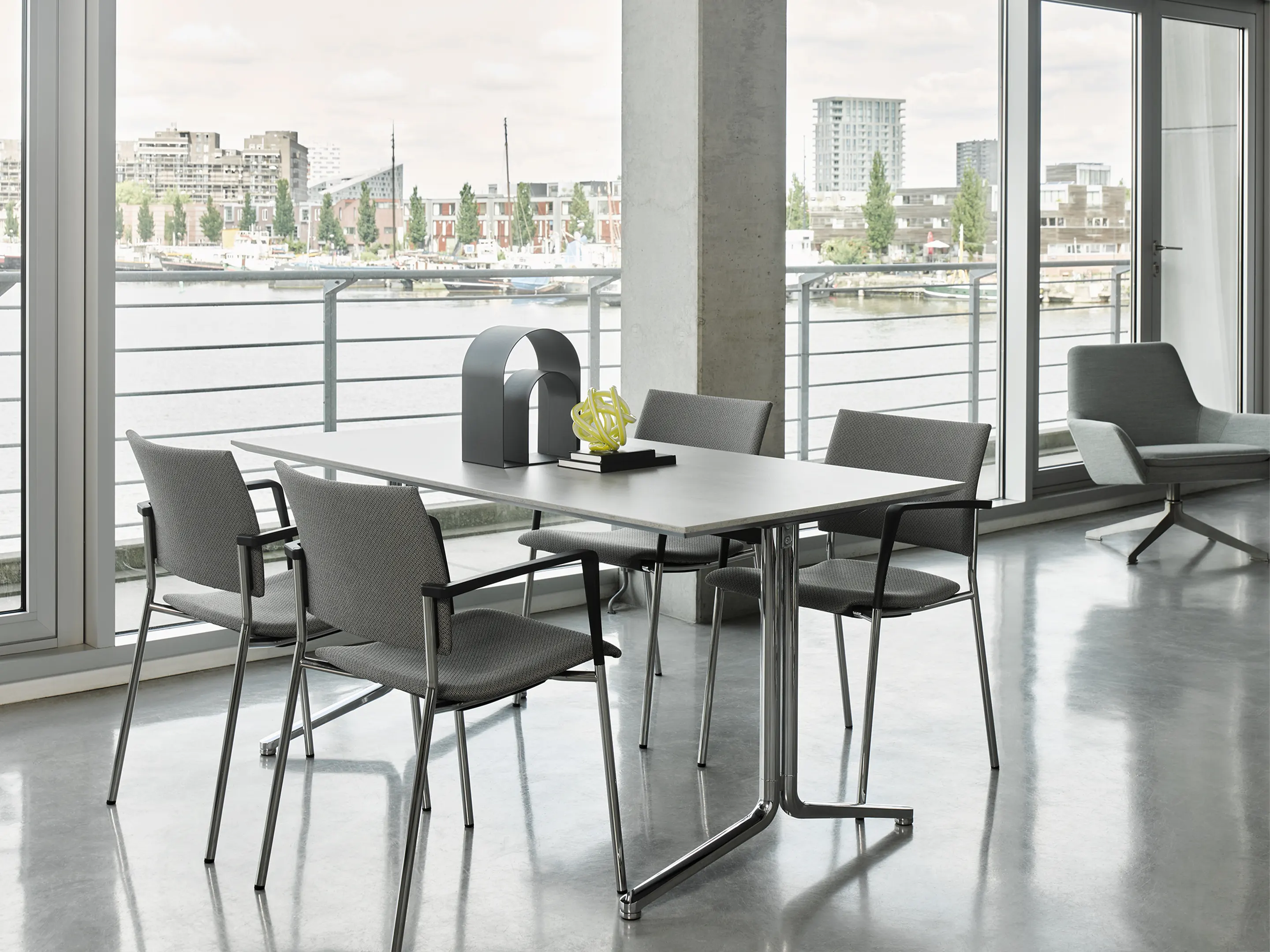 4-poots frame op kunststof glijders met gestoffeerde zitting en netbespannen rug. Incl. armleggers. Stapelbaar tot 12 stuks op transportwagen en 8 stuks vrijstaand