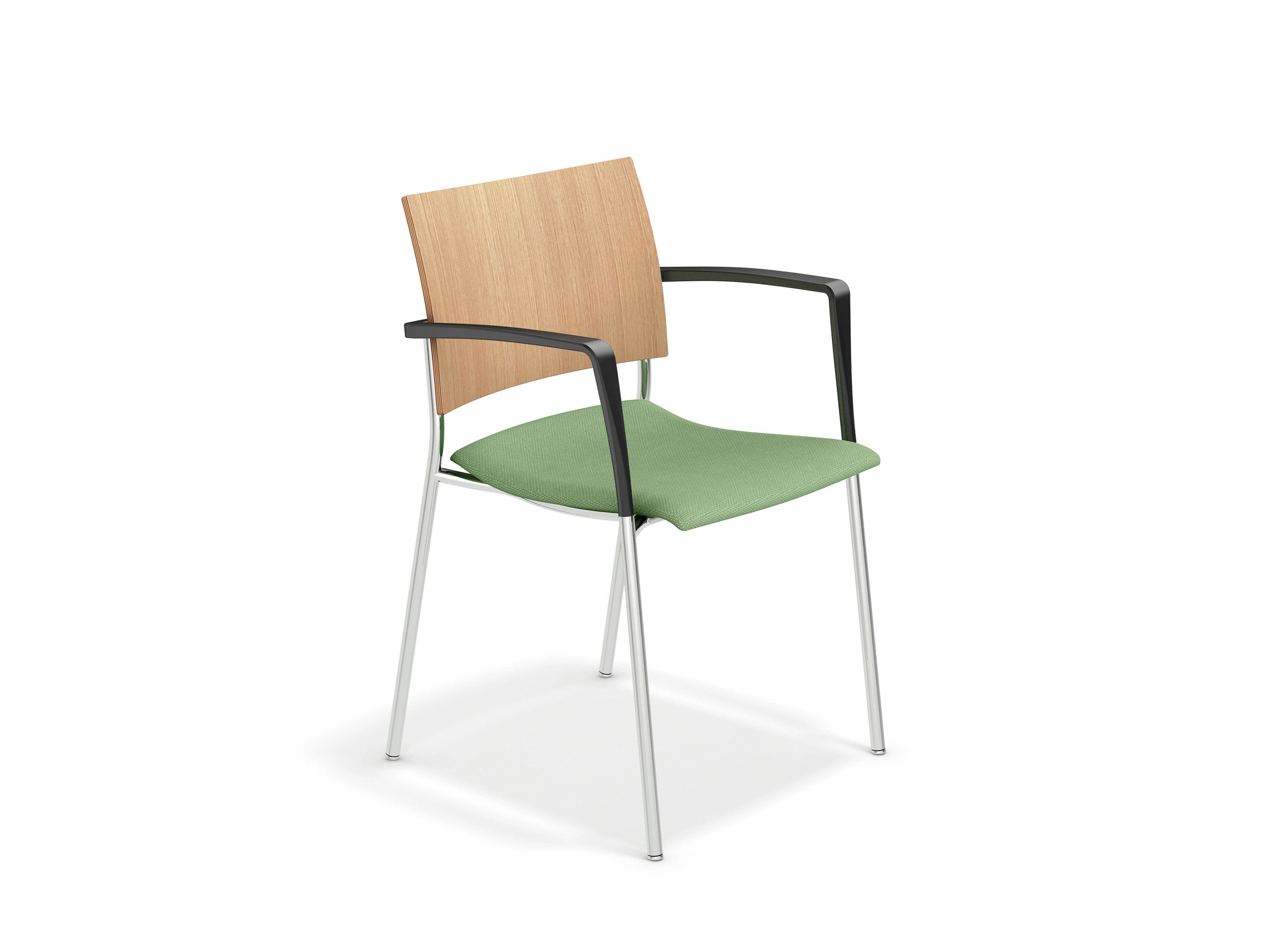4-poots frame op kunststof glijders met een gestoffeerde zitting en houten rug zonder stoffering. Inclusief armleggers. Stapelbaar tot 12 stuks op transportwagen en 8 stuks vrijstaand.