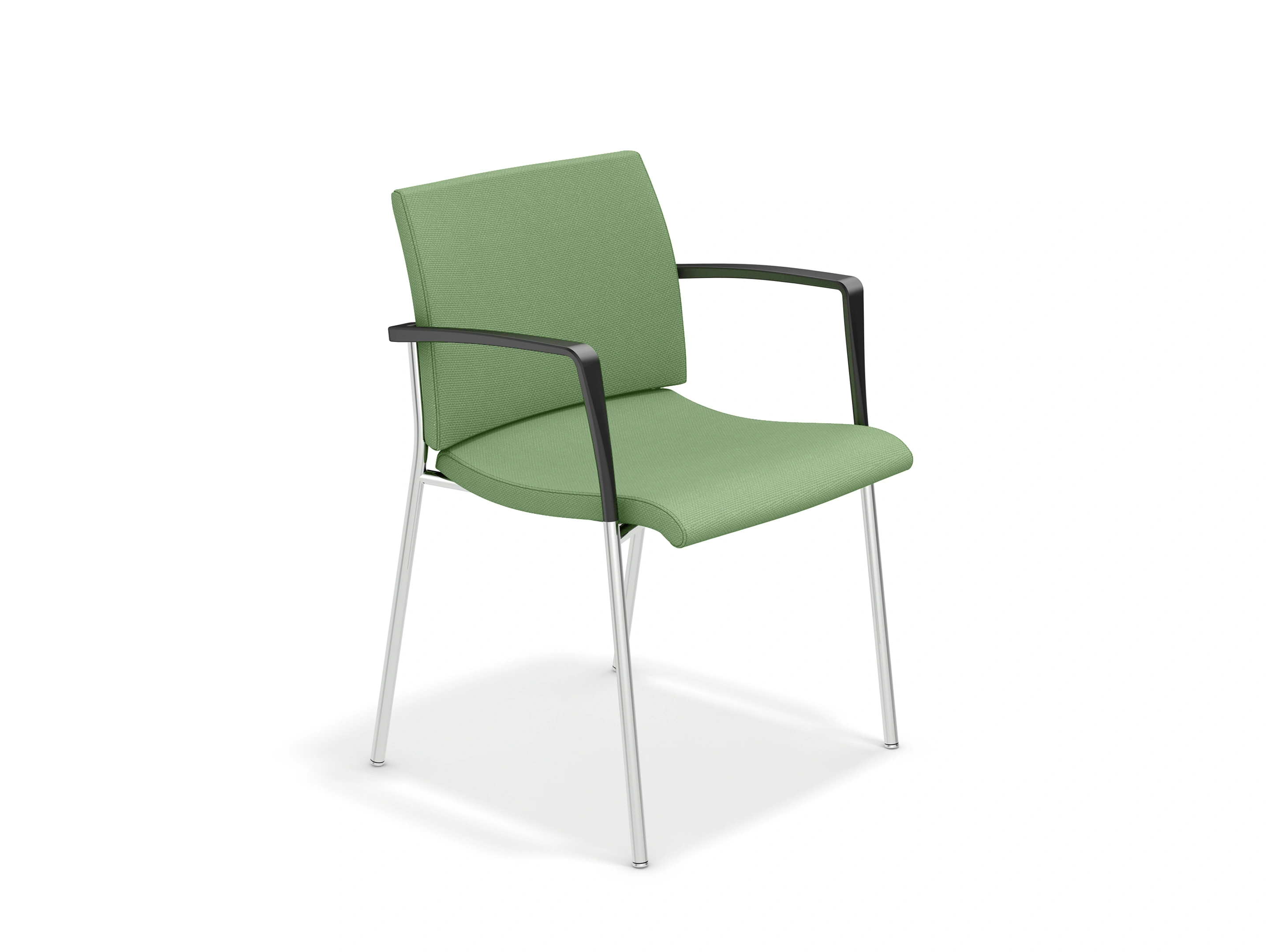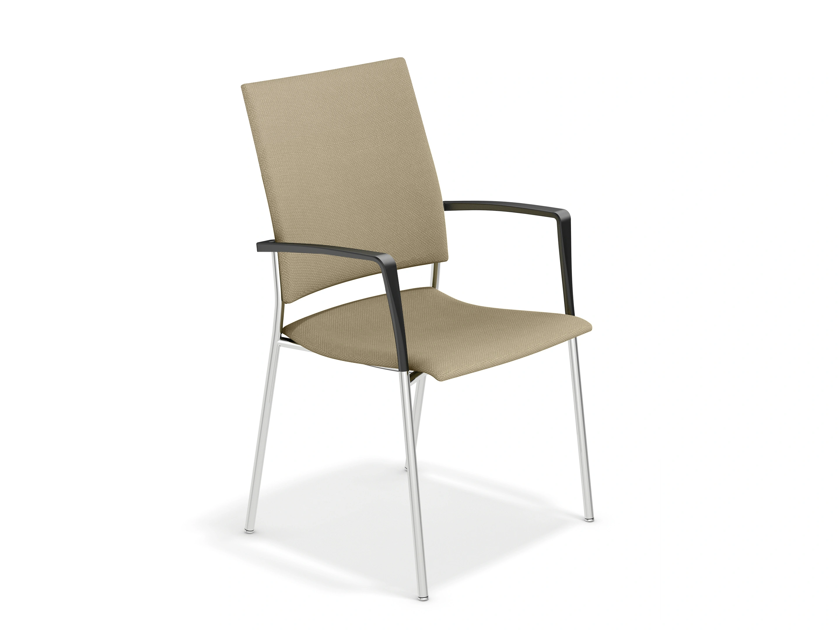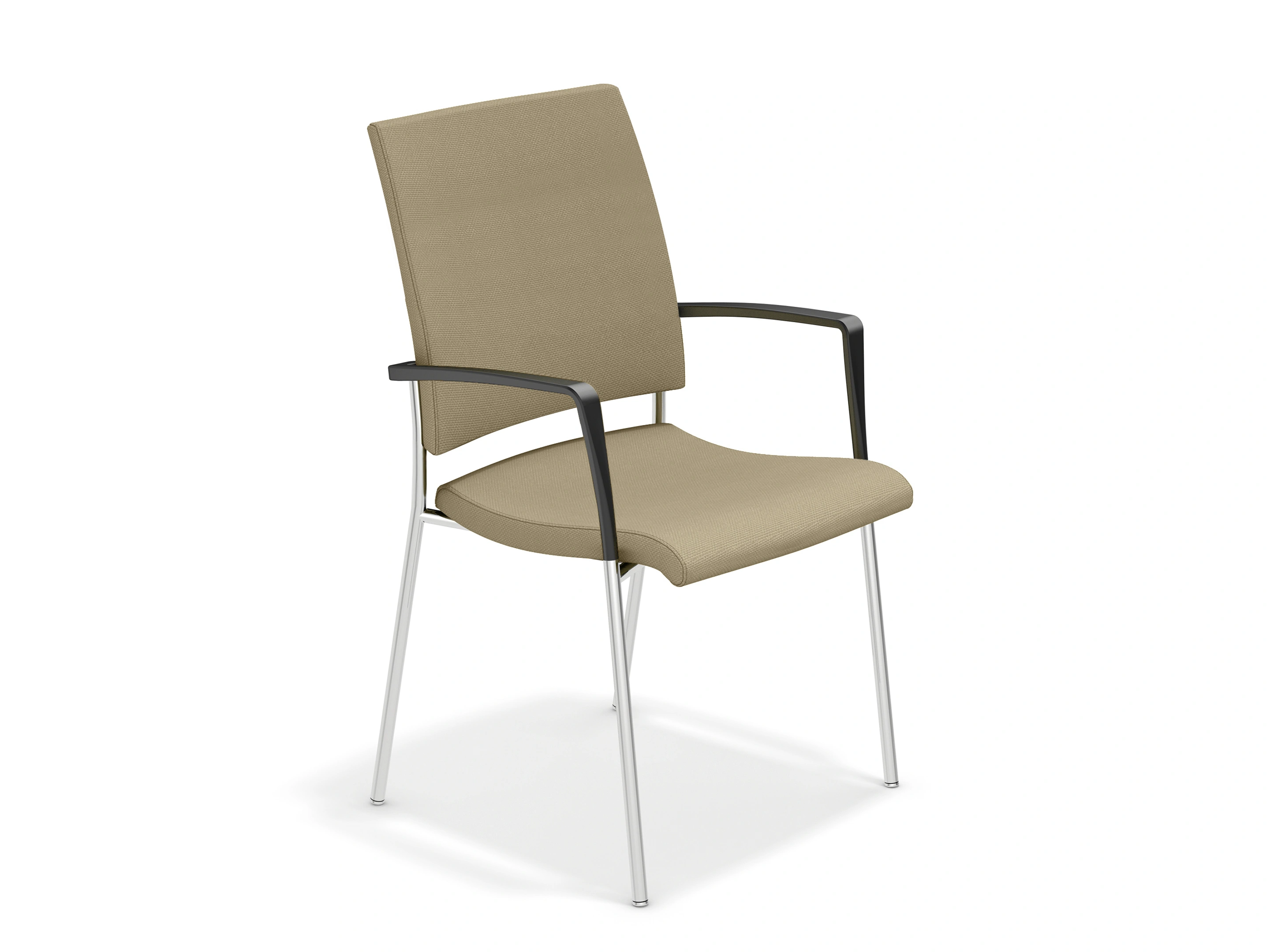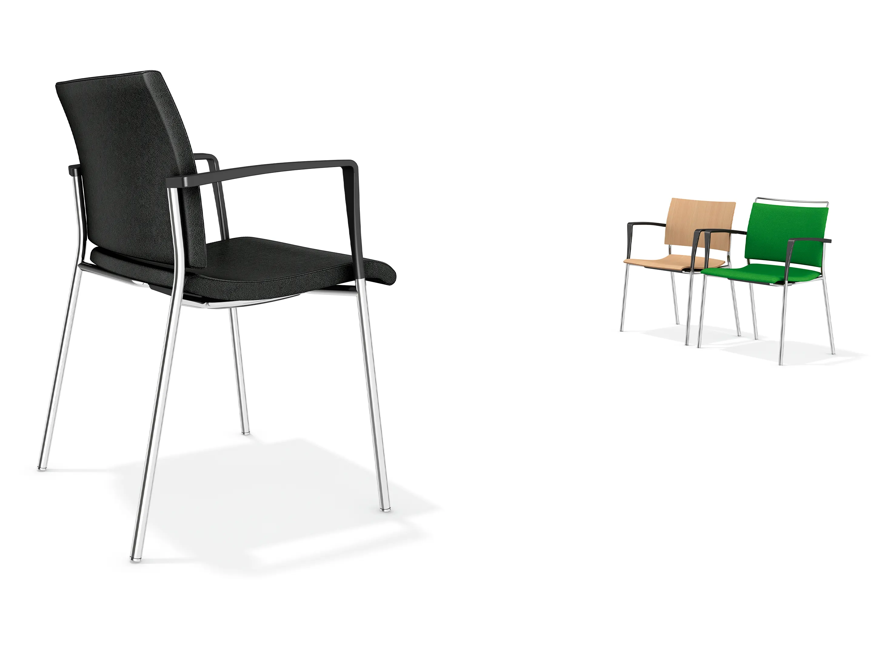 4-poots frame op kunststof glijders met een volledig gestoffeerde zitting en lage rug. Inclusief armleggers. Stapelbaar tot 12 stuks.