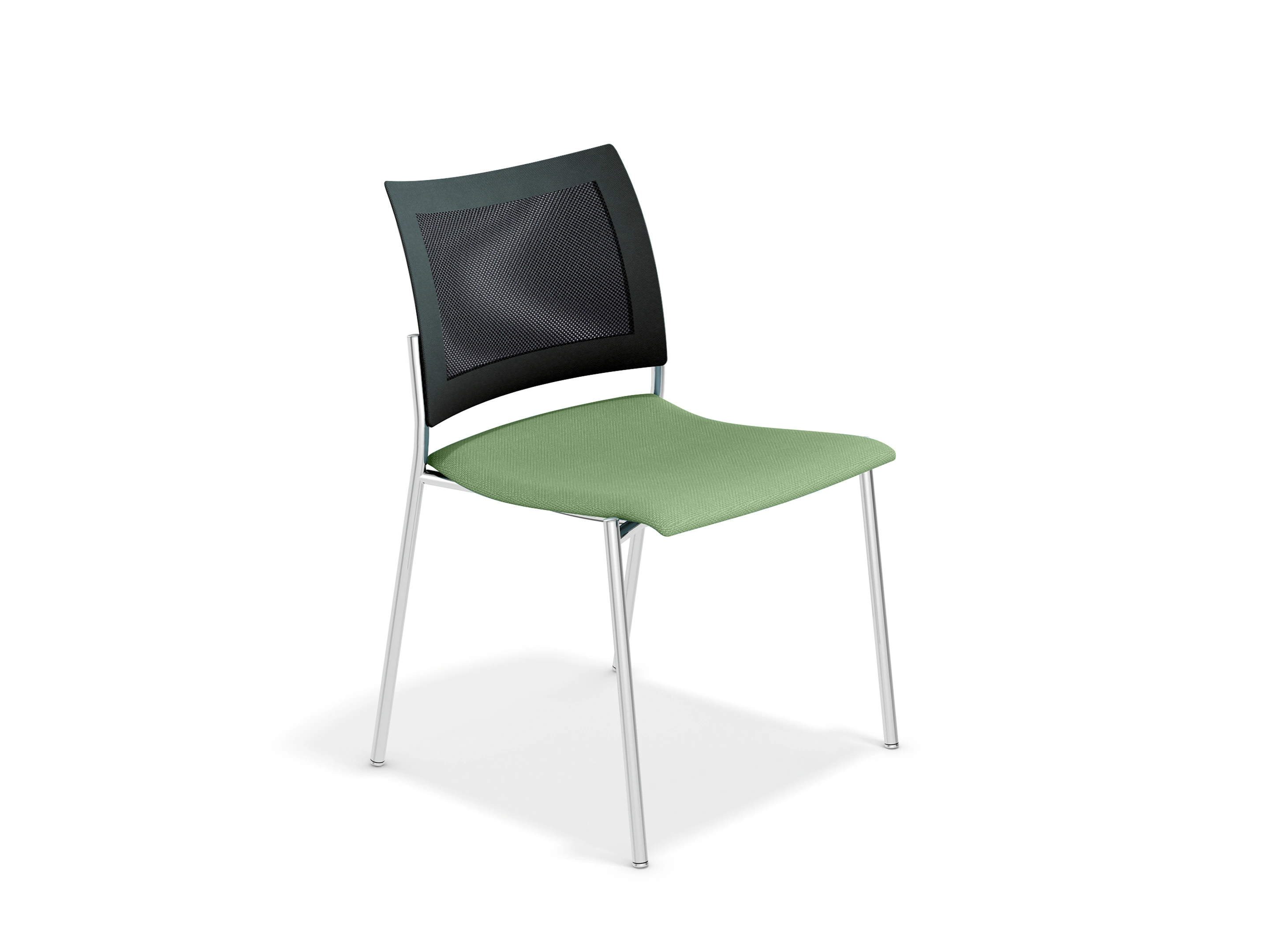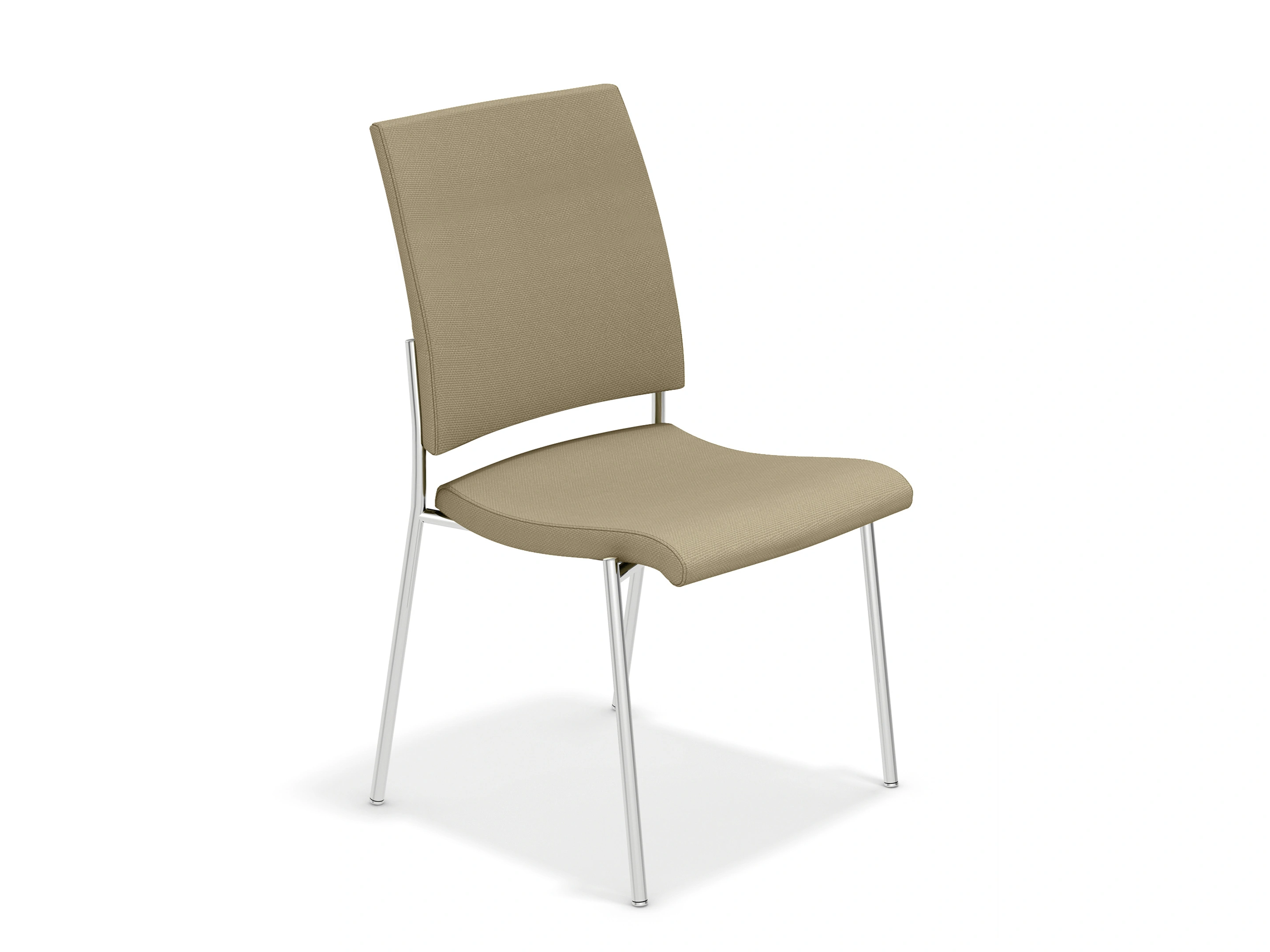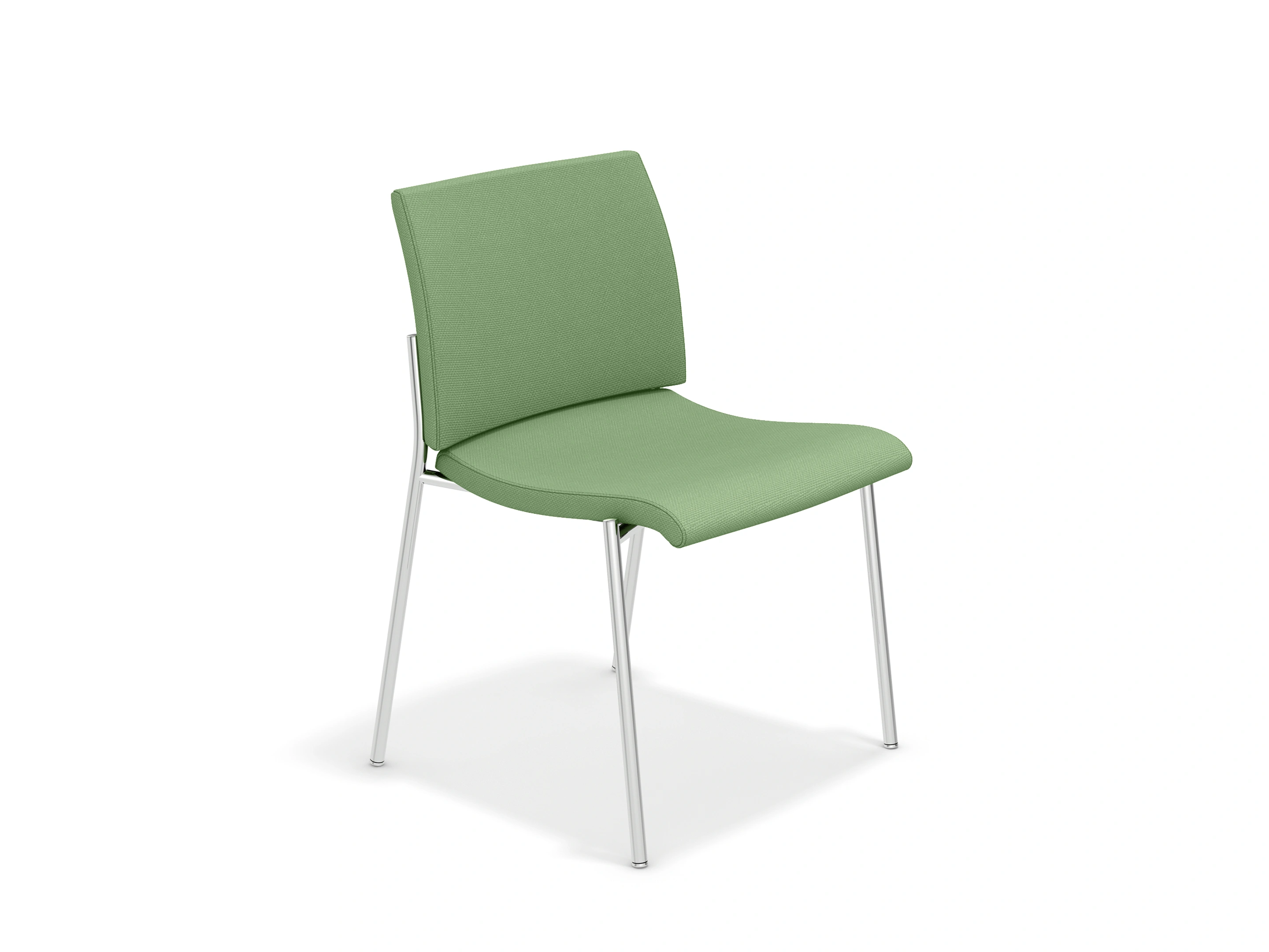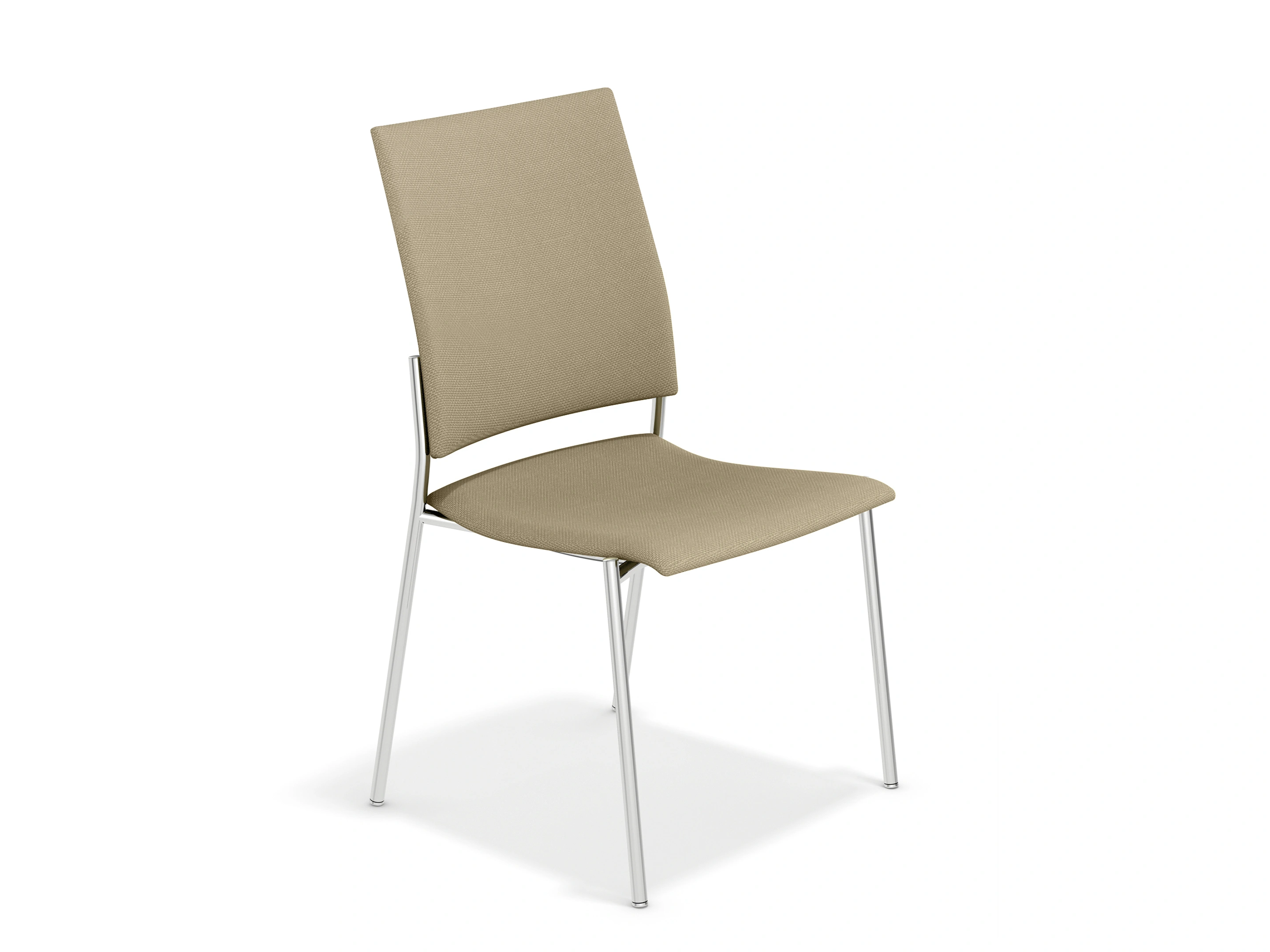 4-poots frame op kunststof glijders met een volledig gestoffeerde zitting en lage rug. Exclusief armleggers. Stapelbaar tot 12 stuks.