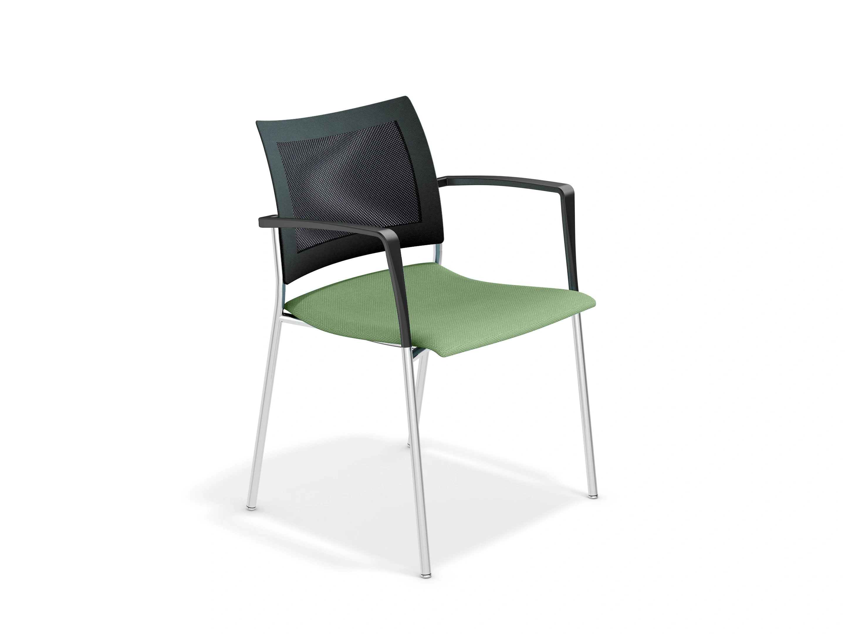 4-poots frame op kunststof glijders met een volledig gestoffeerde zitting en lage rug in Deluxe uitvoering. Inclusief armleggers. Stapelbaar tot 12 stuks.