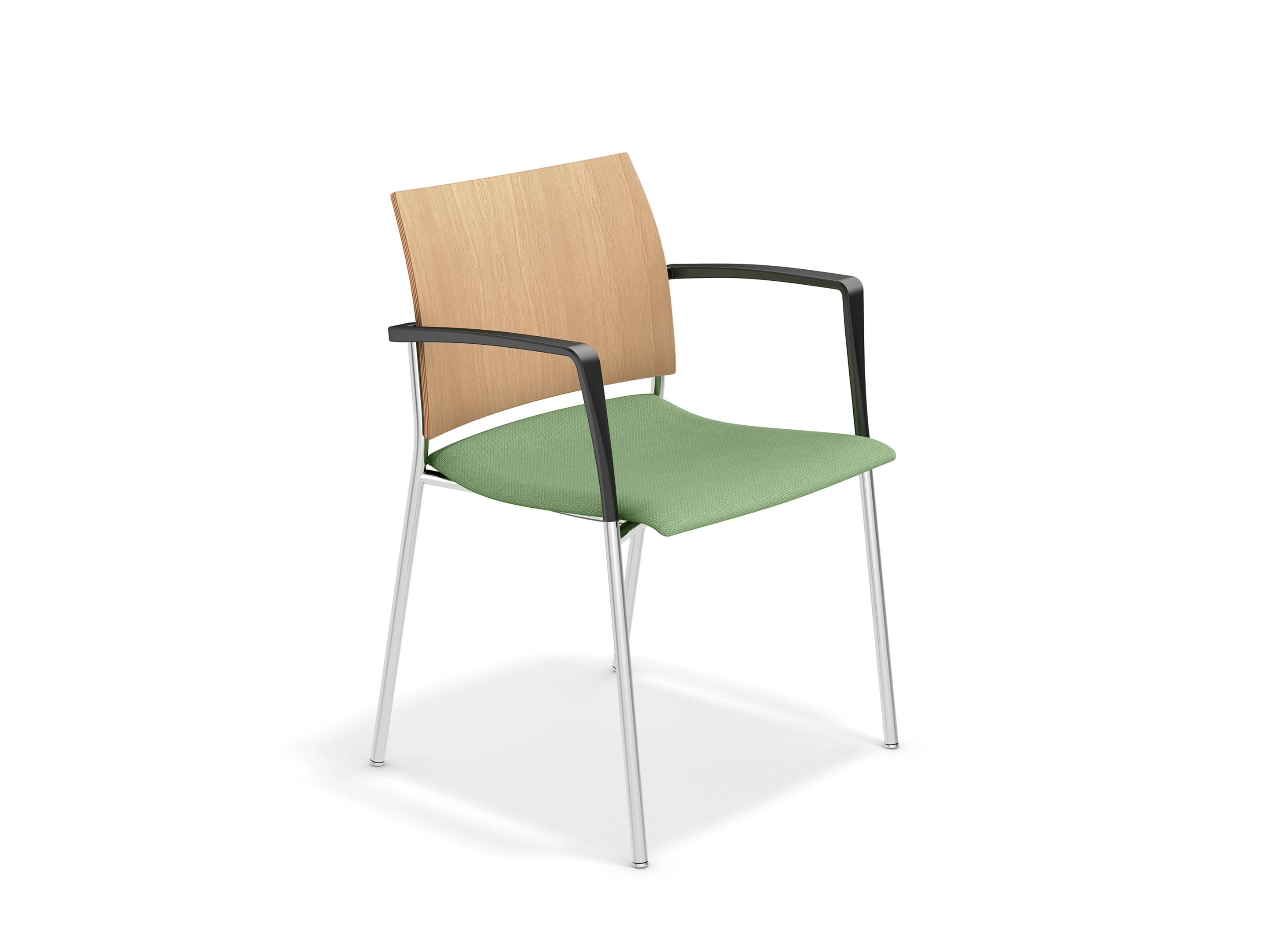 4-poots frame op kunststof glijders met een gestoffeerde zitting en houten lage rug zonder stoffering. Inclusief armleggers. Stapelbaar tot 12 stuks.