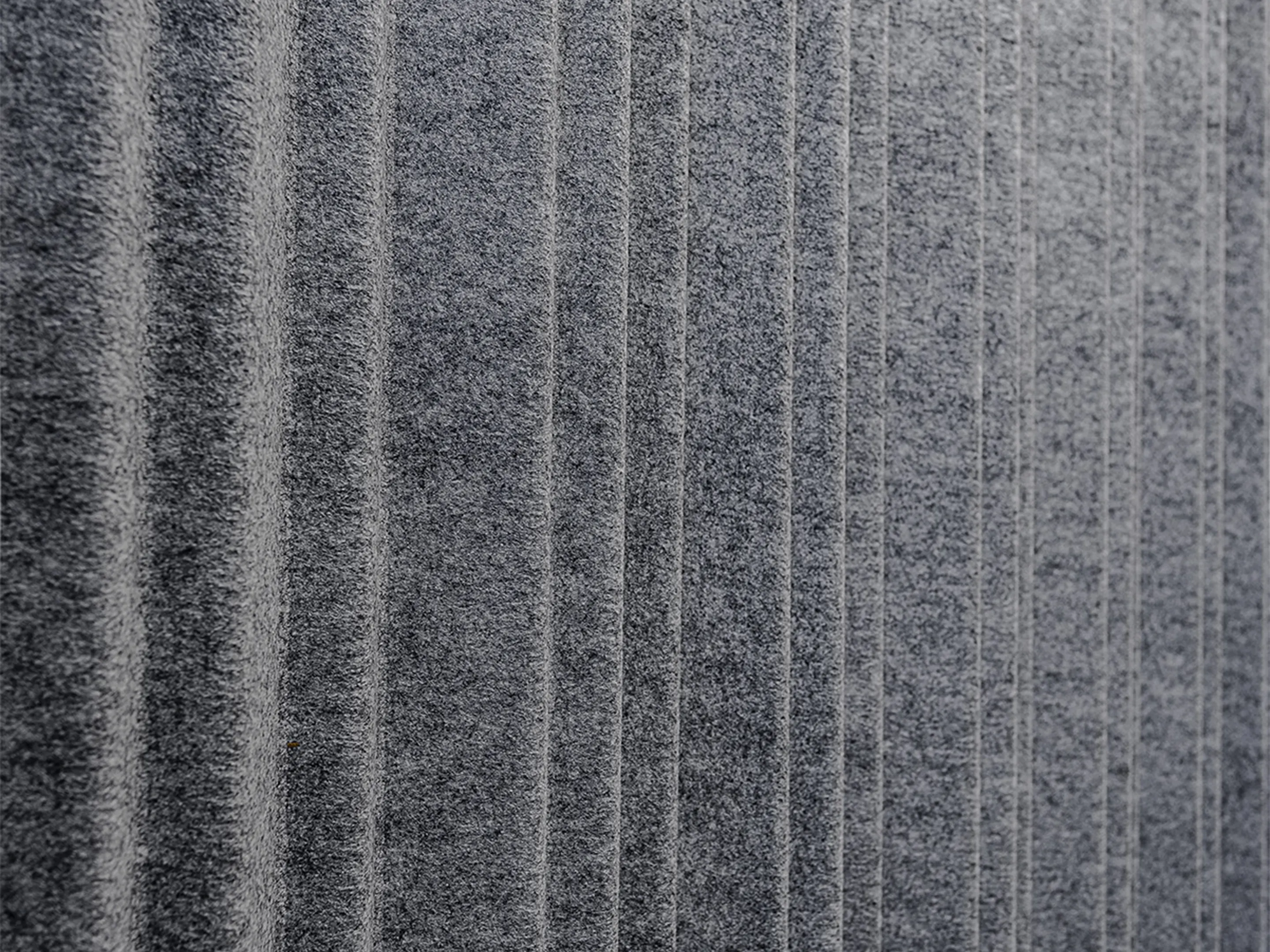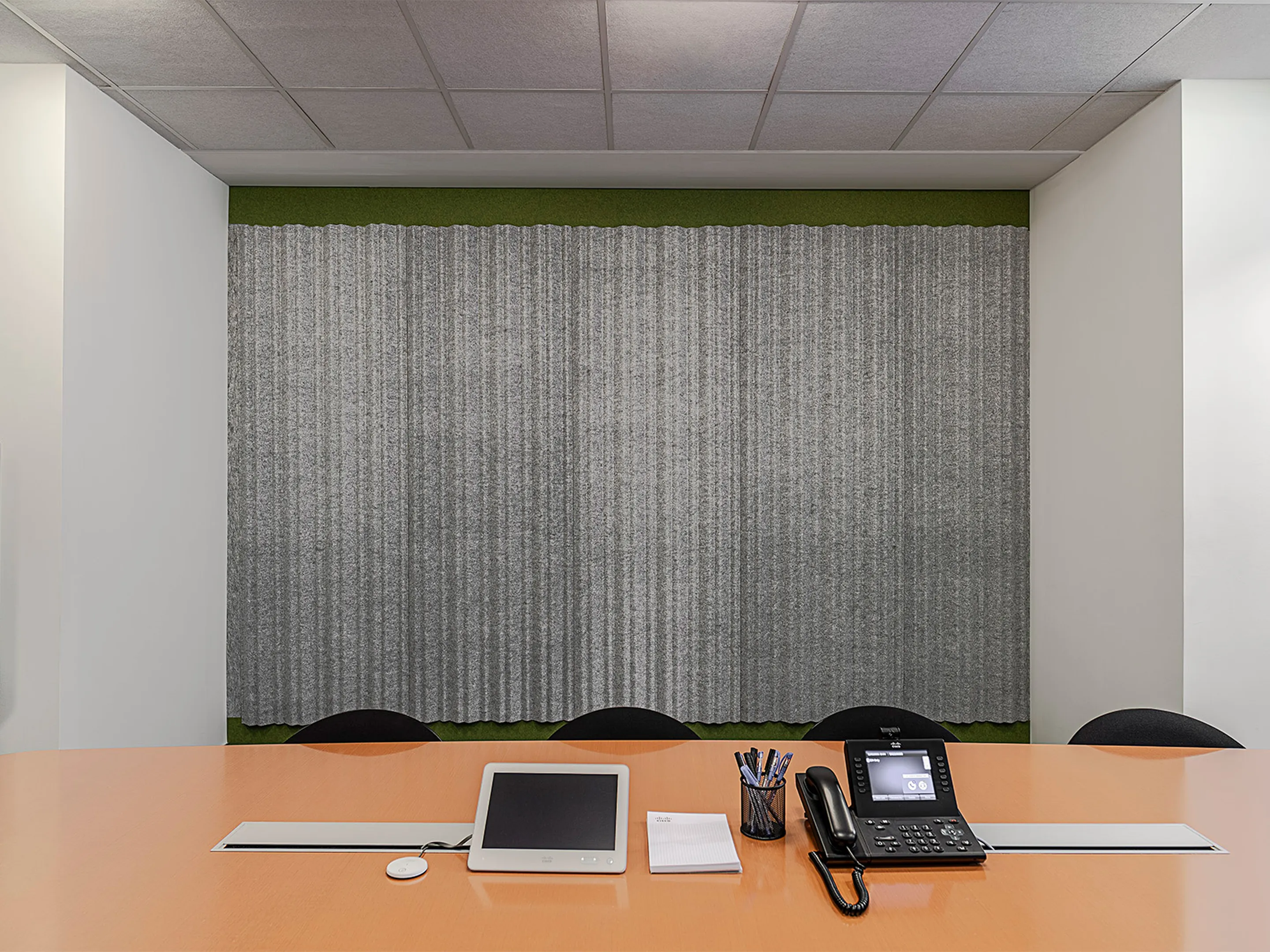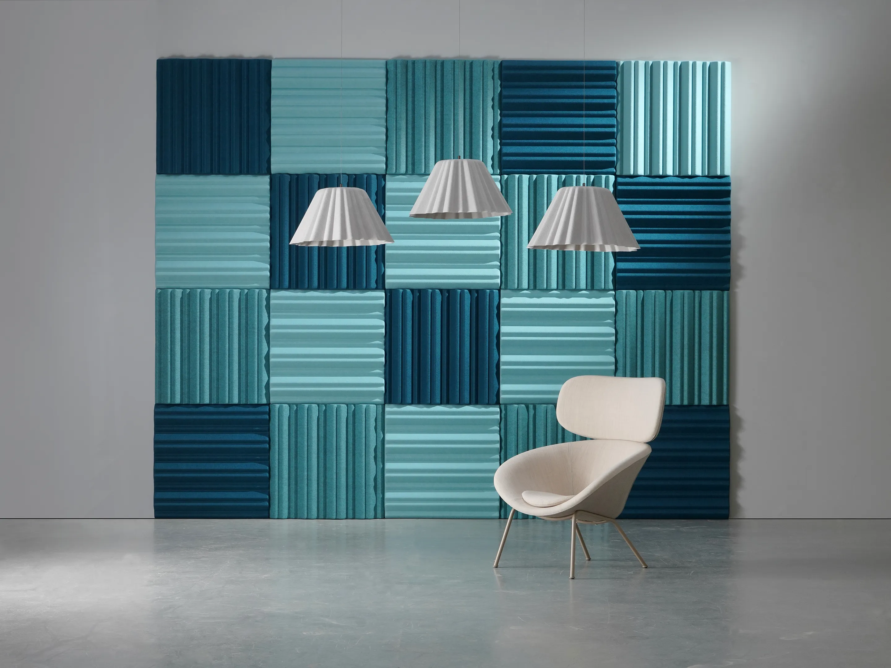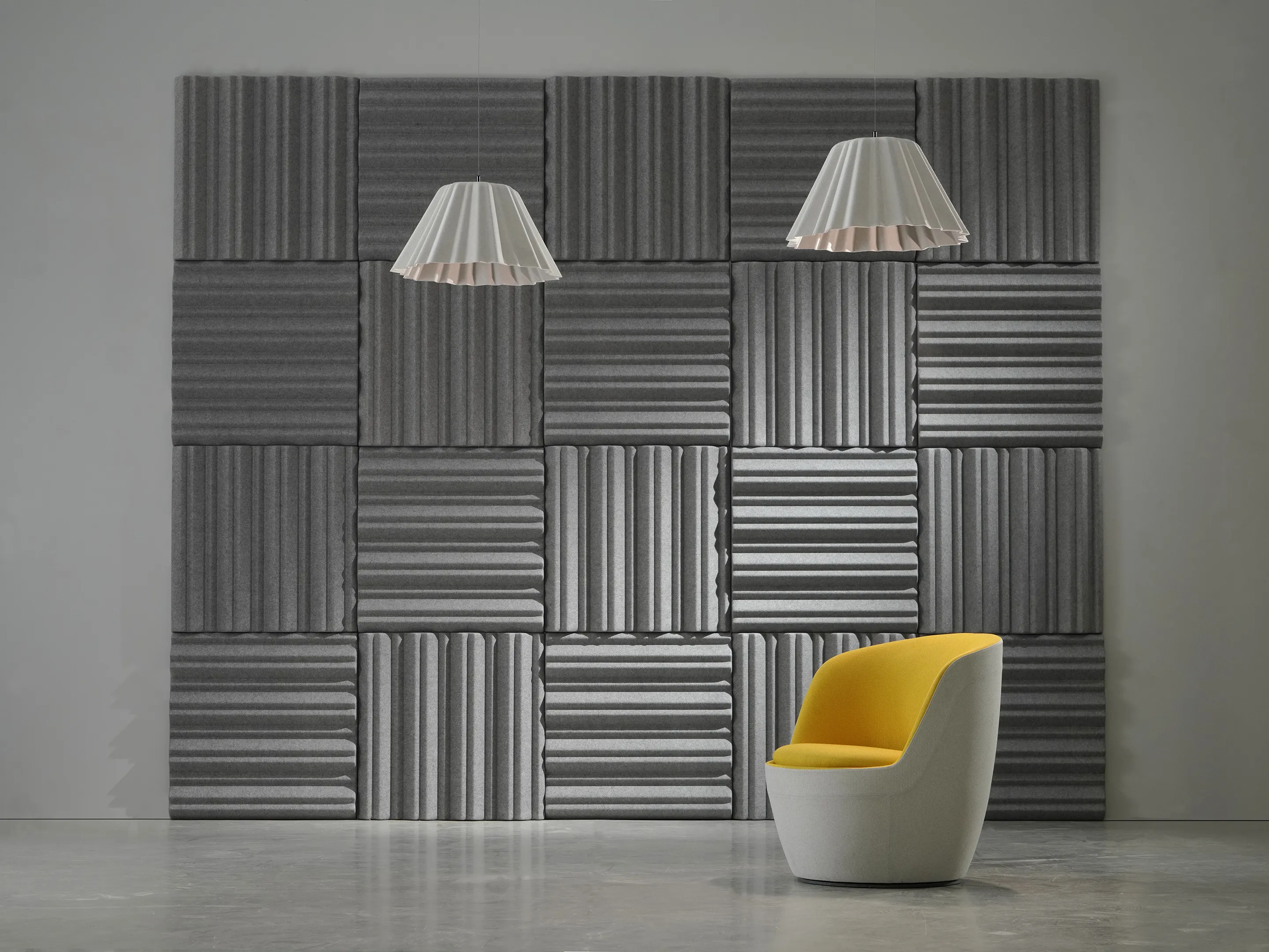 Rechthoekig en gerafeld akoestisch paneel zonder vlakke achterwand met een NRC Waarde van 0,55. Bevestiging d.m.v. klittenbandprofiel. Geschikt voor bevestiging aan een wand. Inclusief schroeven, pluggen en installatiehandleiding.