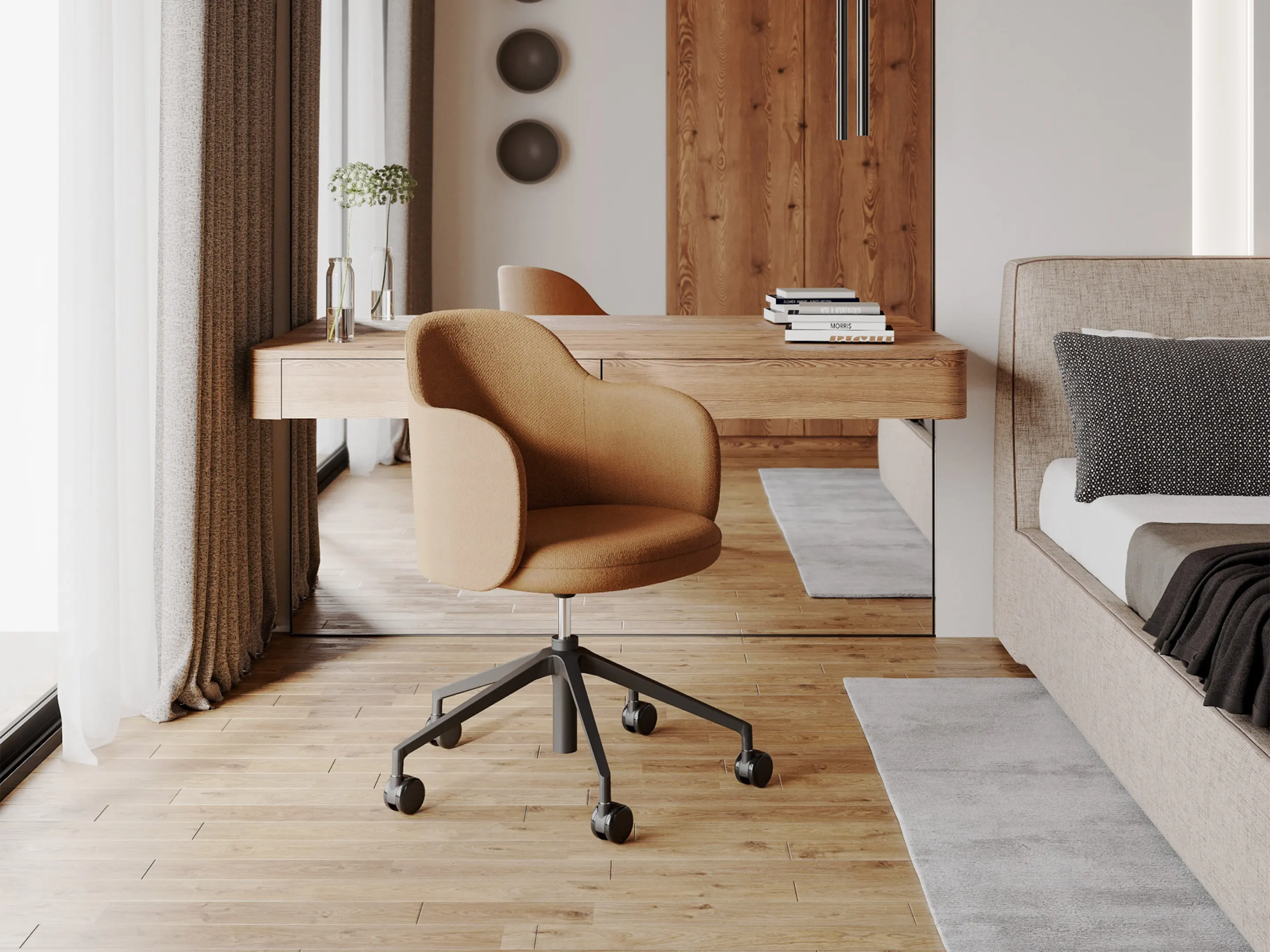 Volledig gestoffeerde kuip, draaibaar, hoogte instelbaar, 5-teens kruis, verrijdbaar