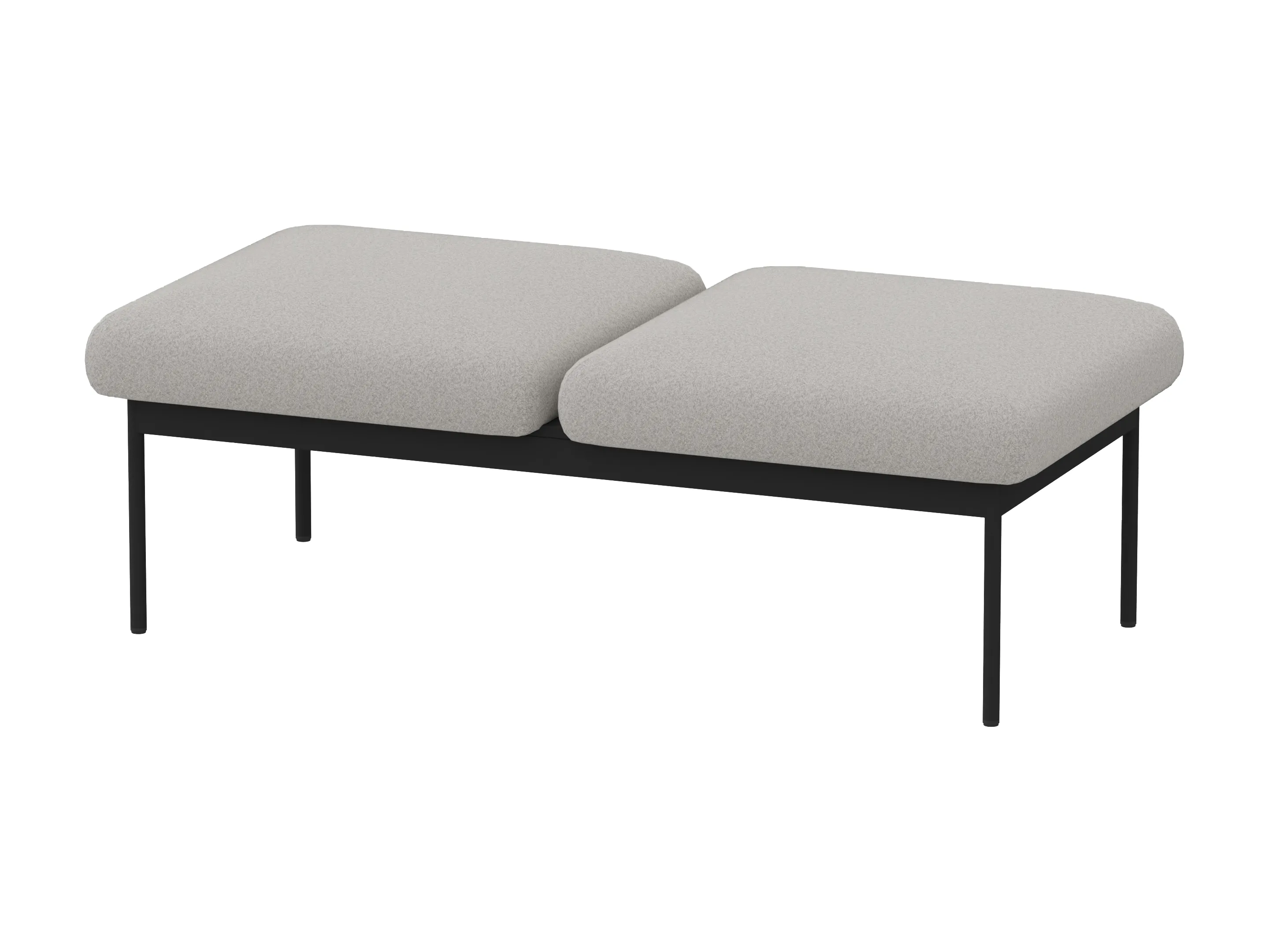 Volledig gestoffeerde 2-zits bank met een apart zitkussen per zitplaats op een 4-poots frame. Excl. armleuningen en rugleuning. Afmeting: 1320 x 650 x 470mm (B x D x H).