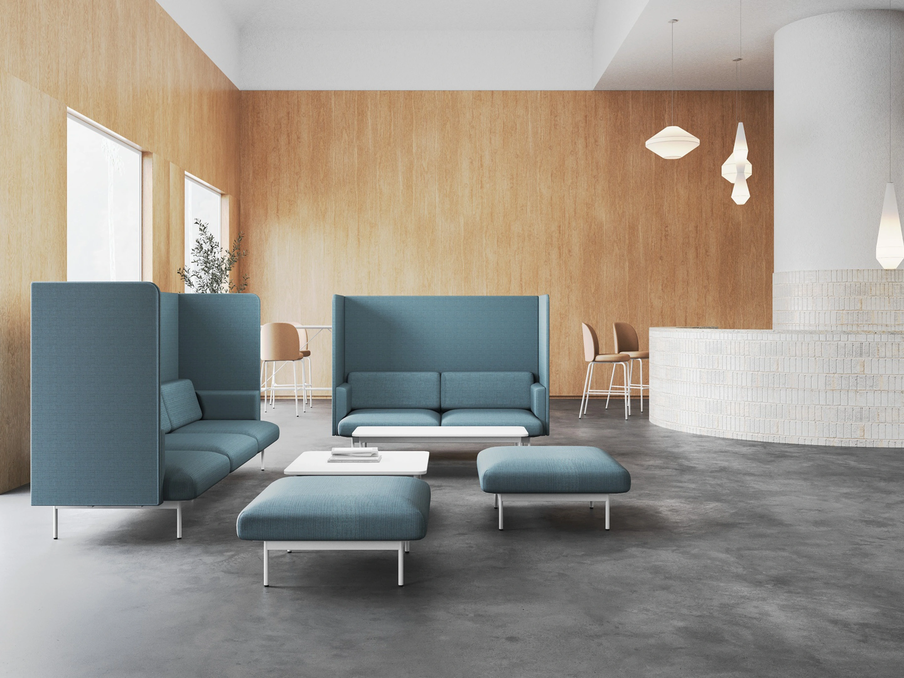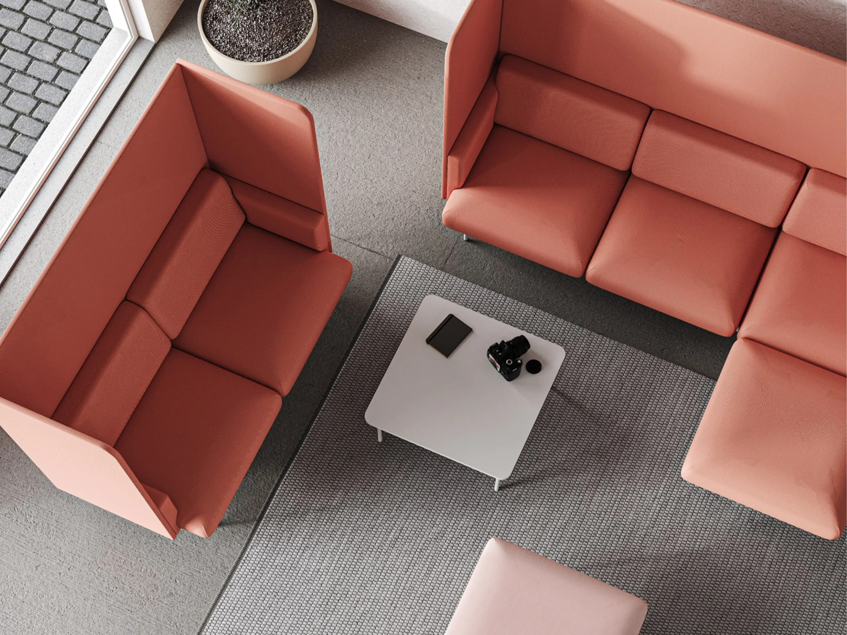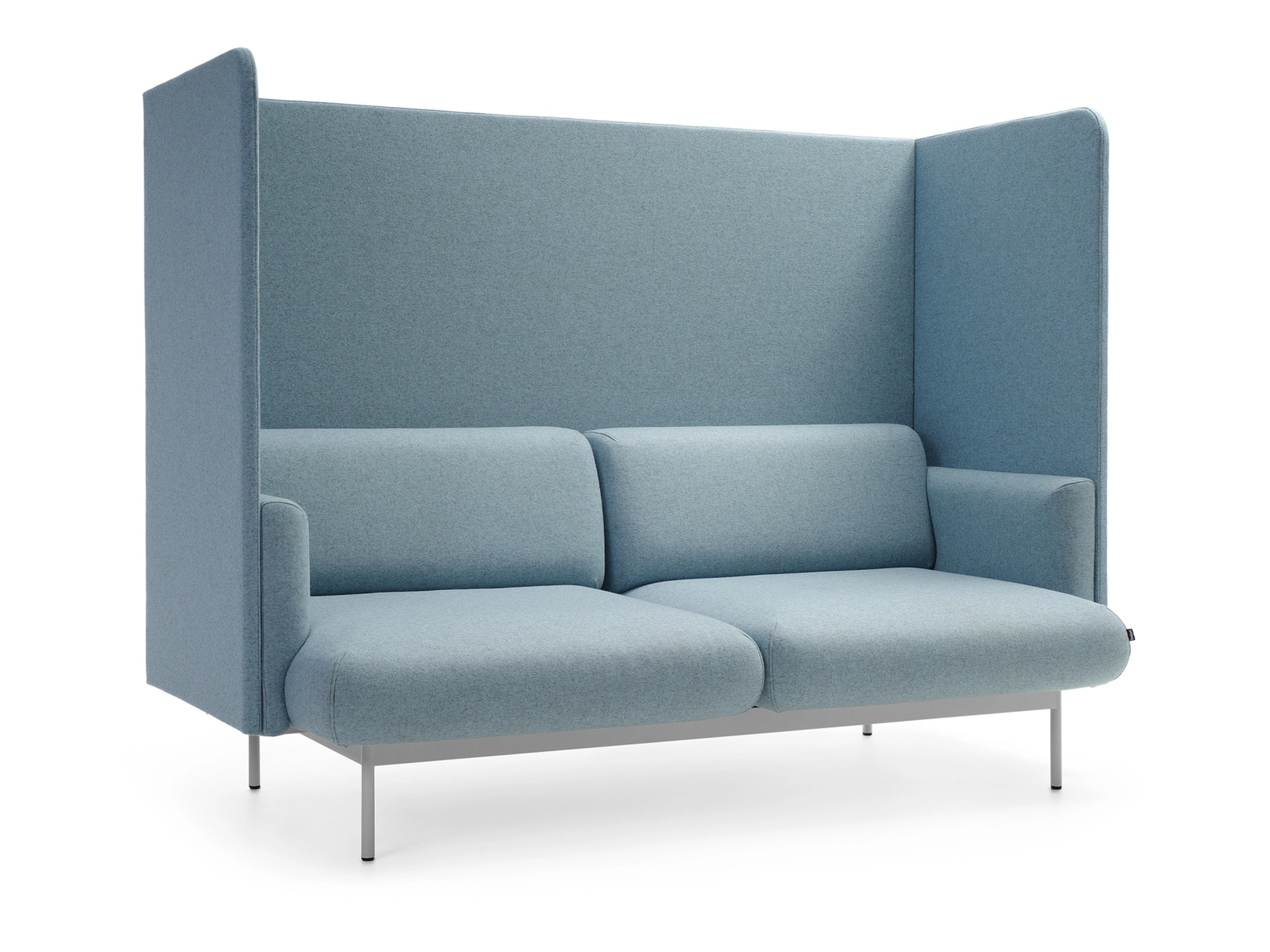 Volledig gestoffeerde 2-zits bank met een akoestische privacy ombouw met een hoogte van 1395mm, 1835mm breed, 4-poots frame, incl. armleuningen en rugleuning