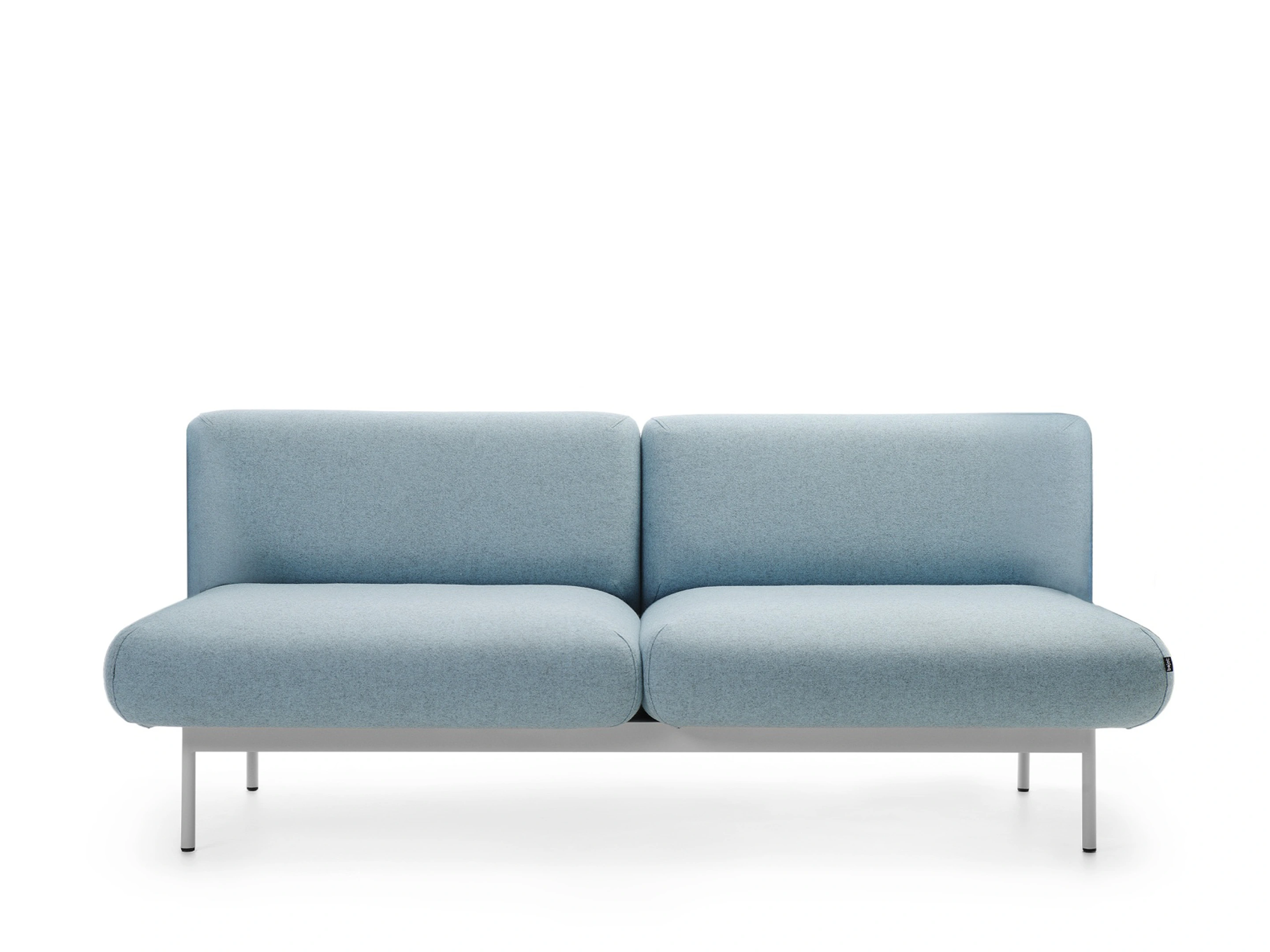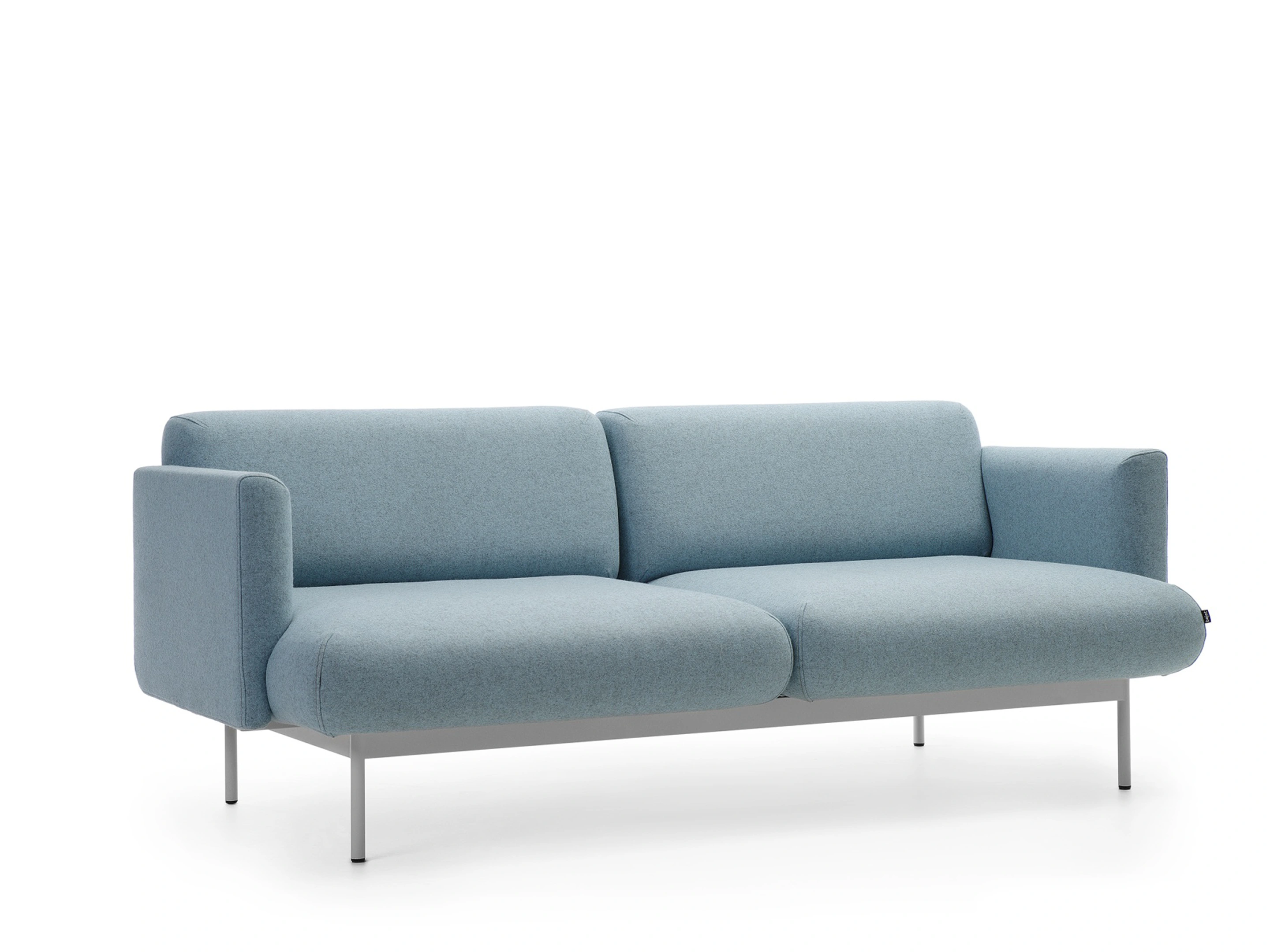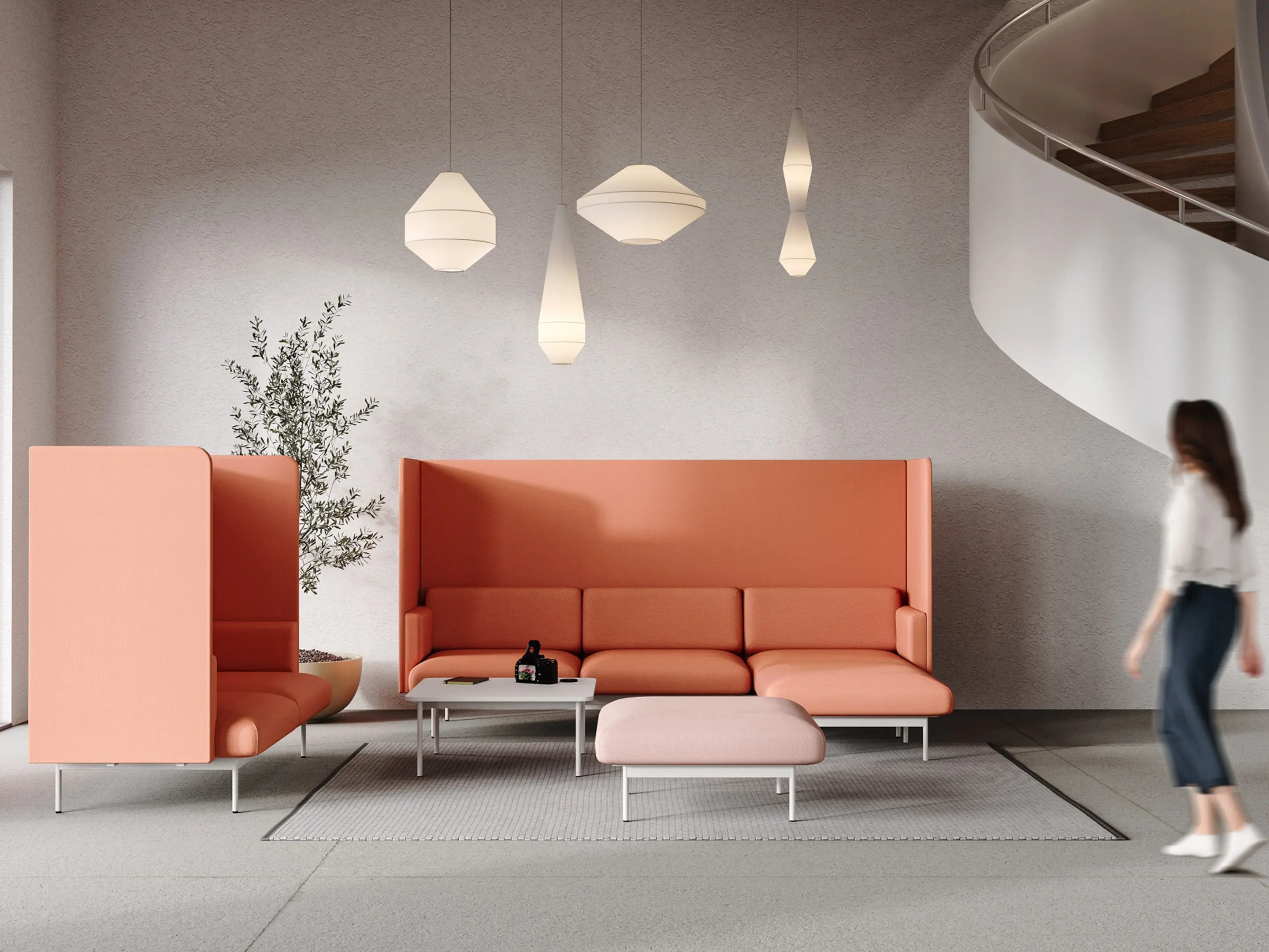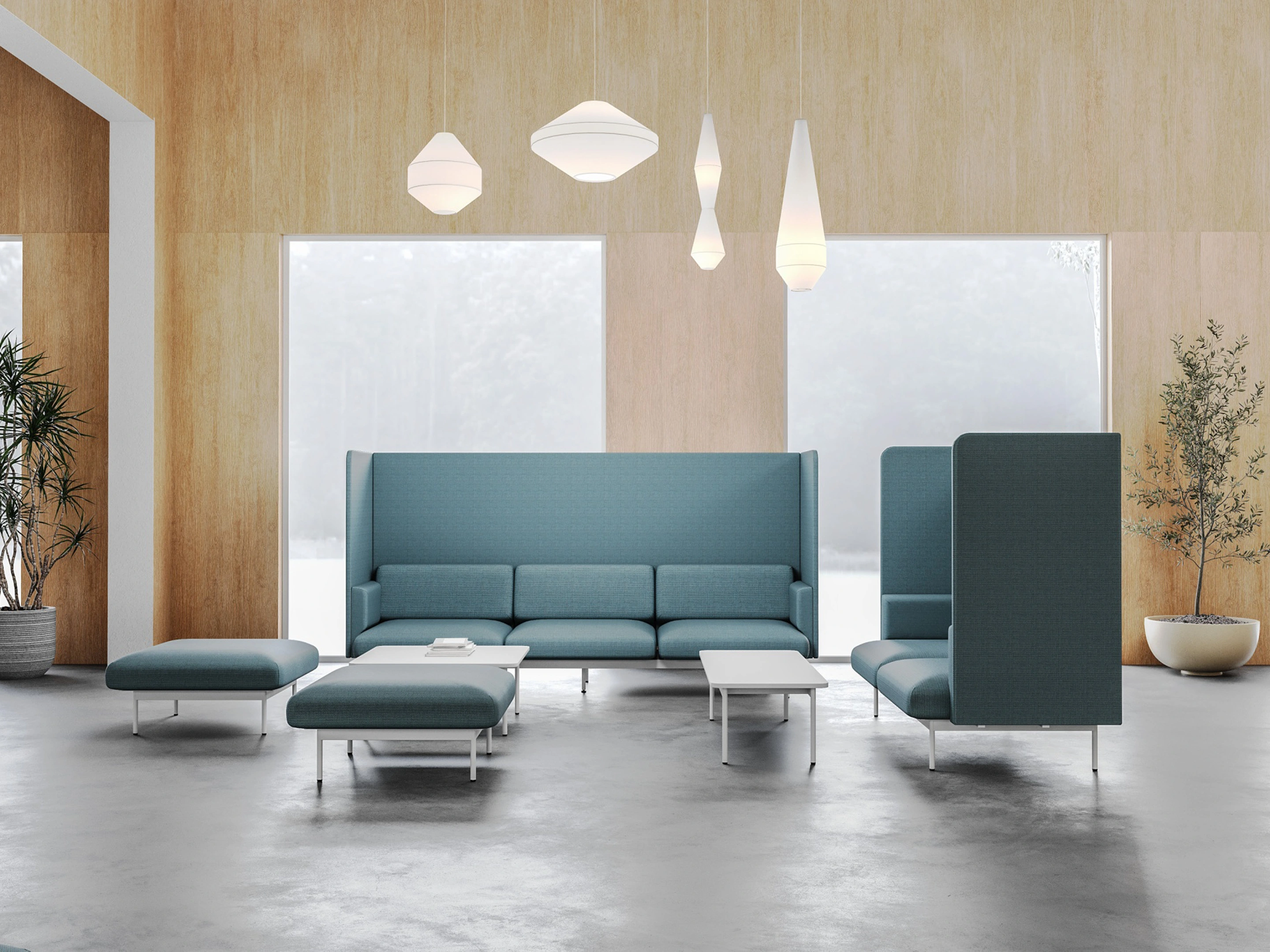 Volledig gestoffeerde 2-zits bank met een akoestische privacy ombouw met een hoogte van 1395mm, 1835mm breed, 4-poots frame, incl. armleuningen en rugleuning