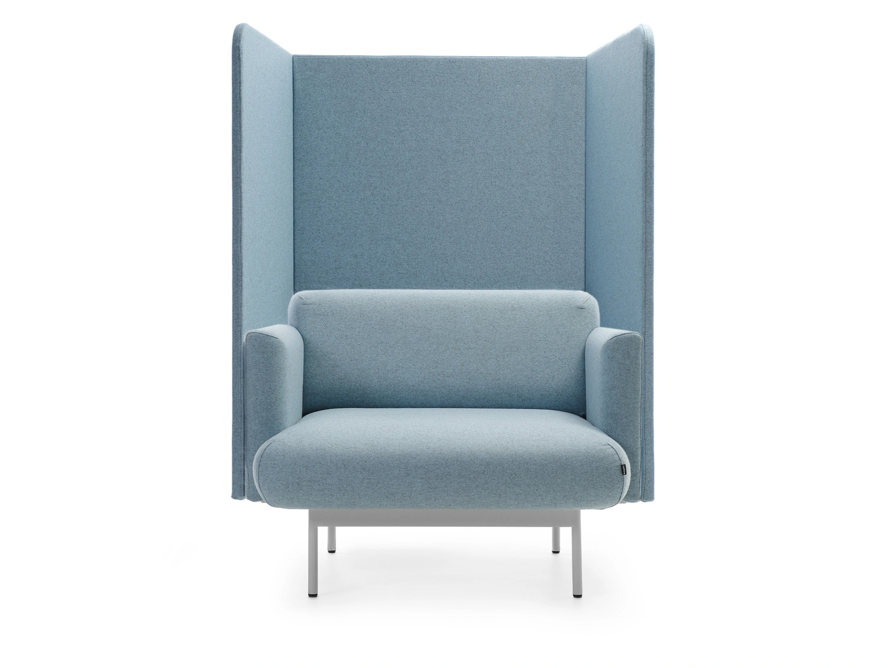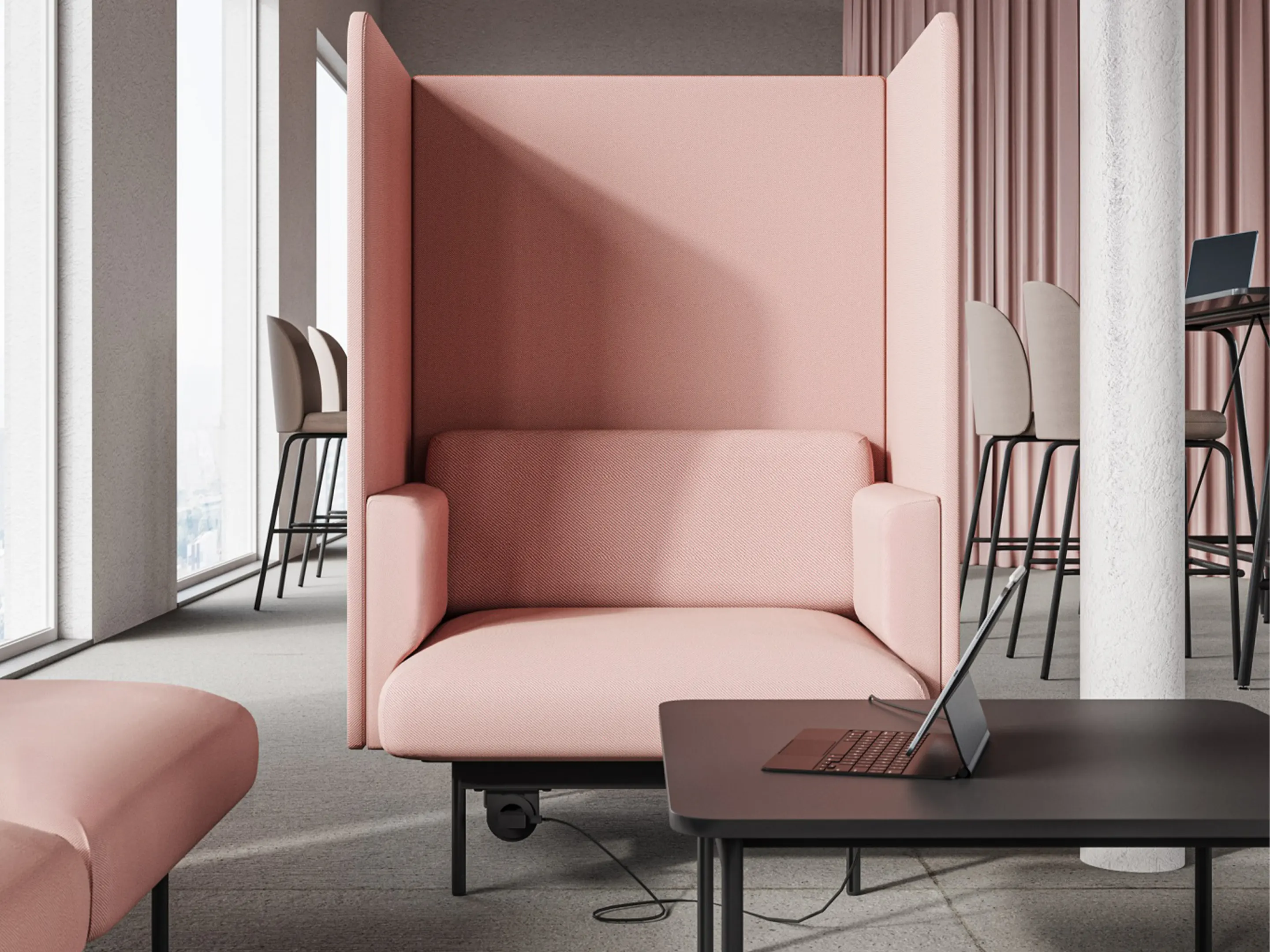 Volledig gestoffeerde 1-zits bank met een akoestische privacy ombouw met een hoogte van 1395mm, 930mm breed, 4-poots frame, incl. armleuningen en rugleuning