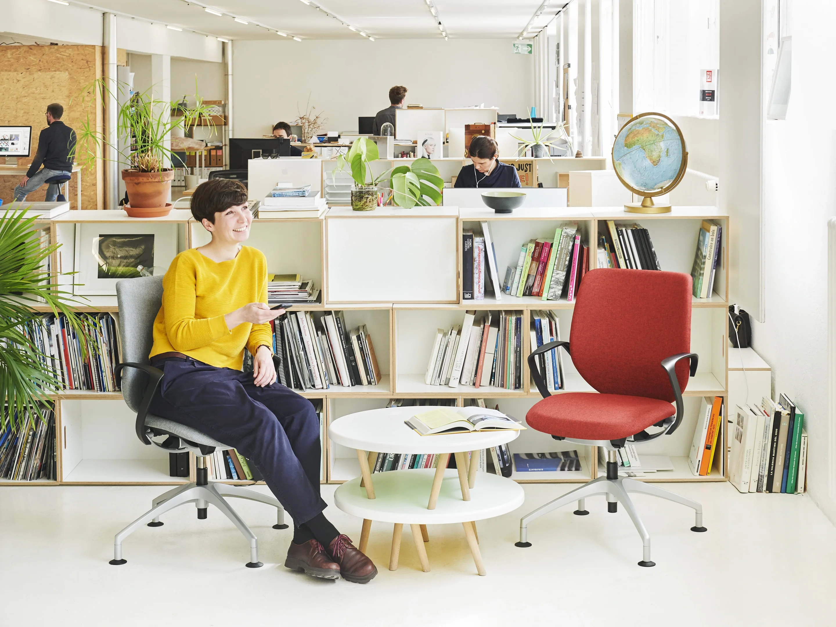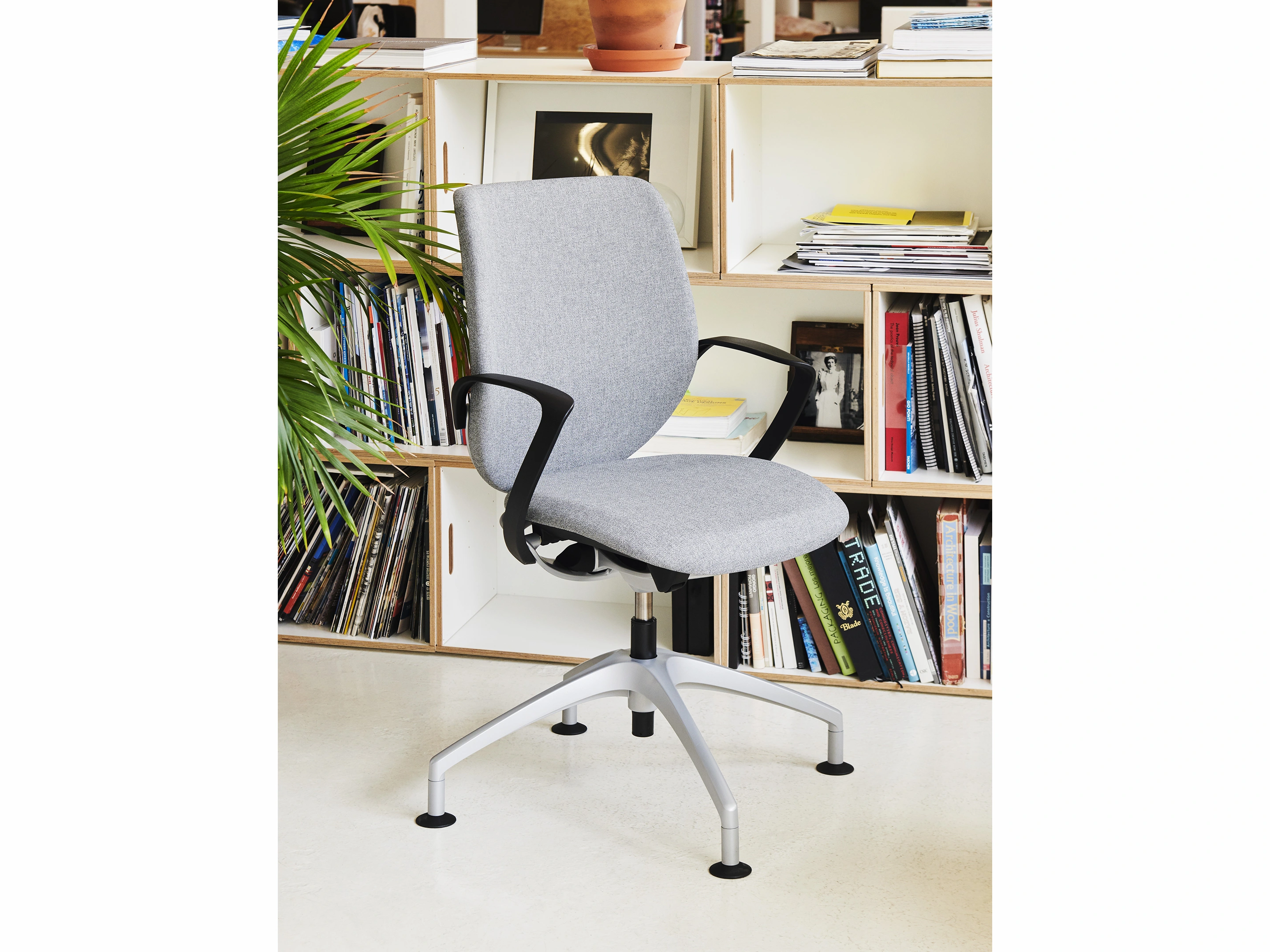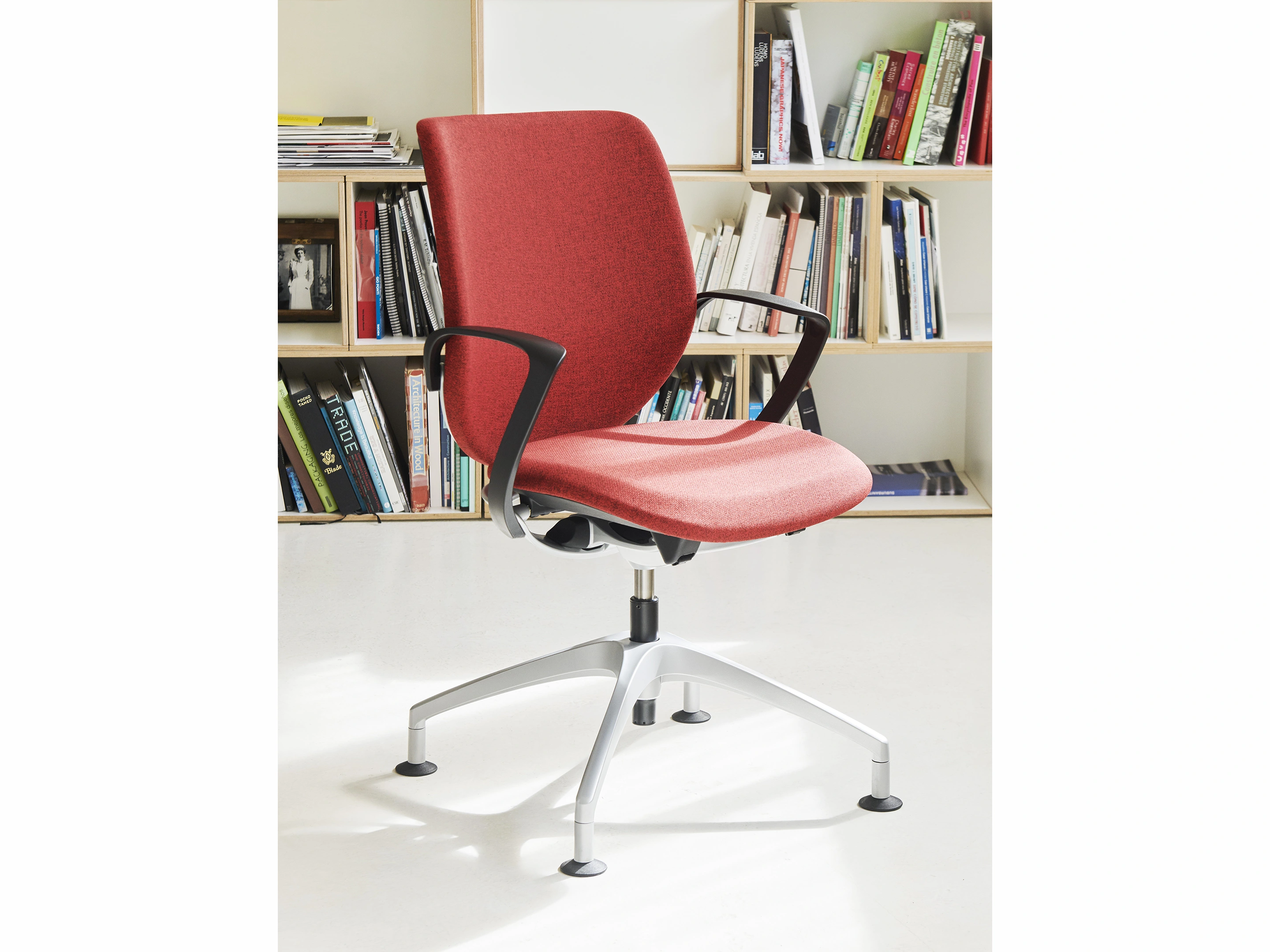 Vergaderstoel met gestoffeerde rugkussen, en het Balance Move synchroonmechaniek met volautomatische gewichtsaanpassing. Zitkussen met 2-zone zitprofiel. Standaard GEEN hoogteverstelling. Rugschaal (kunststof) is altijd zwart.