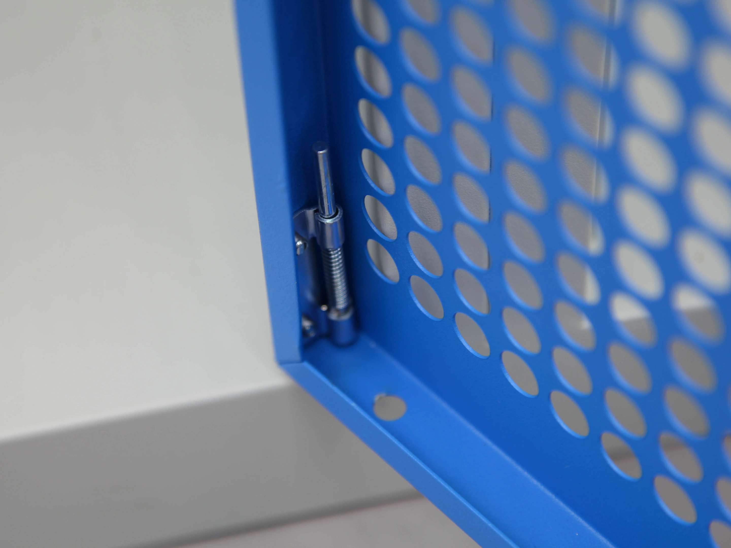 Type deuren: draaideur (gaas), type slot: valgrendelslot. Kleur romp: grijs (RAL7035), kleur deuren: blauw (RAL5010). Afmeting: 180x60x50 cm (HxBxD). Indeling: Legbord en kledingroede Aantal deuren: 2, aantal sleutels: geen.