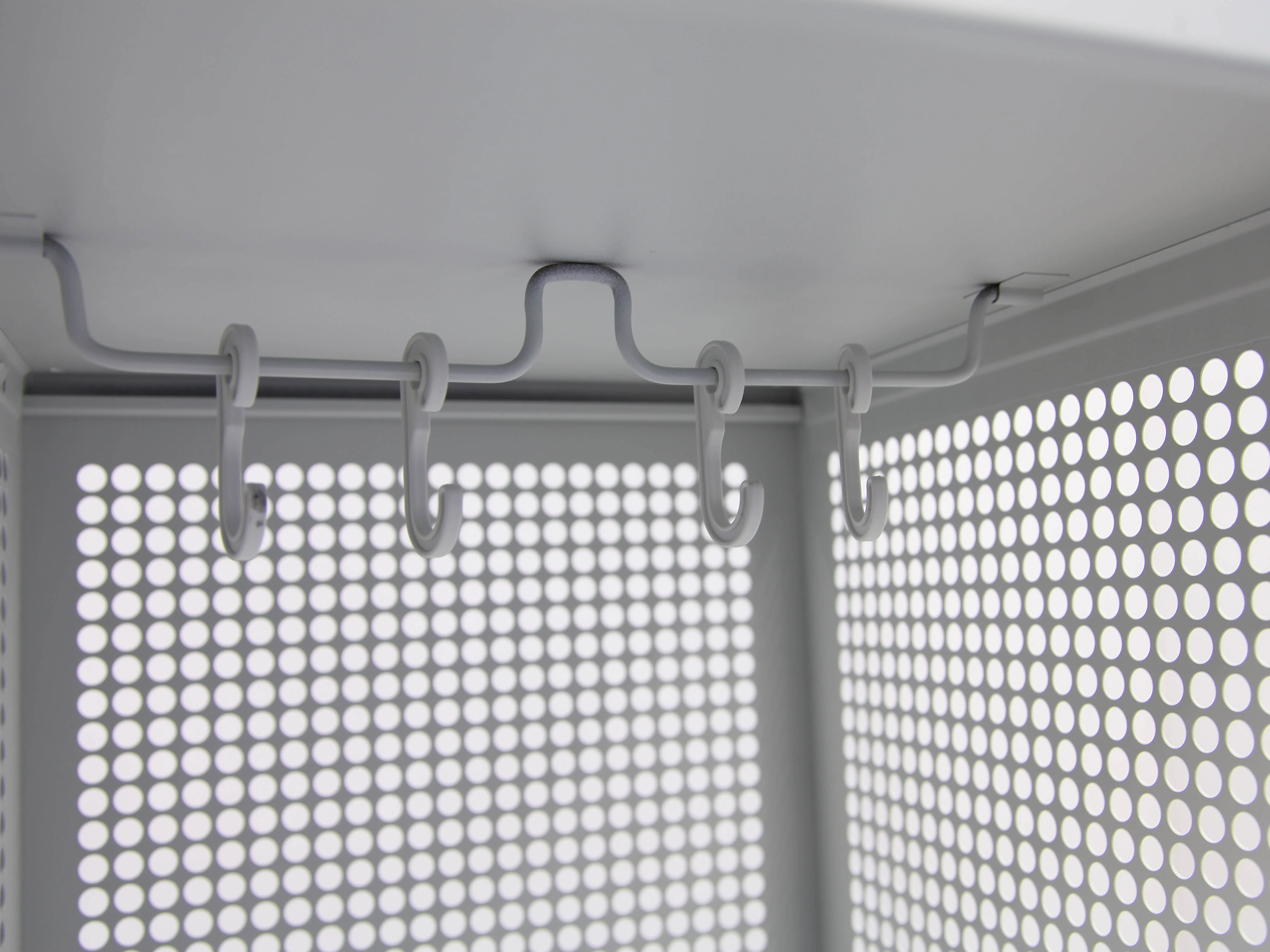 Type deuren: draaideur (gaas), type slot: cilinderslot. Kleur romp: grijs (RAL7035), kleur deuren: grijs (RAL7035). Afmeting: 180x60x50 cm (HxBxD). Indeling: Legbord en kledingroede Aantal deuren: 2, aantal sleutels: 2.