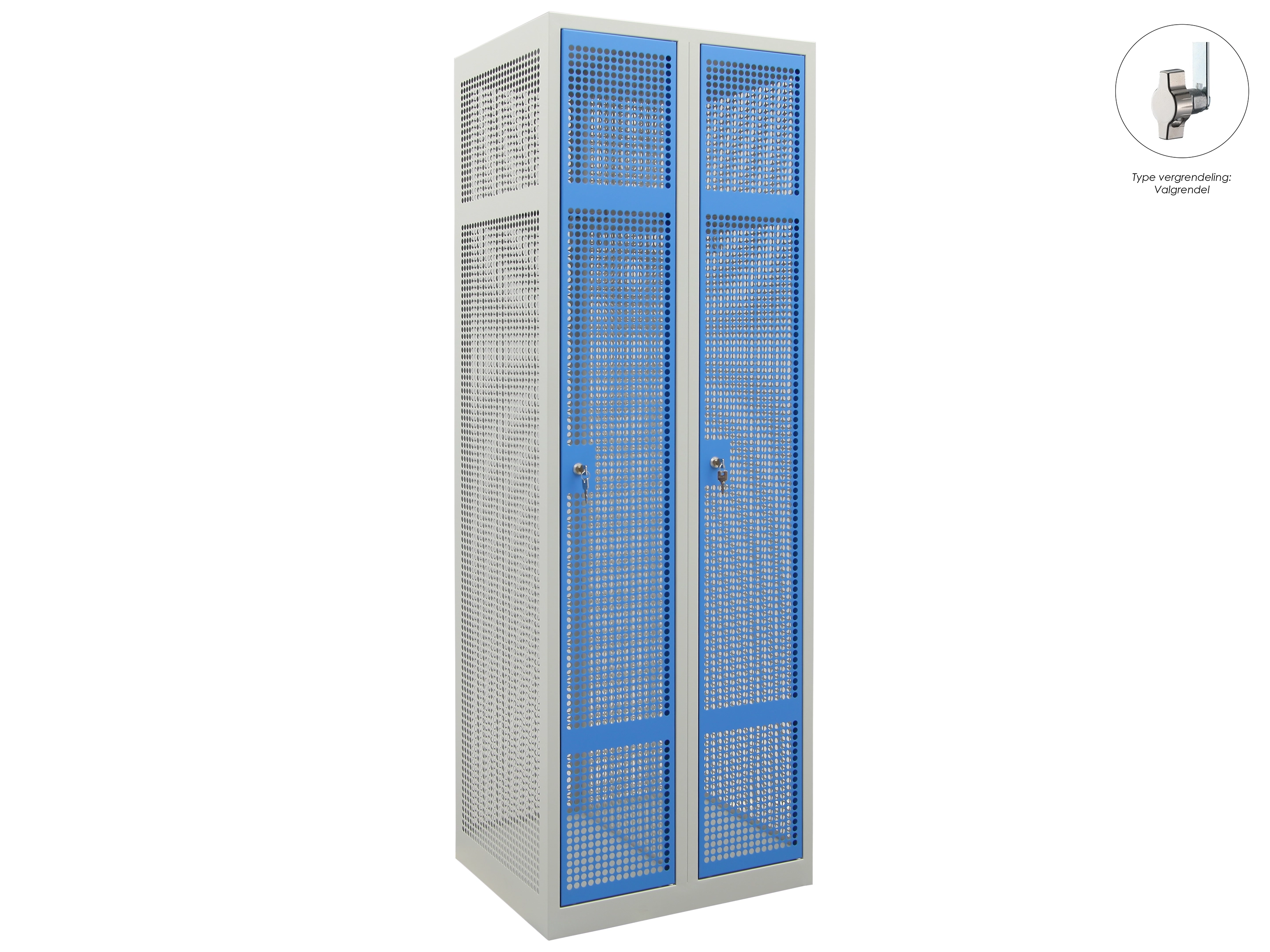 Type deuren: draaideur (gaas), type slot: cilinderslot. Kleur romp: grijs (RAL7035), kleur deuren: blauw (RAL5010). Afmeting: 180x60x50 cm (HxBxD). Indeling: Kledingroede Aantal deuren: 2, aantal sleutels: 2.