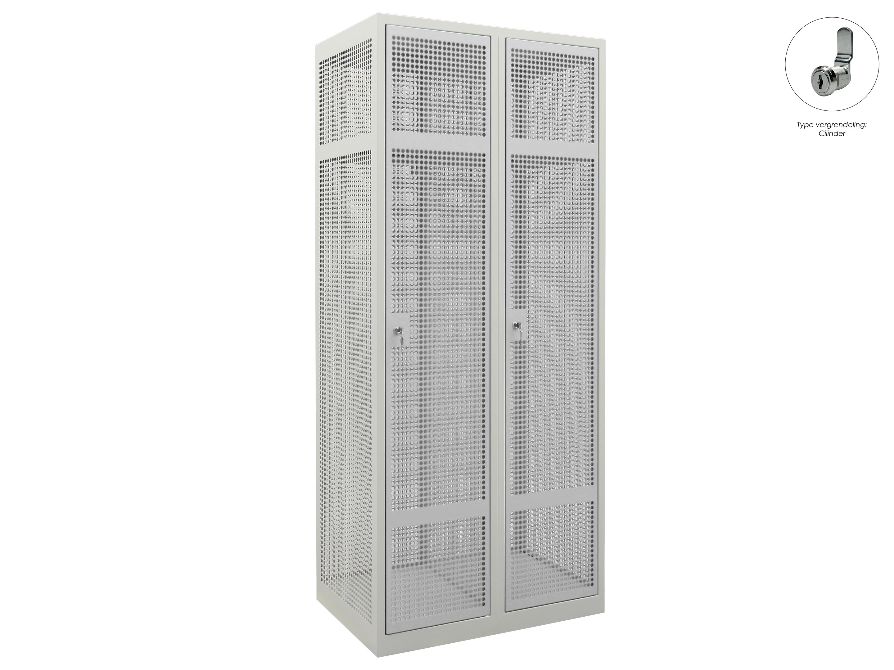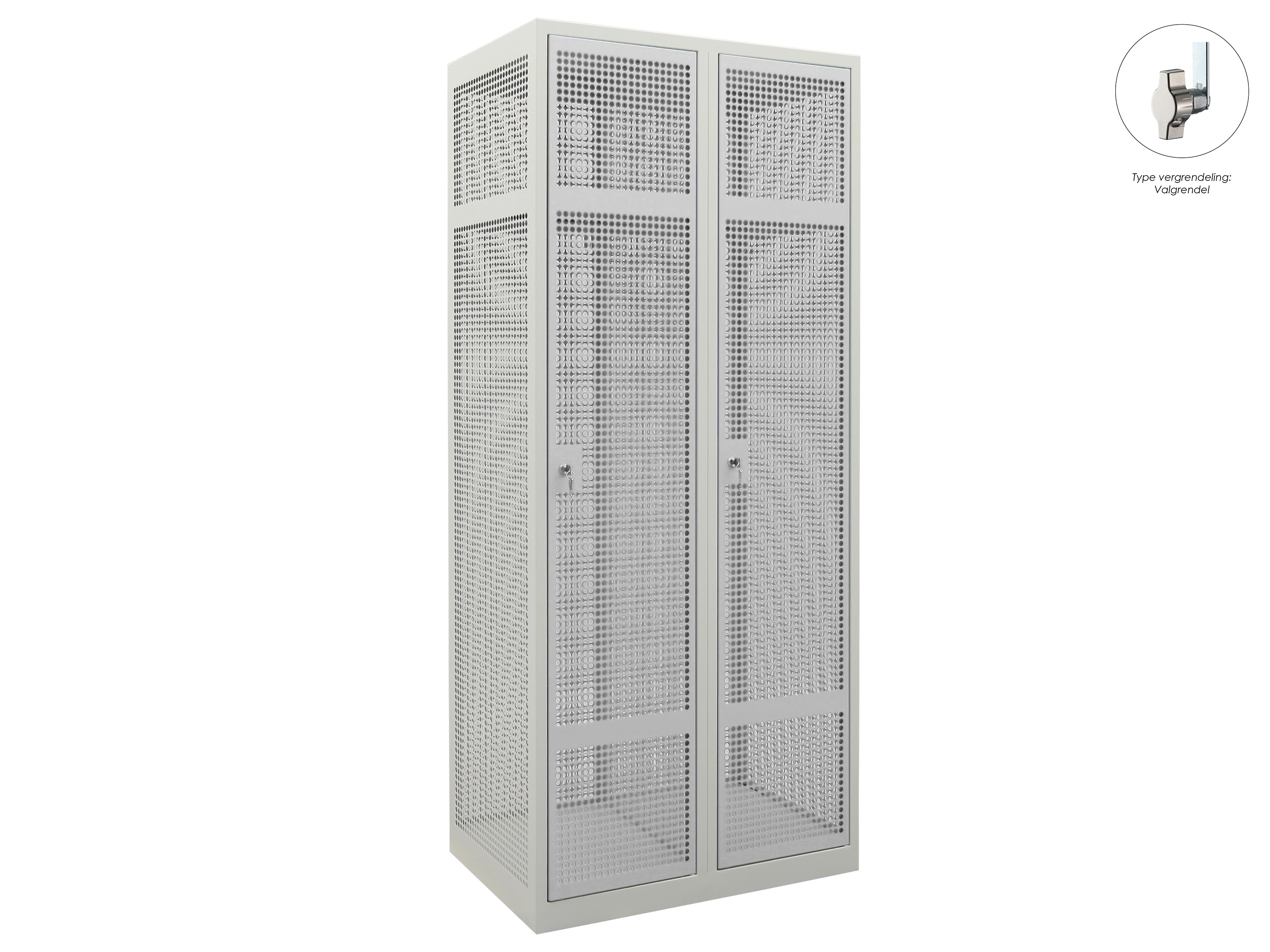Type deuren: draaideur (gaas), type slot: cilinderslot. Kleur romp: grijs (RAL7035), kleur deuren: grijs (RAL7035). Afmeting: 180x80x50 cm (HxBxD). Indeling: Kledingroede Aantal deuren: 2, aantal sleutels: 2.