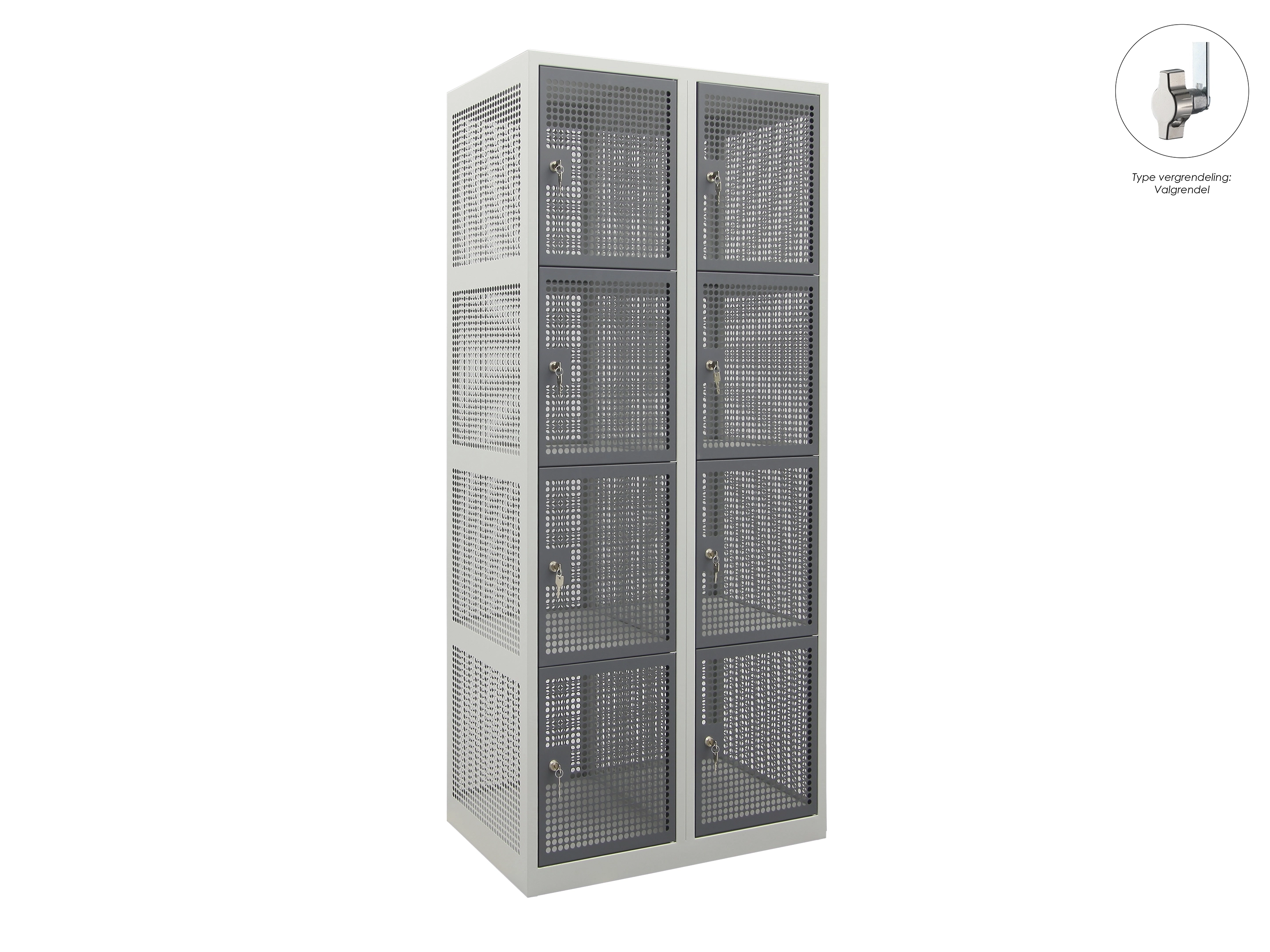 Gaasdeuren, slot: valgrendelslot. Romp: grijs (RAL7035), kleur deuren: Aluminium (RAL9006) . Afmeting: 180x80x50 cm (HxBxD). Kan uitgevoerd worden met speciale primer tegen vocht en weersinvloeden. Meerprijs bedraagt 15%.
