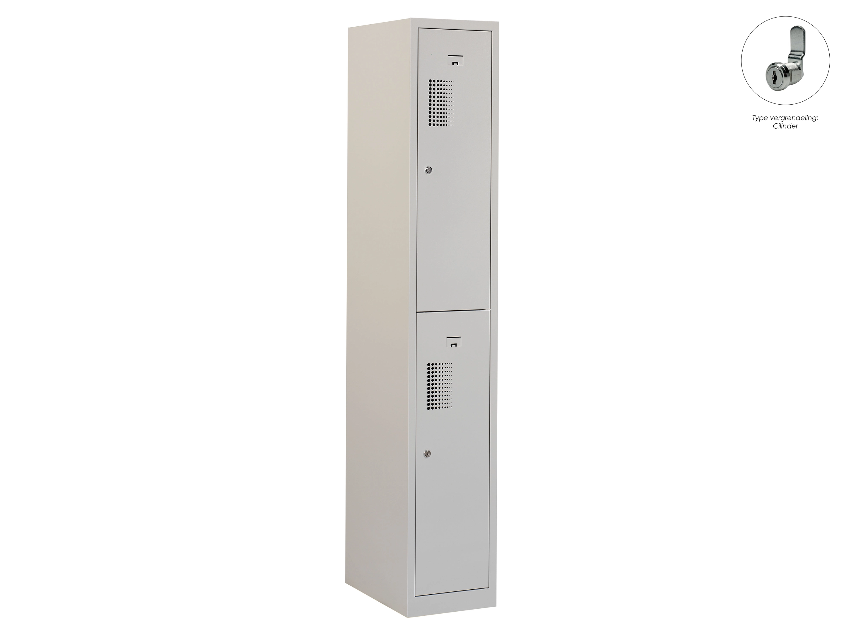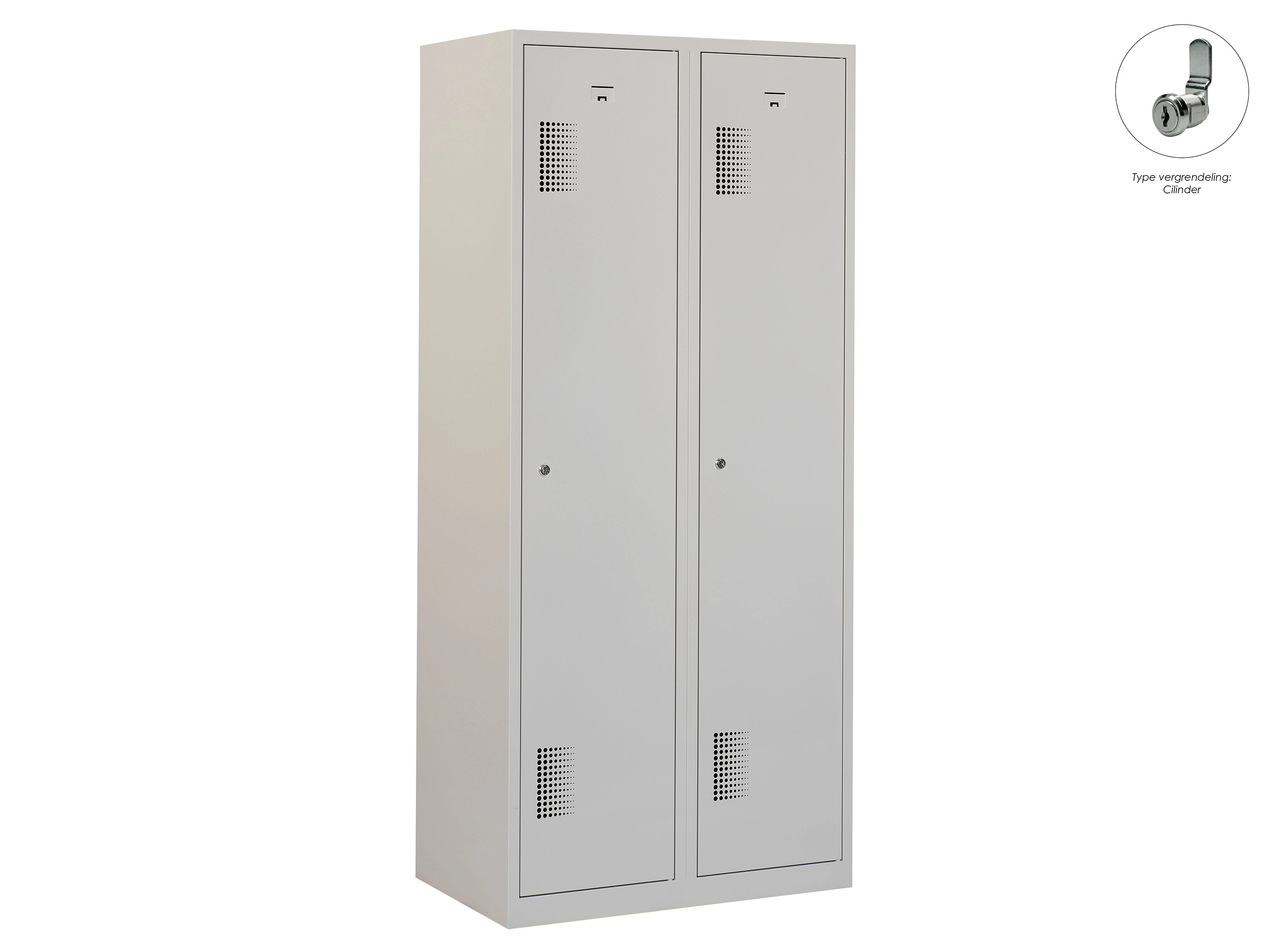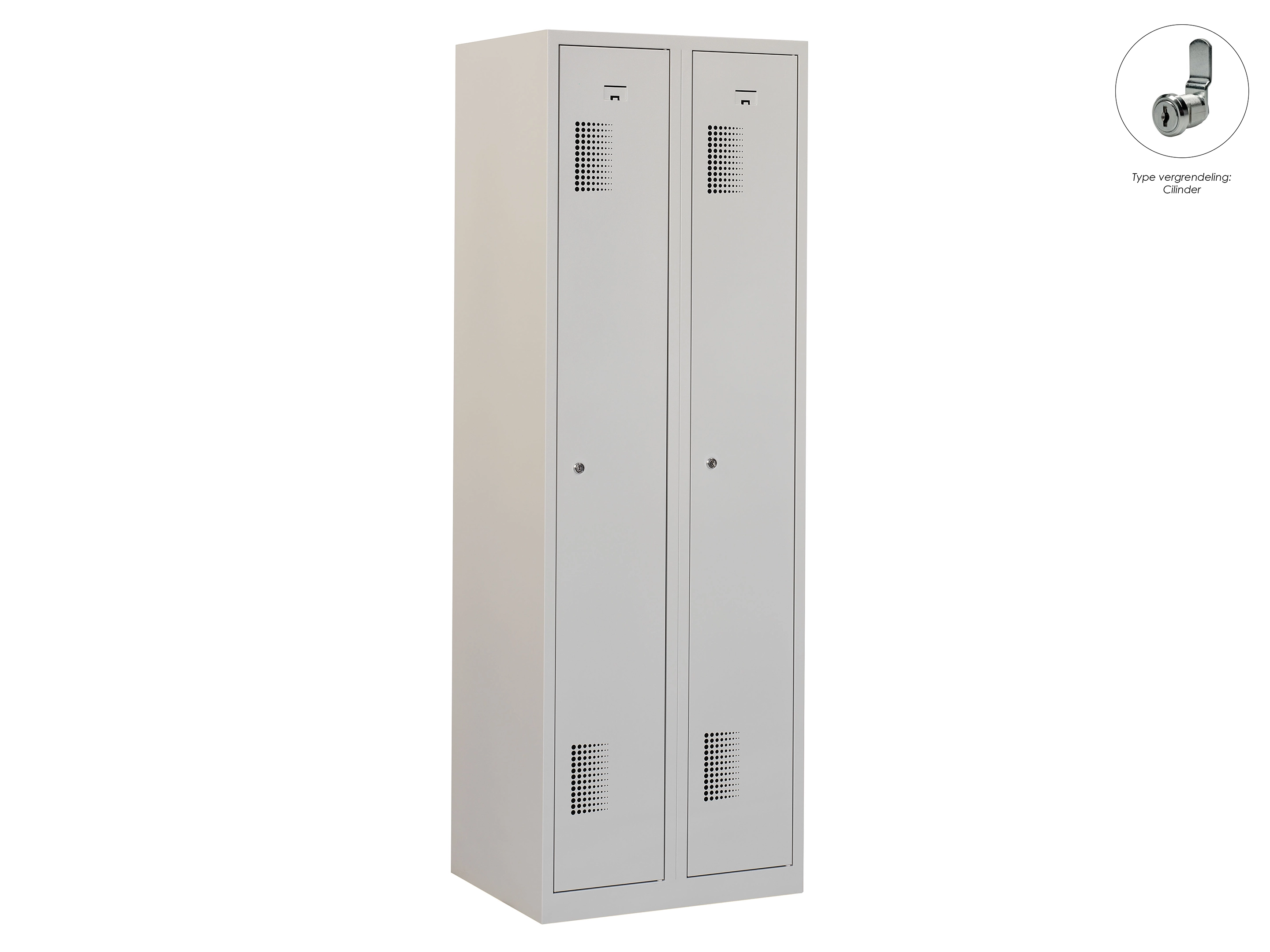 Type deuren: draaideur (geperforeerd), type slot: cilinderslot. Kleur romp: grijs (RAL7035), kleur deuren: grijs (RAL7035). Afmeting: 180x60x50 cm (HxBxD). Indeling: Legbord & kledingroede Aantal deuren: 2, aantal sleutels: 2.