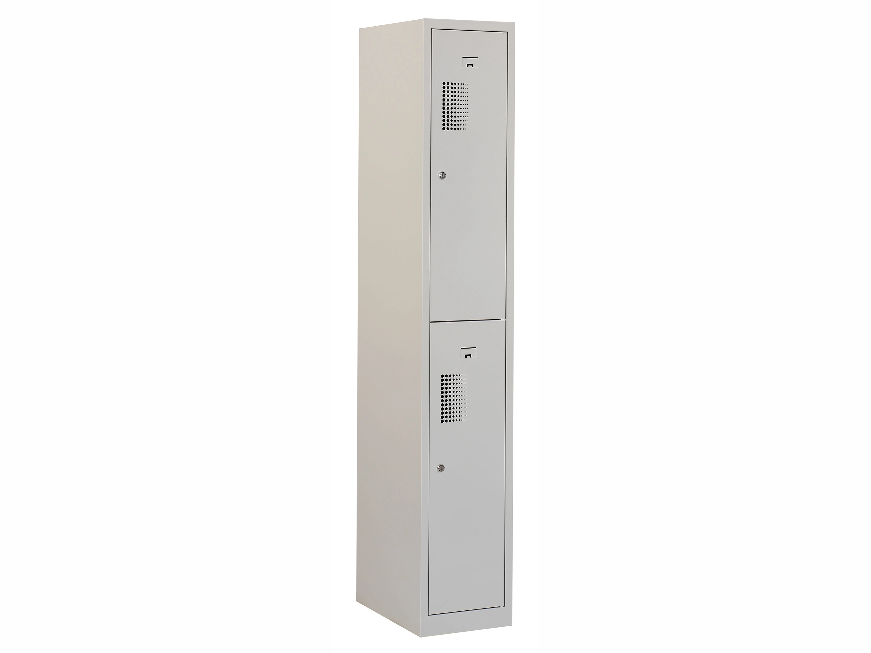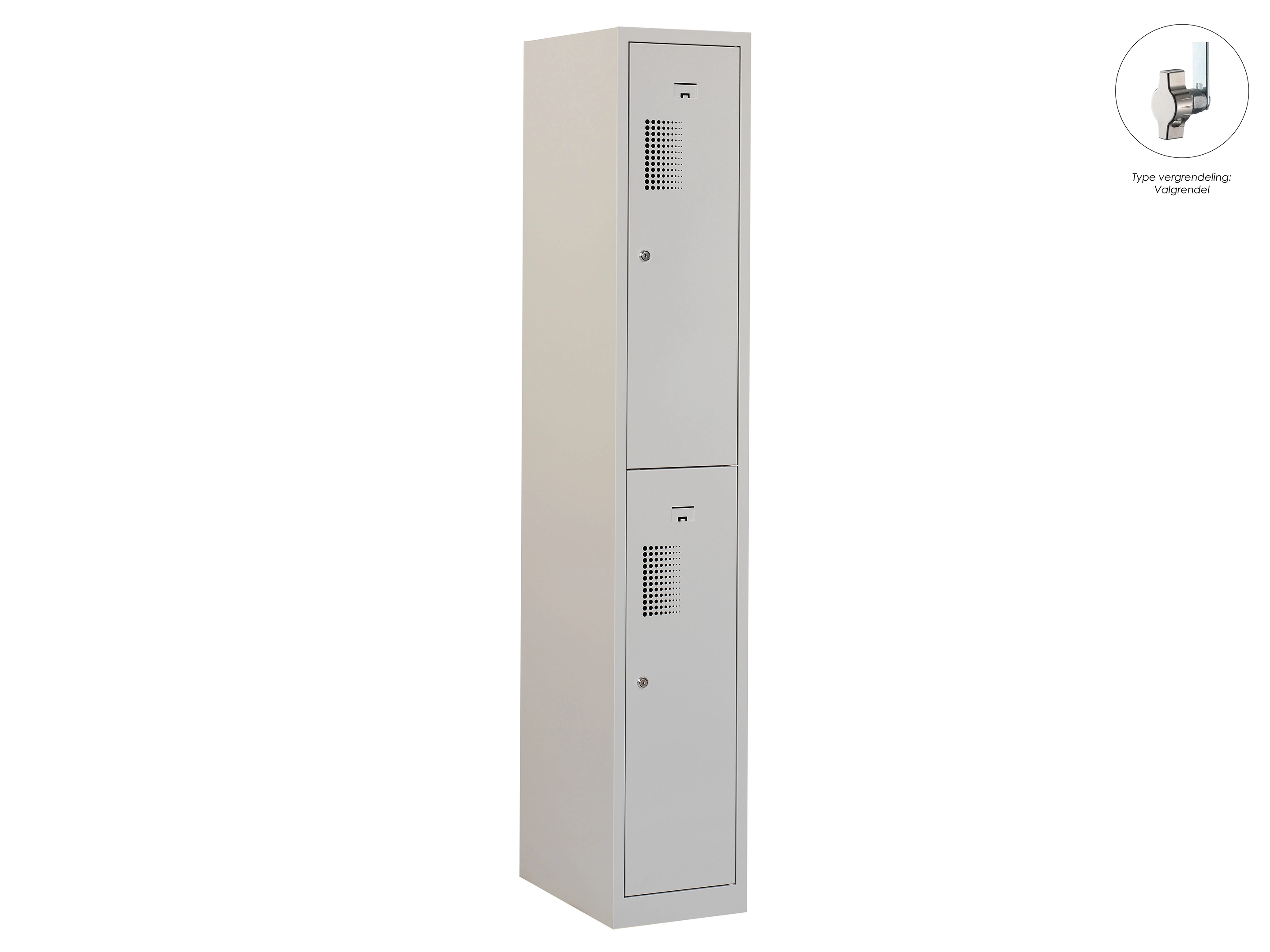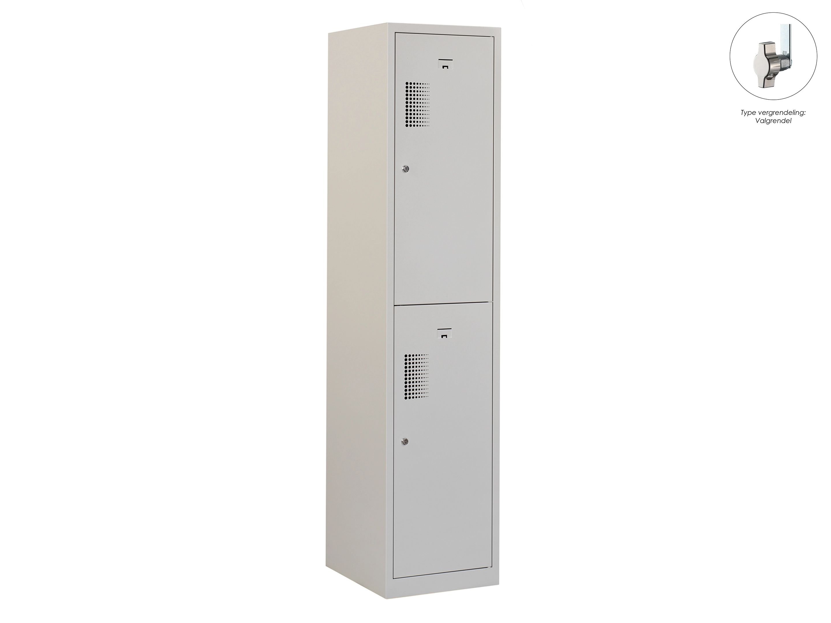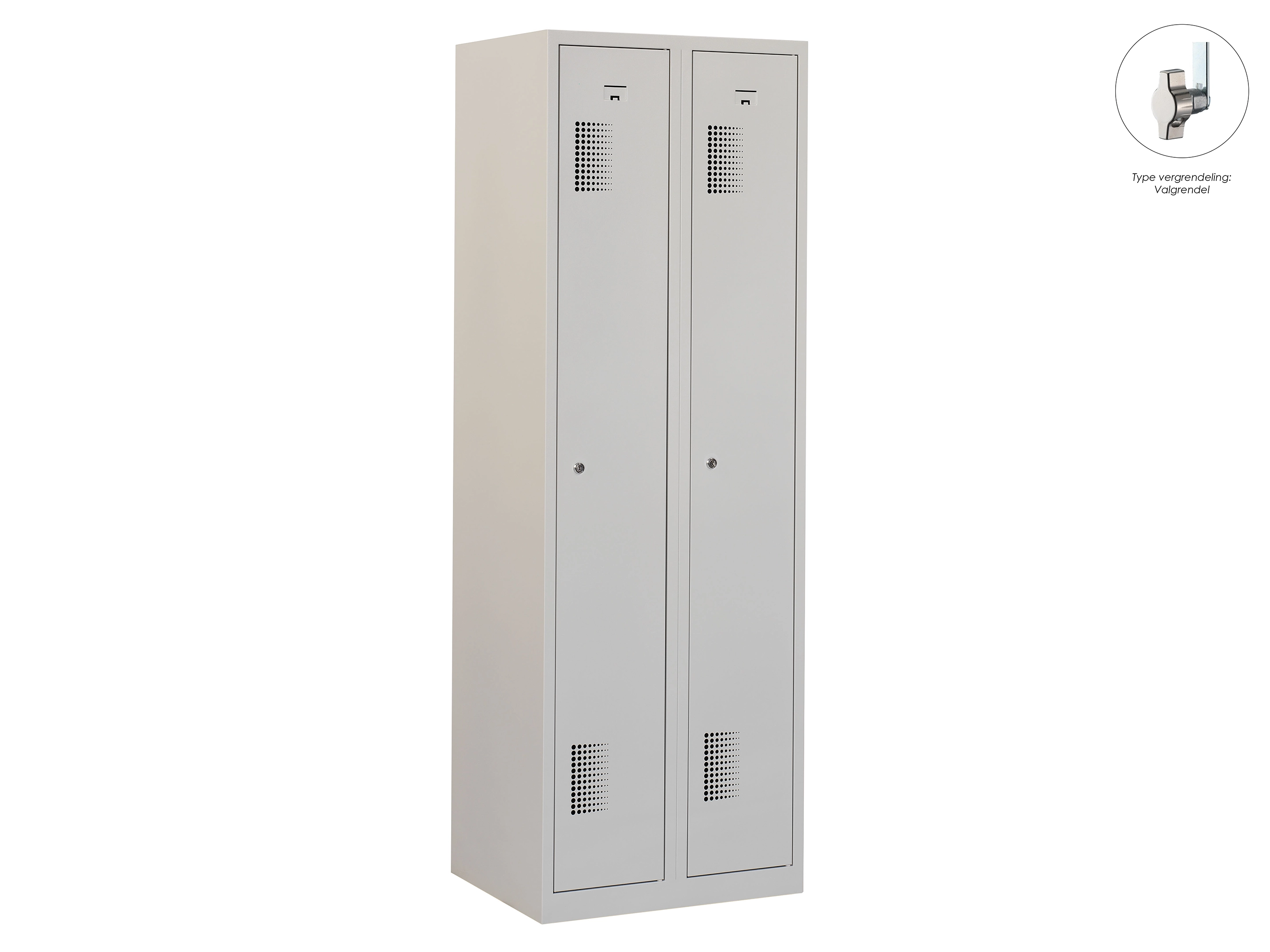 Type deuren: draaideur (geperforeerd), type slot: cilinderslot. Kleur romp: grijs (RAL7035), kleur deuren: grijs (RAL7035). Afmeting: 180x60x50 cm (HxBxD). Indeling: Legbord & kledingroede Aantal deuren: 2, aantal sleutels: 2.