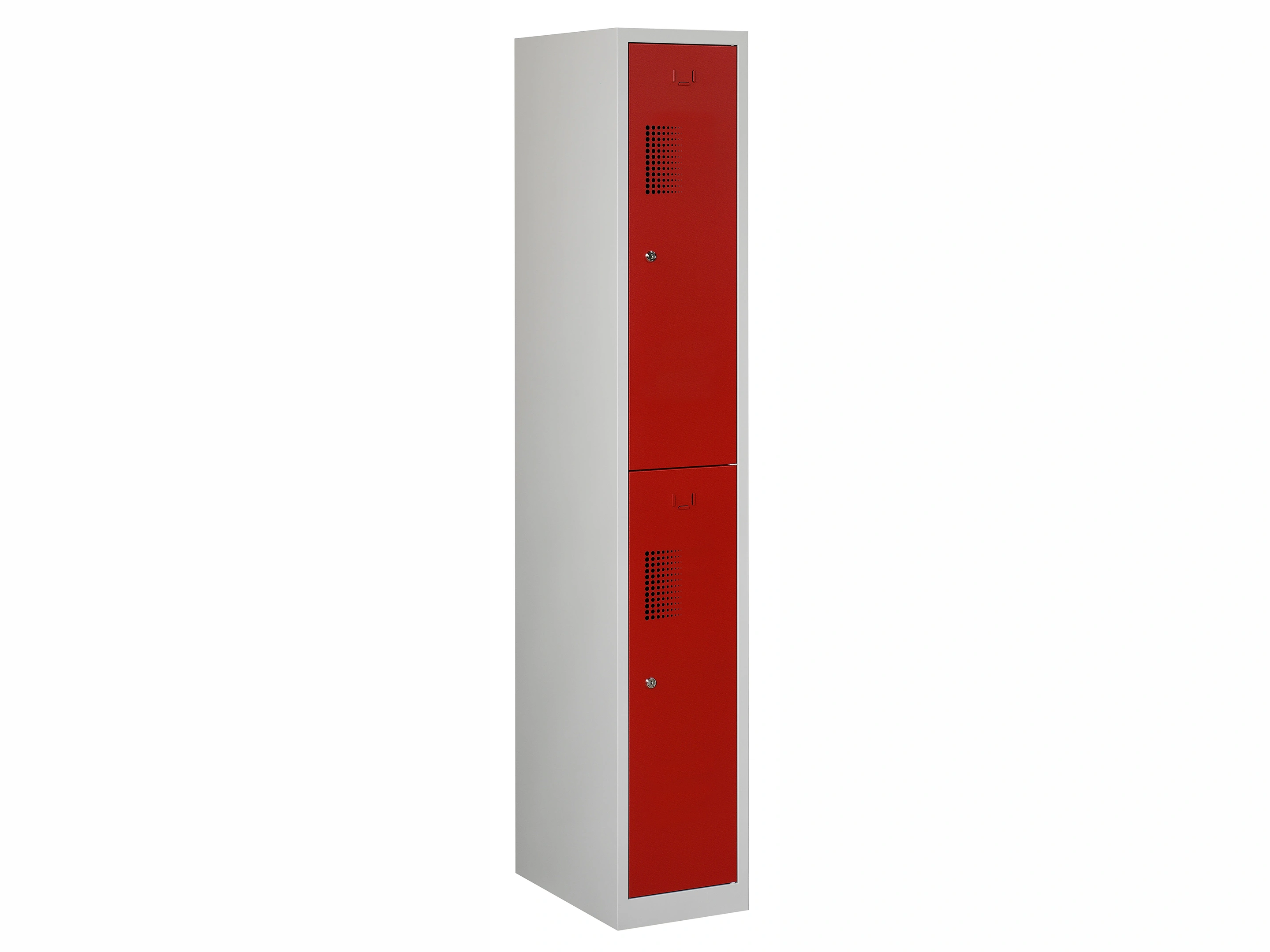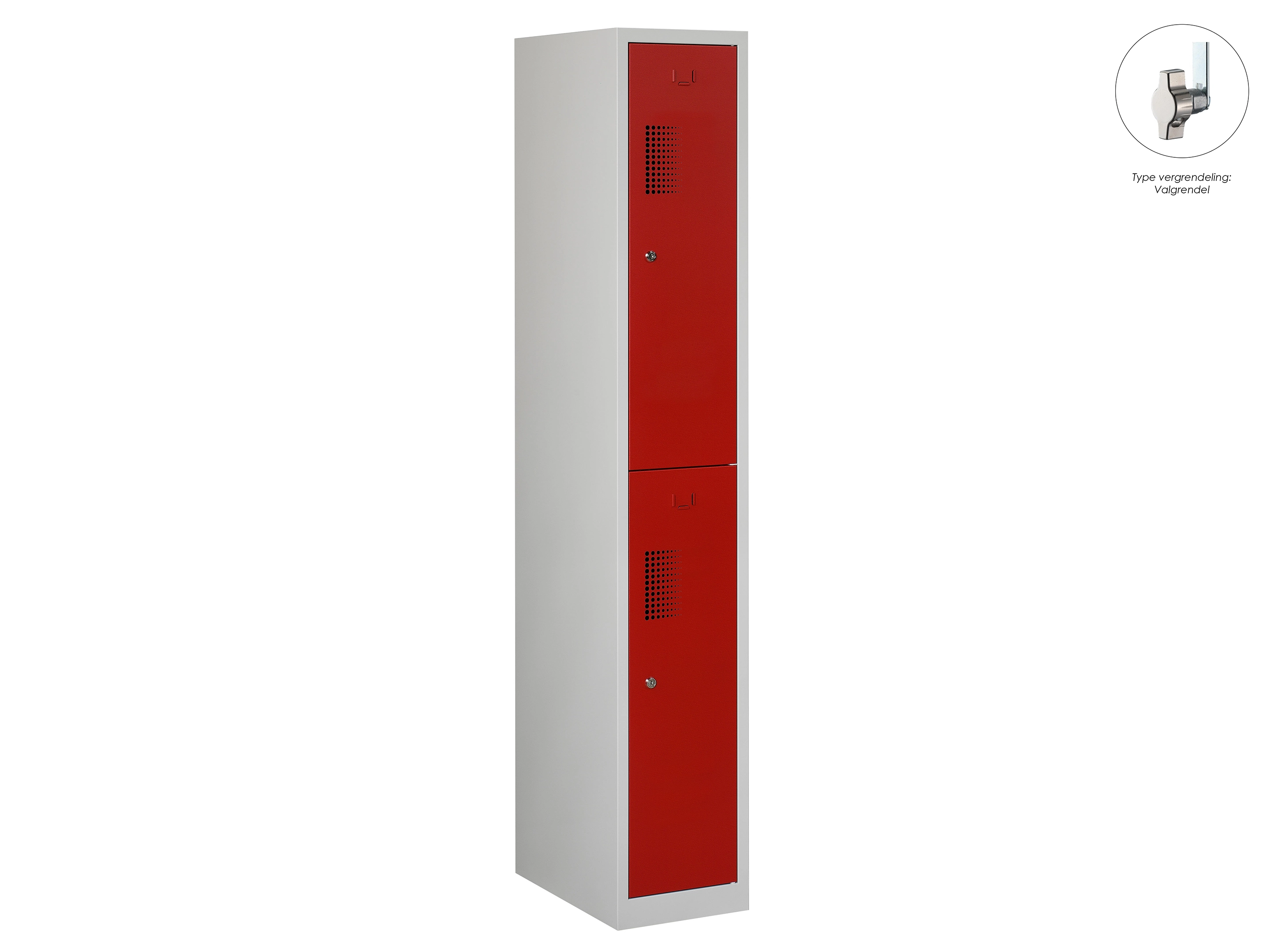 Type deuren: draaideur (geperforeerd), type slot: valgrendelslot. Kleur romp: grijs (RAL7035), kleur deuren: rood (RAL3000). Afmeting: 180x30x50 cm (HxBxD). Indeling: Kledingroede Aantal deuren: 2, aantal sleutels: geen.