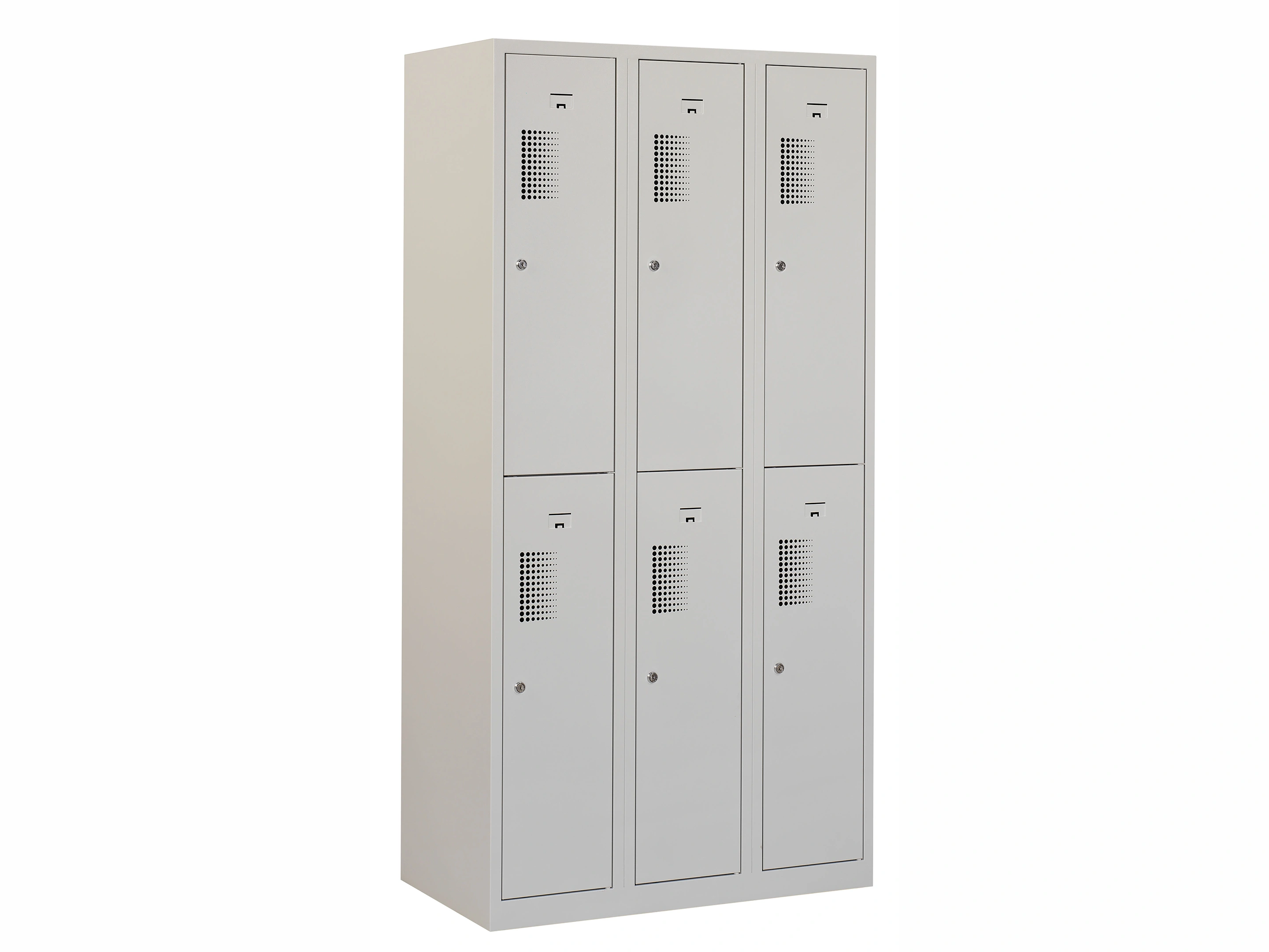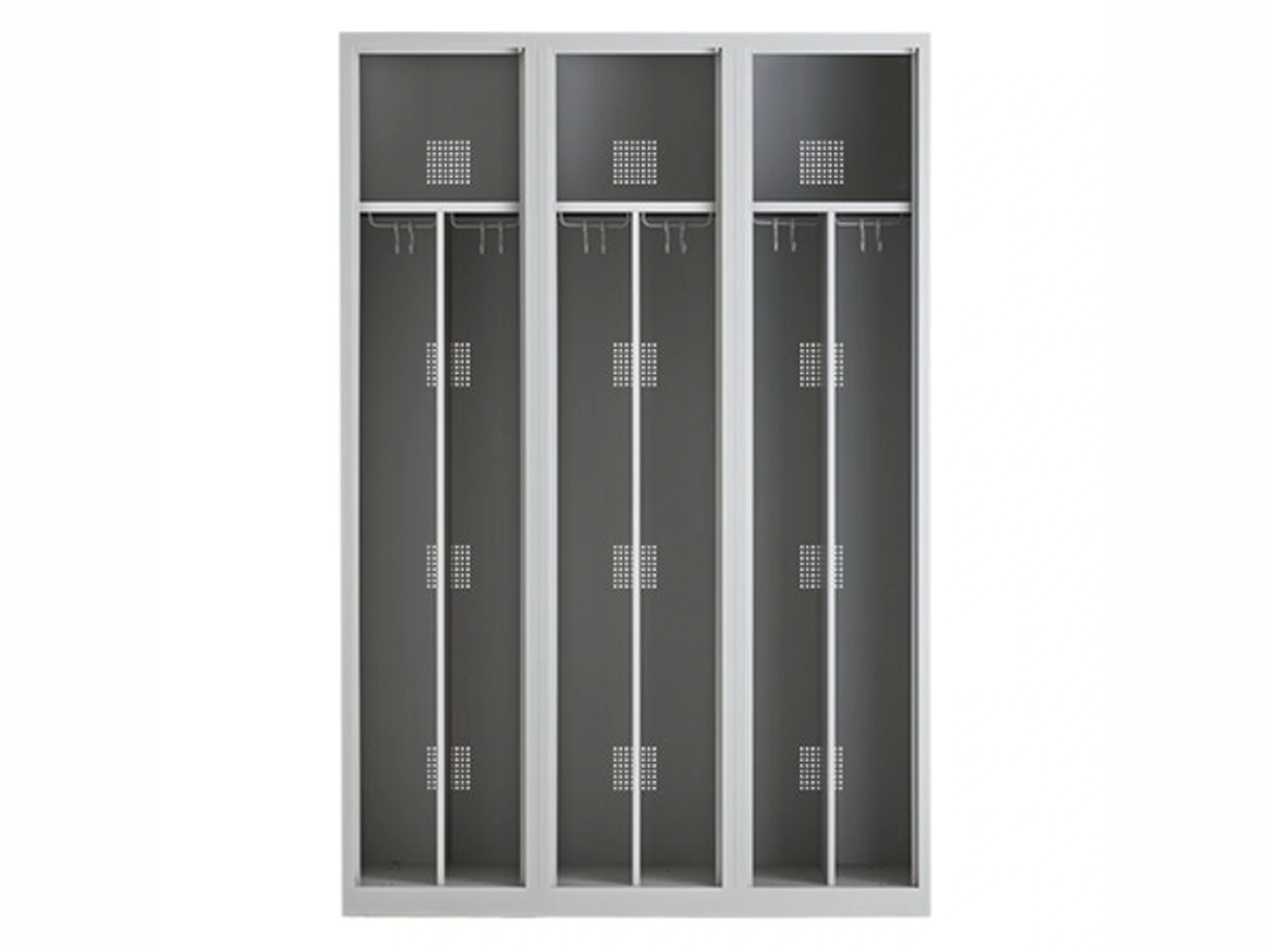 Type deuren: draaideur (geperforeerd), type slot: valgrendelslot. Kleur romp: grijs (RAL7035), kleur deuren: grijs (RAL7035). Afmeting: 180x120x50 cm (HxBxD). Indeling: Legbord & kledingroede Aantal deuren: 3, aantal sleutels: geen.