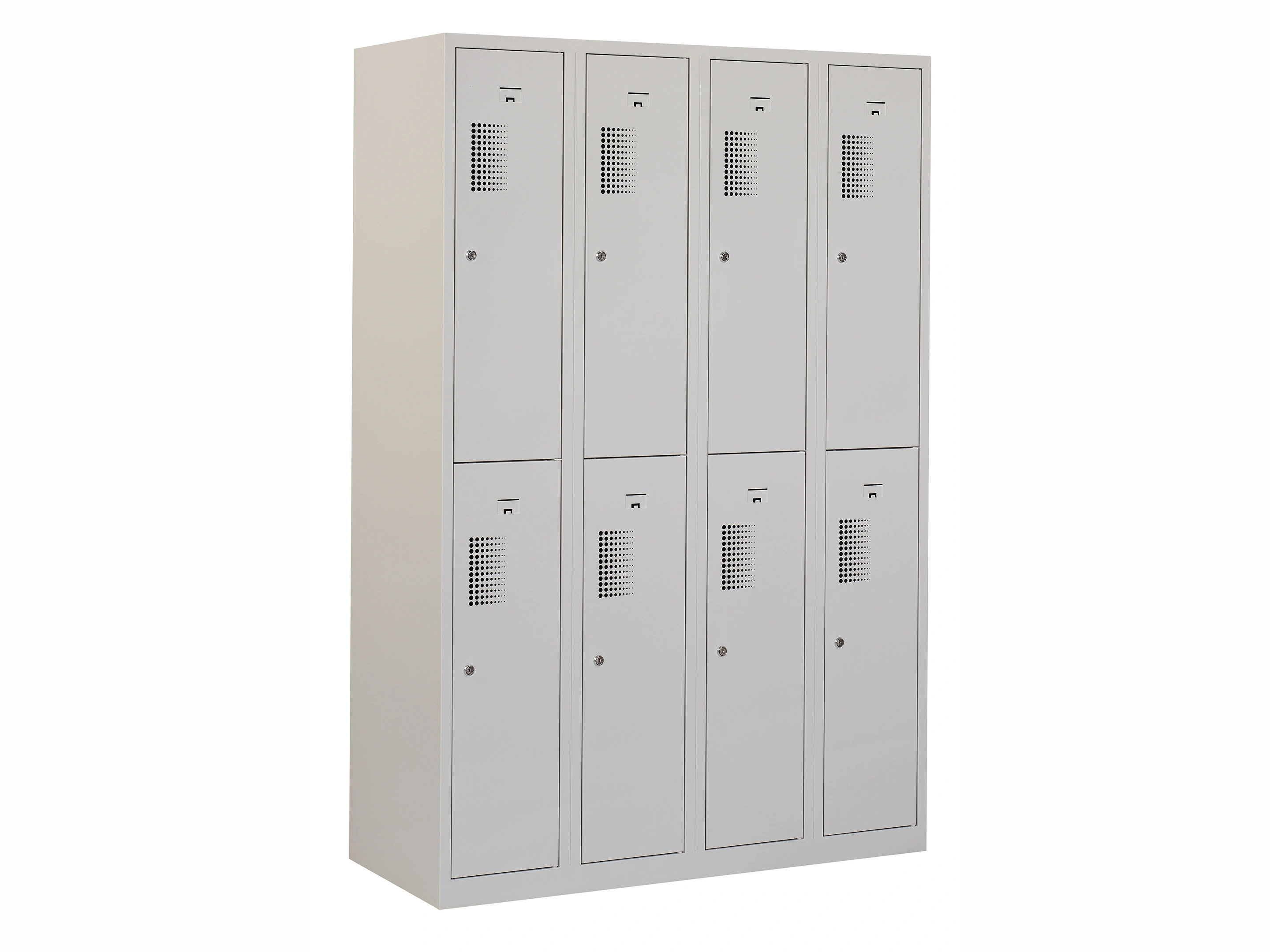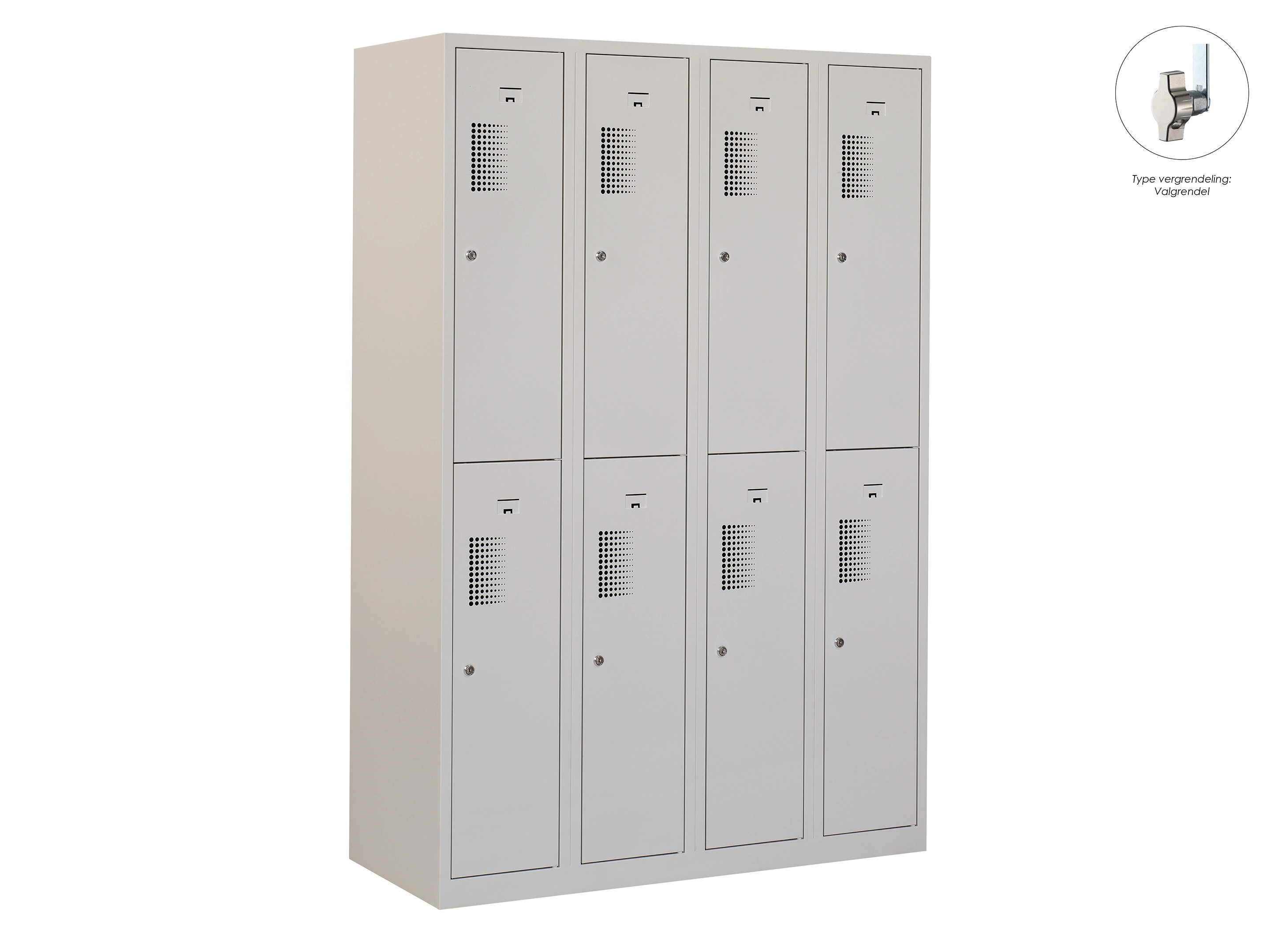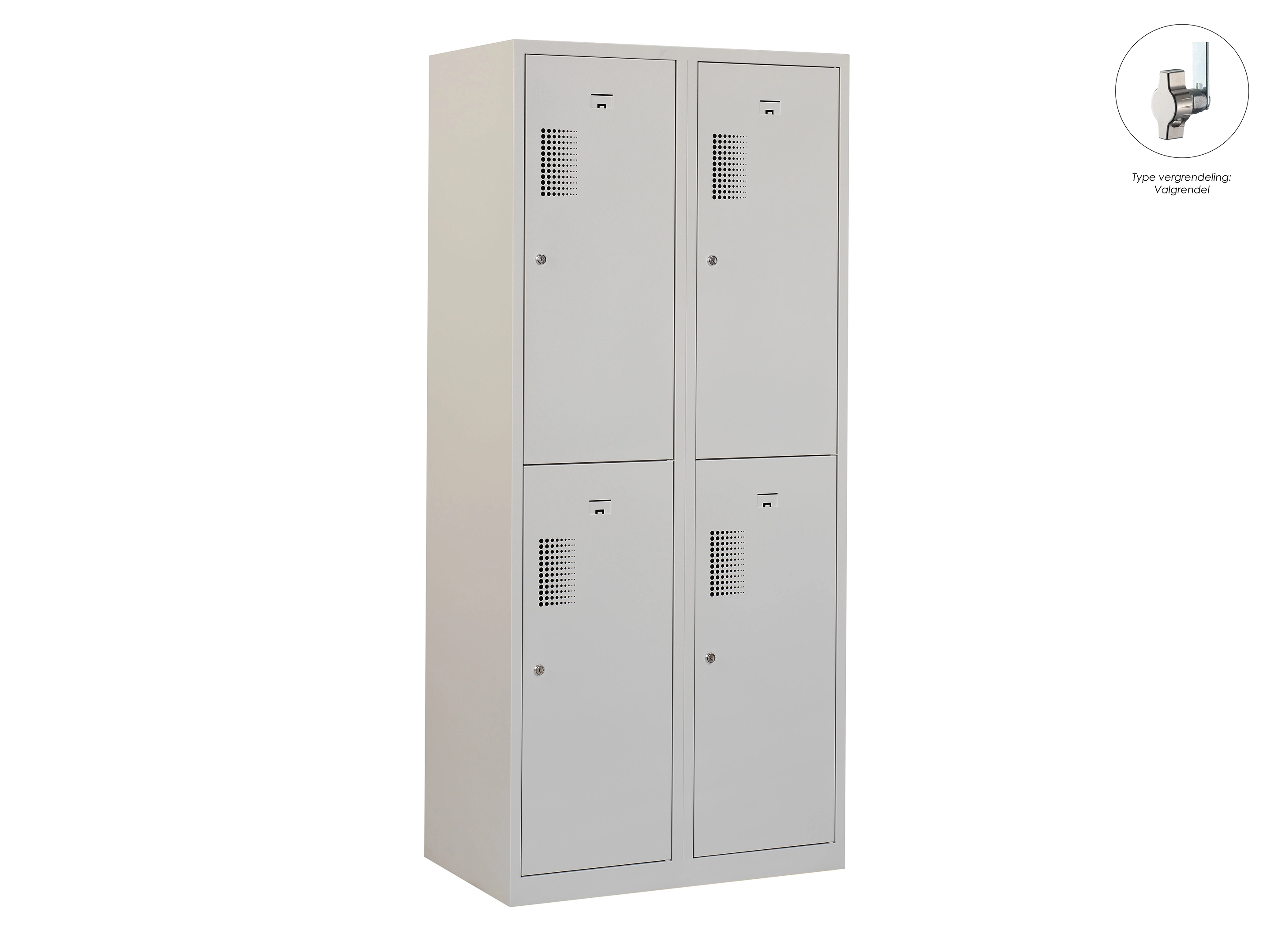 Type deuren: draaideur (geperforeerd), type slot: valgrendelslot. Kleur romp: grijs (RAL7035), kleur deuren: grijs (RAL7035). Afmeting: 180x80x50 cm (HxBxD). Indeling: Kledingroede Aantal deuren: 4, aantal sleutels: geen.