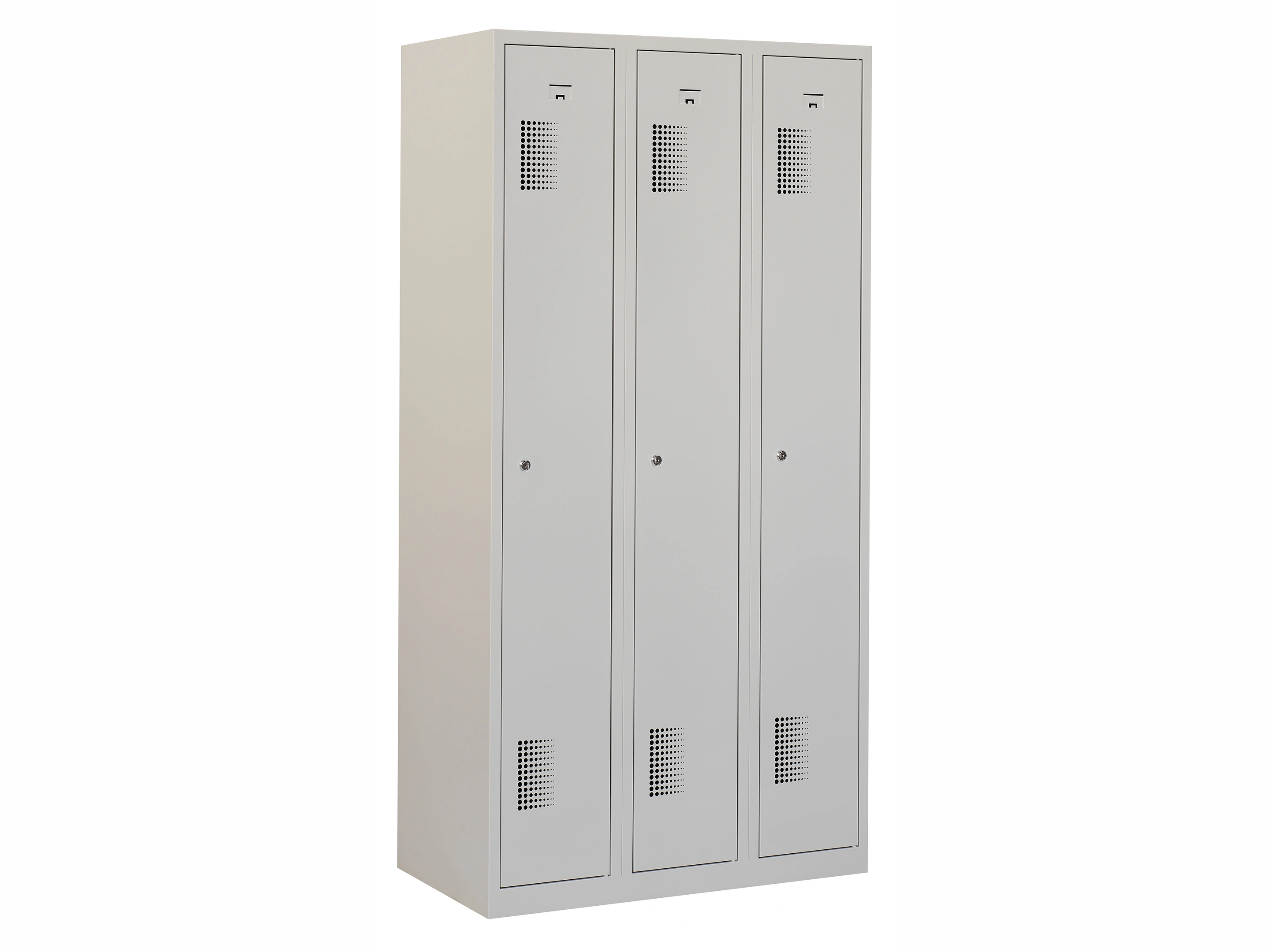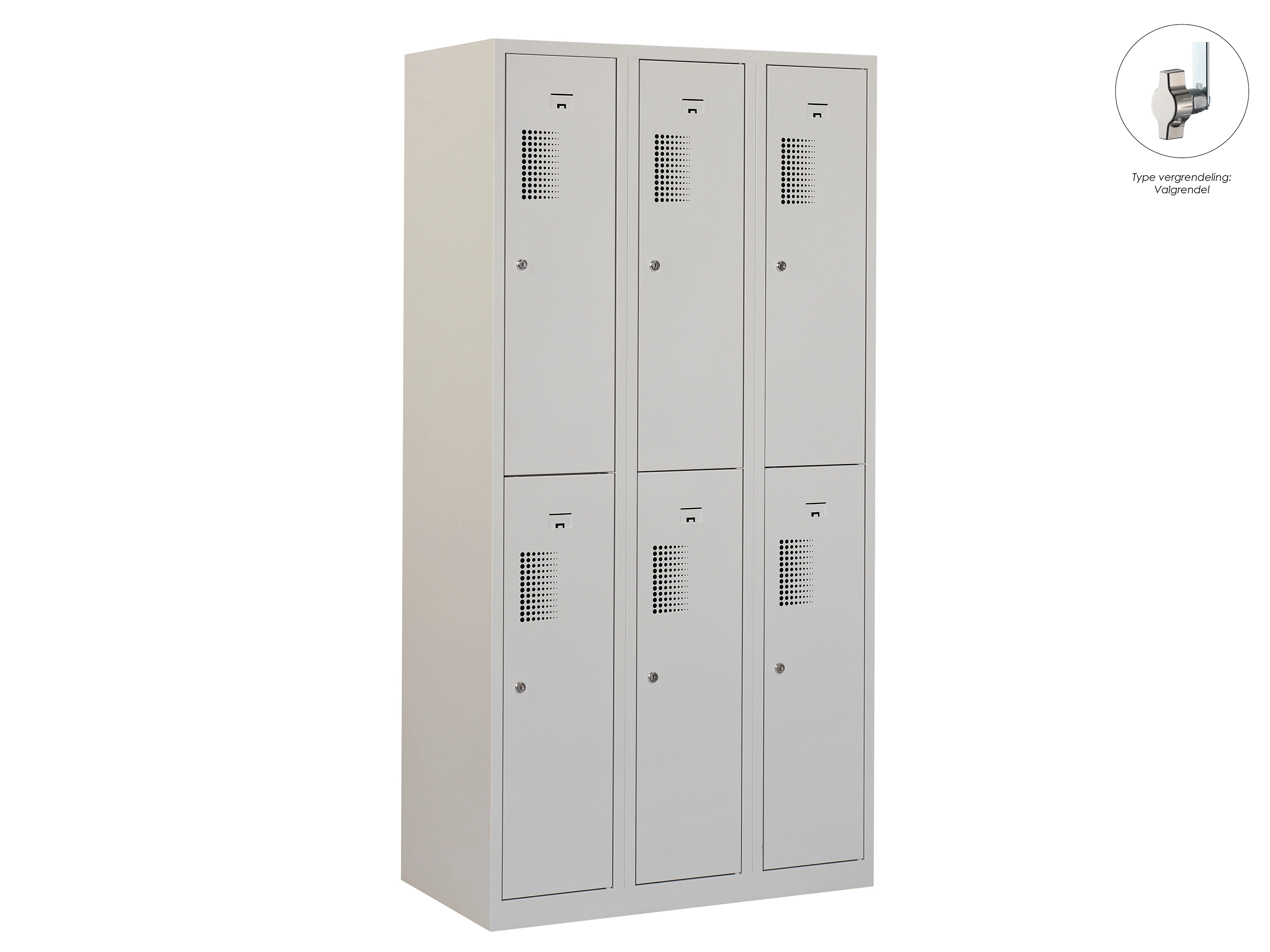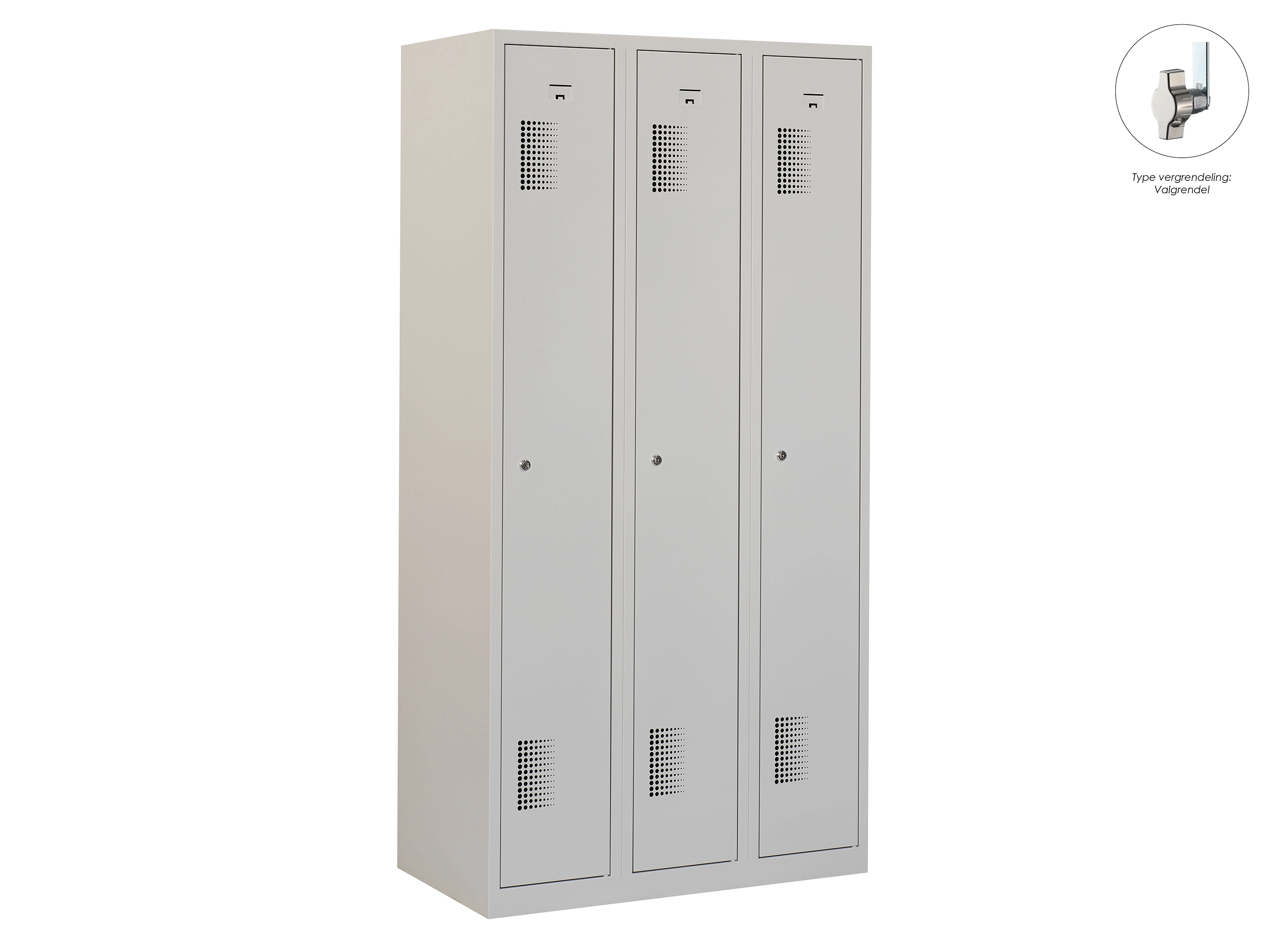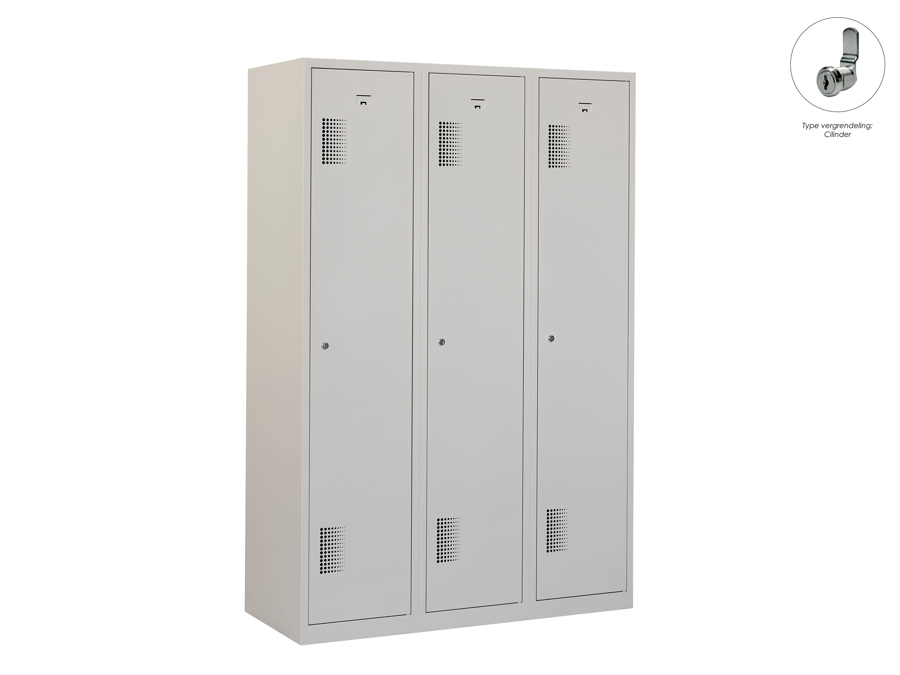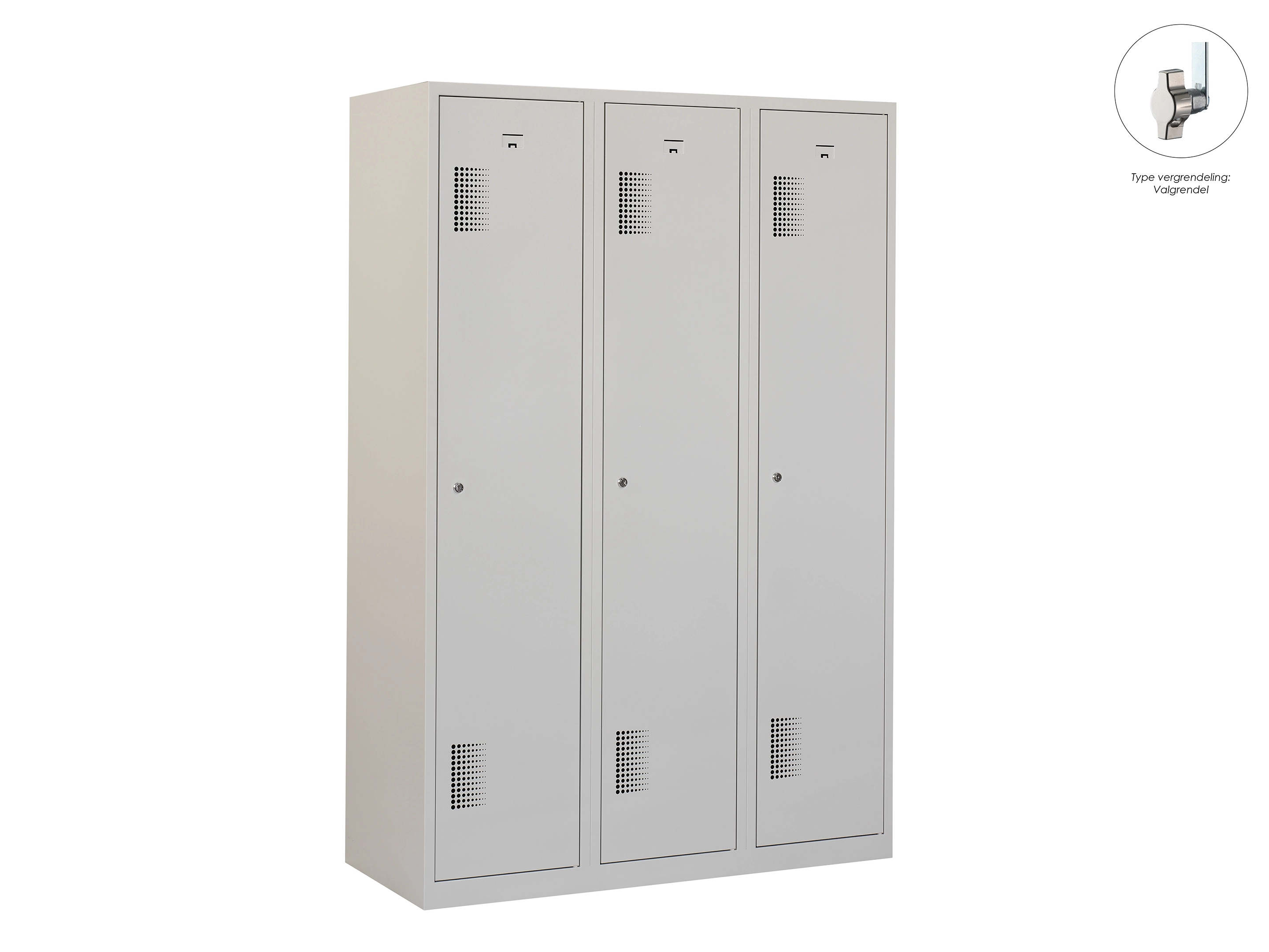 Type deuren: draaideur (geperforeerd), type slot: valgrendelslot. Kleur romp: grijs (RAL7035), kleur deuren: grijs (RAL7035). Afmeting: 180x90x50 cm (HxBxD). Indeling: Legbord & kledingroede Aantal deuren: 3, aantal sleutels: geen.