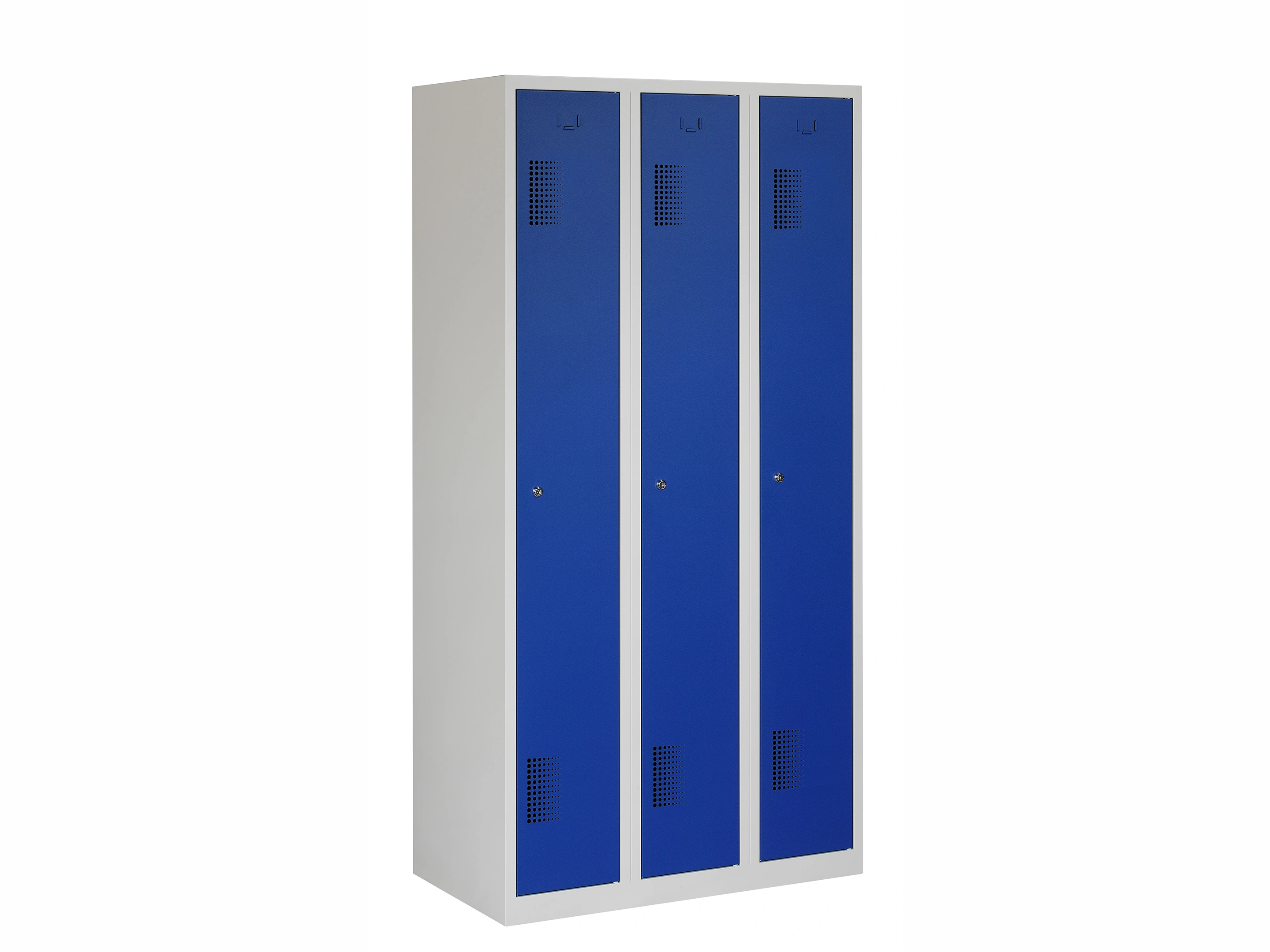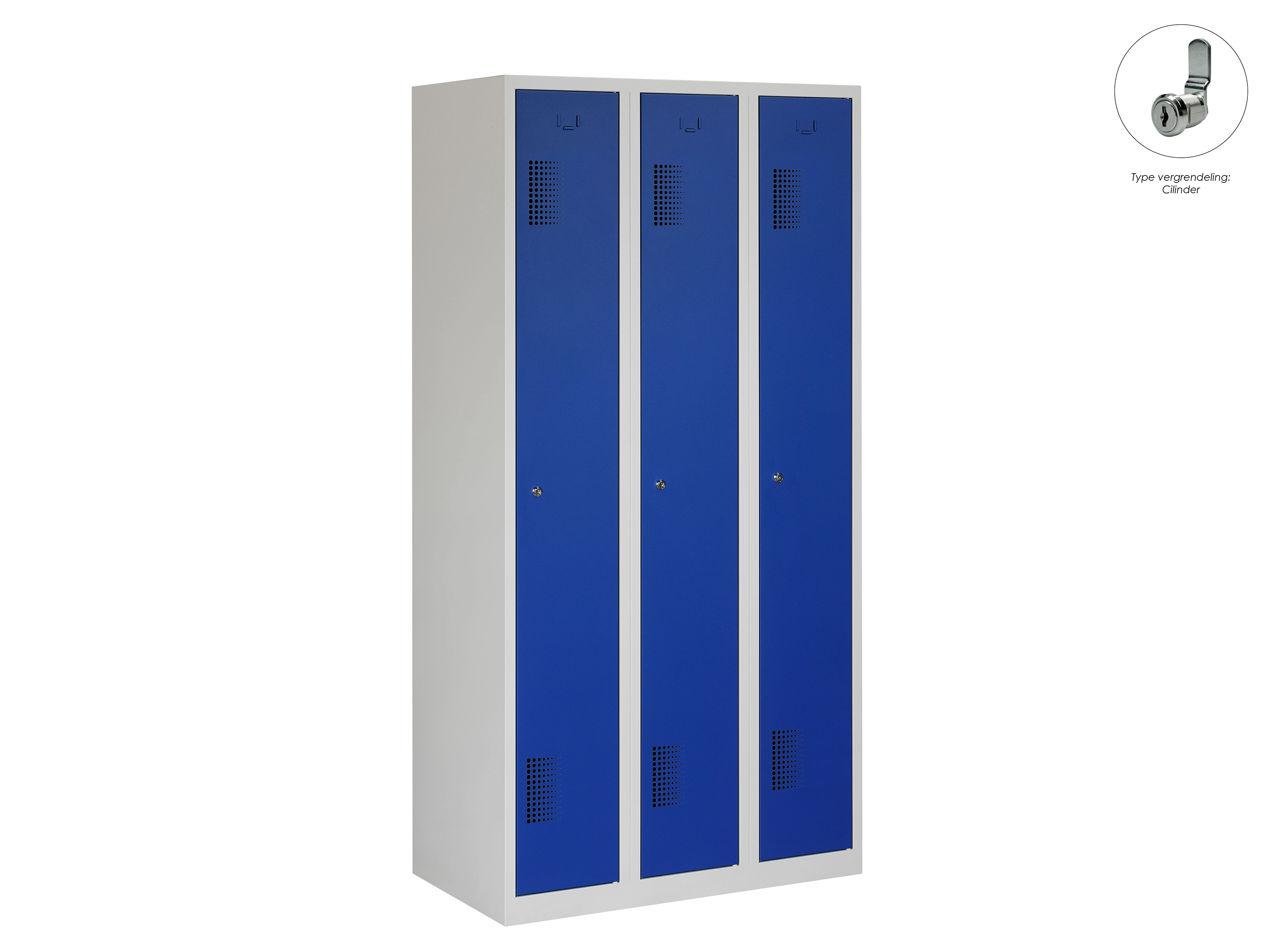 Type deuren: draaideur (geperforeerd), type slot: valgrendelslot. Kleur romp: grijs (RAL7035), kleur deuren: blauw (RAL5010). Afmeting: 180x120x50 cm (HxBxD). Indeling: Legbord & kledingroede Aantal deuren: 3, aantal sleutels: geen.