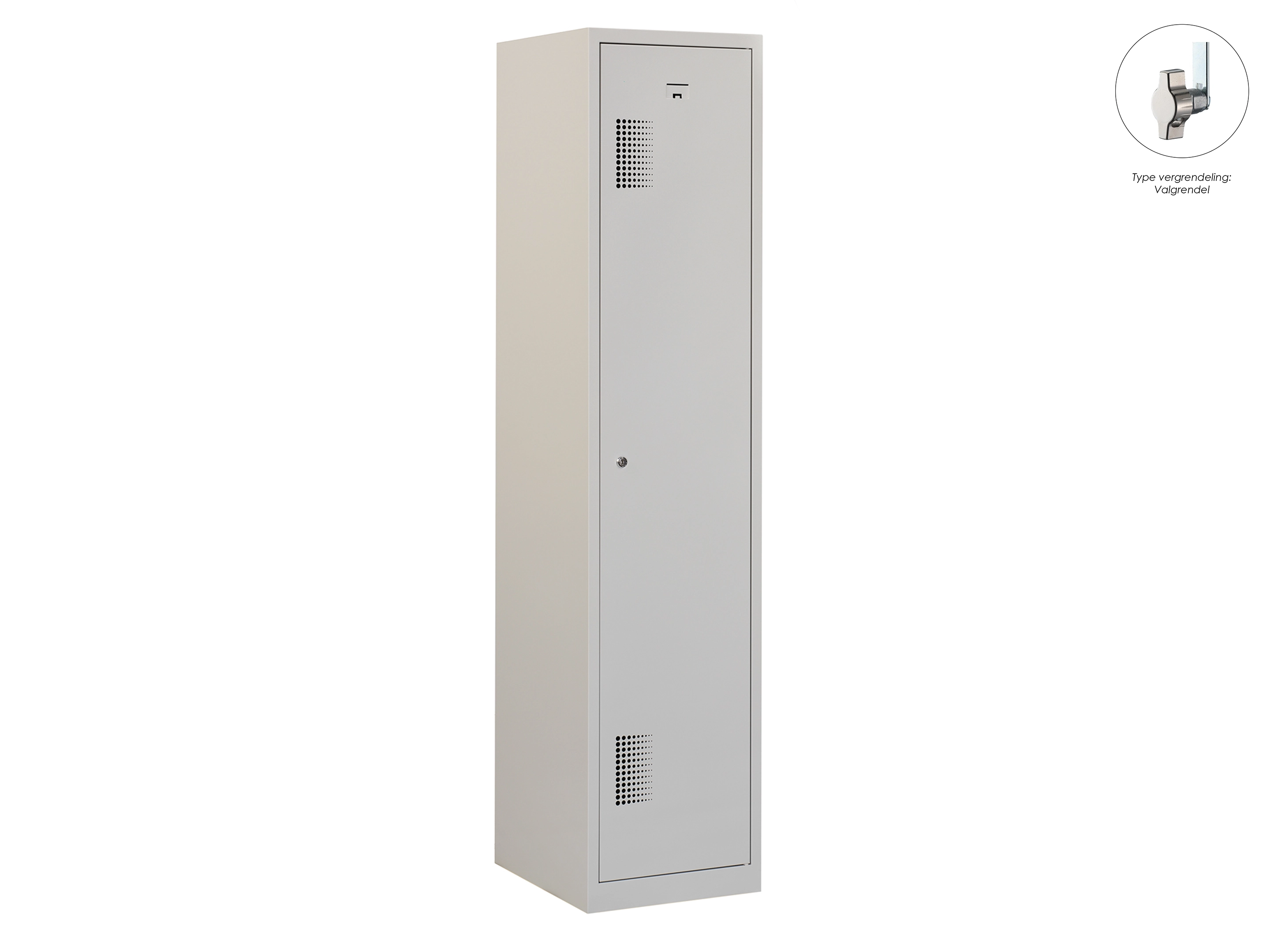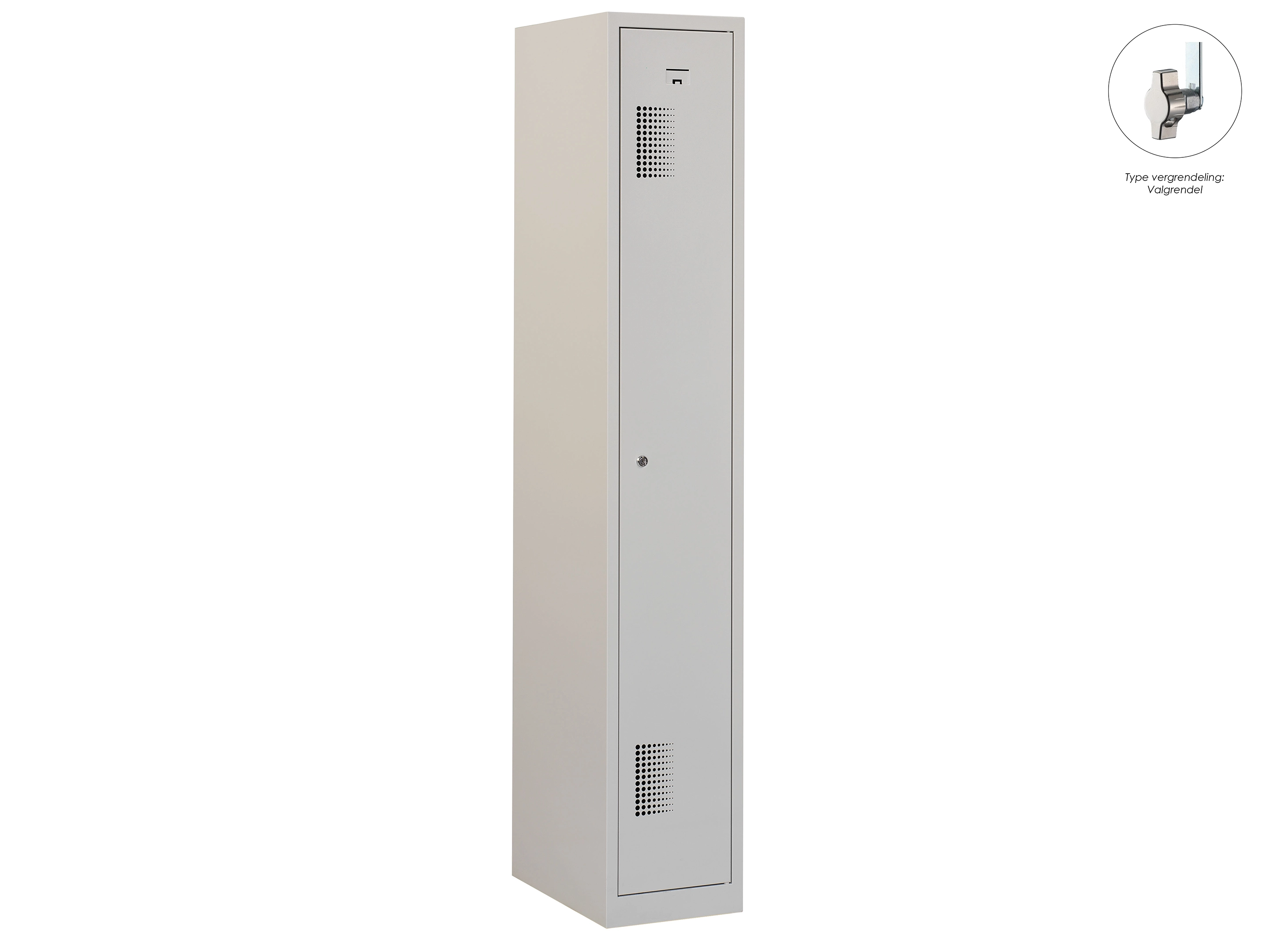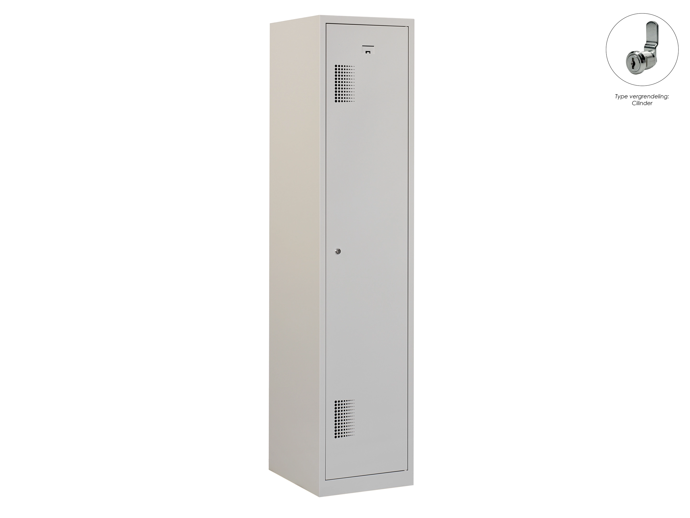 Type deuren: draaideur (geperforeerd), type slot: cilinderslot. Kleur romp: grijs (RAL7035), kleur deuren: grijs (RAL7035). Afmeting: 180x30x50 cm (HxBxD). Indeling: Legbord & kledingroede Aantal deuren: 1, aantal sleutels: 2.