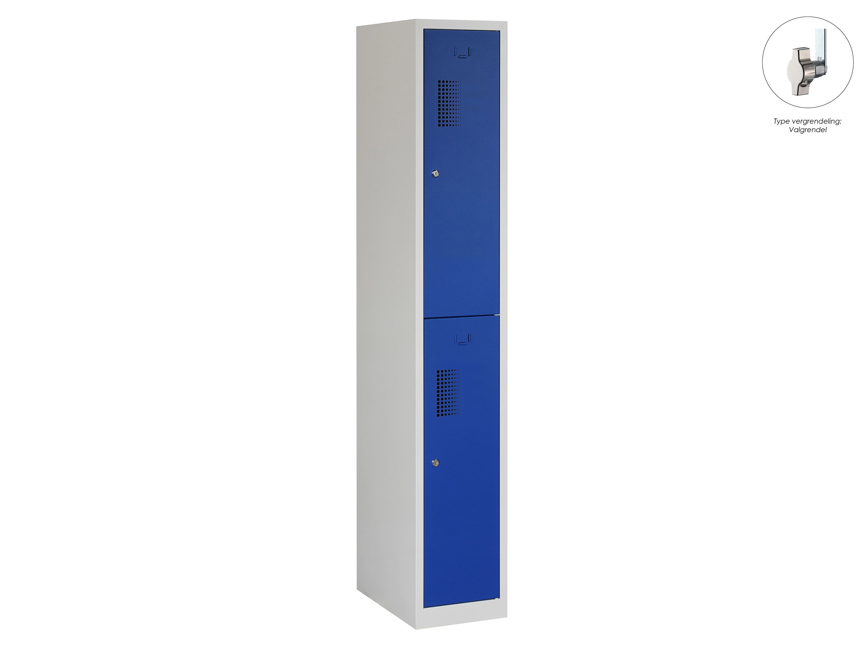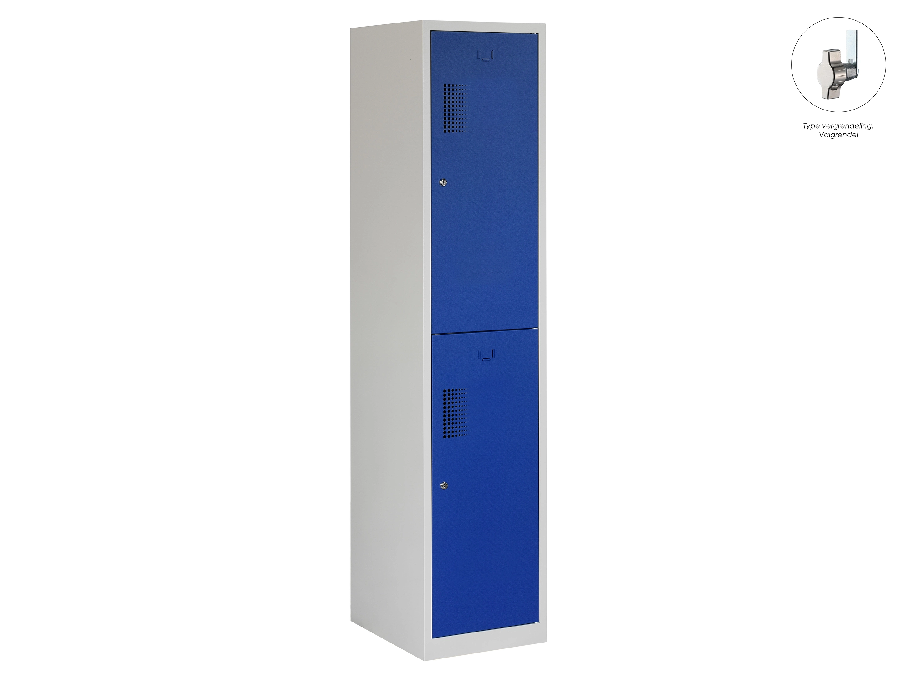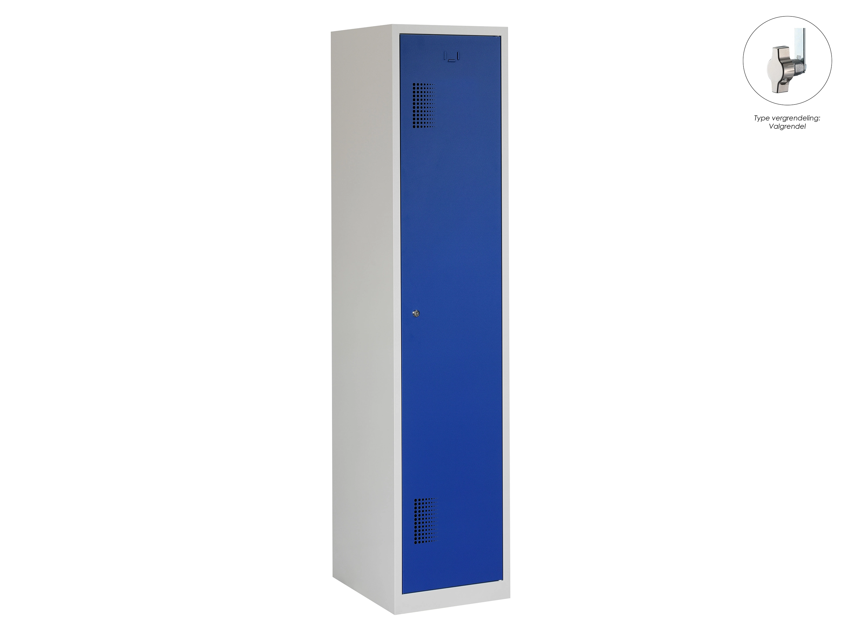 Type deuren: draaideur (geperforeerd), type slot: valgrendelslot. Kleur romp: grijs (RAL7035), kleur deuren: blauw (RAL5010). Afmeting: 180x60x50 cm (HxBxD). Indeling: Legbord & kledingroede Aantal deuren: 2, aantal sleutels: geen.