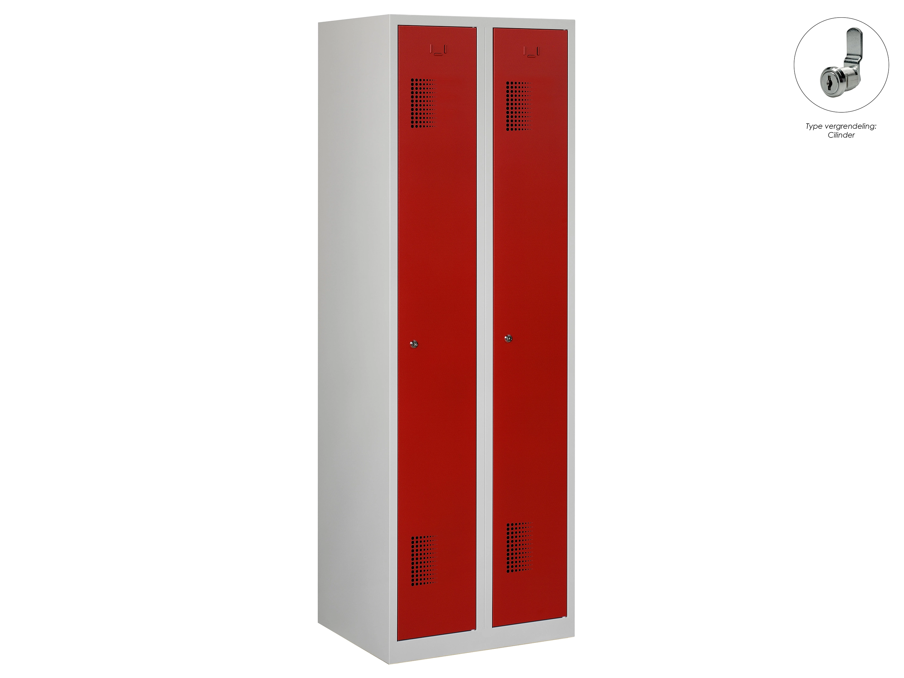 Type deuren: draaideur (ventilatiesleuven), type slot: cilinderslot. Kleur romp: grijs (RAL7035), kleur deuren: rood (RAL3000). Afmeting: 180x80x50 cm (HxBxD). Indeling: Legbord & kledingroede Aantal deuren: 2, aantal sleutels: 2.