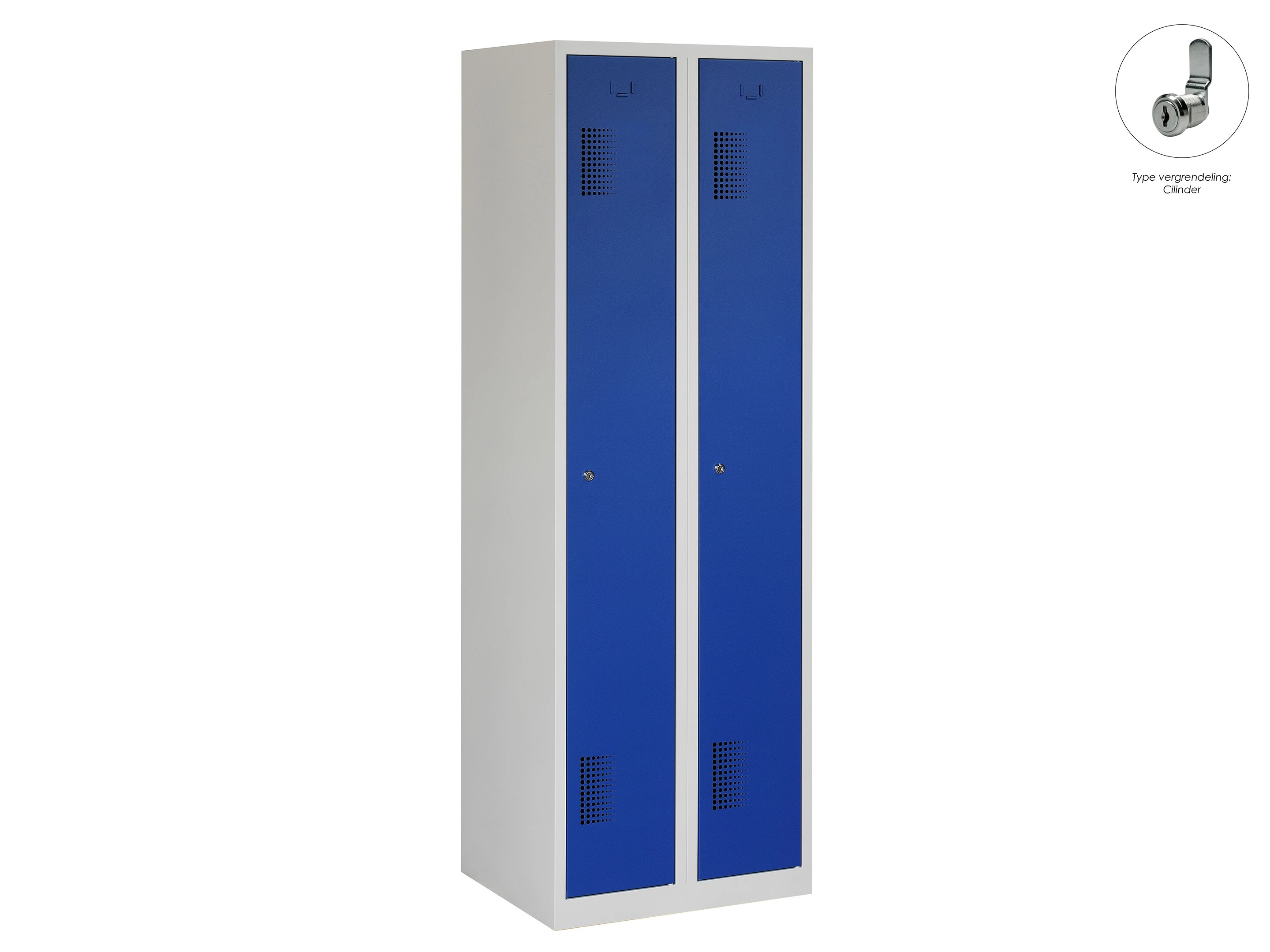 Type deuren: draaideur (geperforeerd), type slot: cilinderslot. Kleur romp: grijs (RAL7035), kleur deuren: blauw (RAL5010). Afmeting: 180x60x50 cm (HxBxD). Indeling: Legbord & kledingroede Aantal deuren: 2, aantal sleutels: 2.