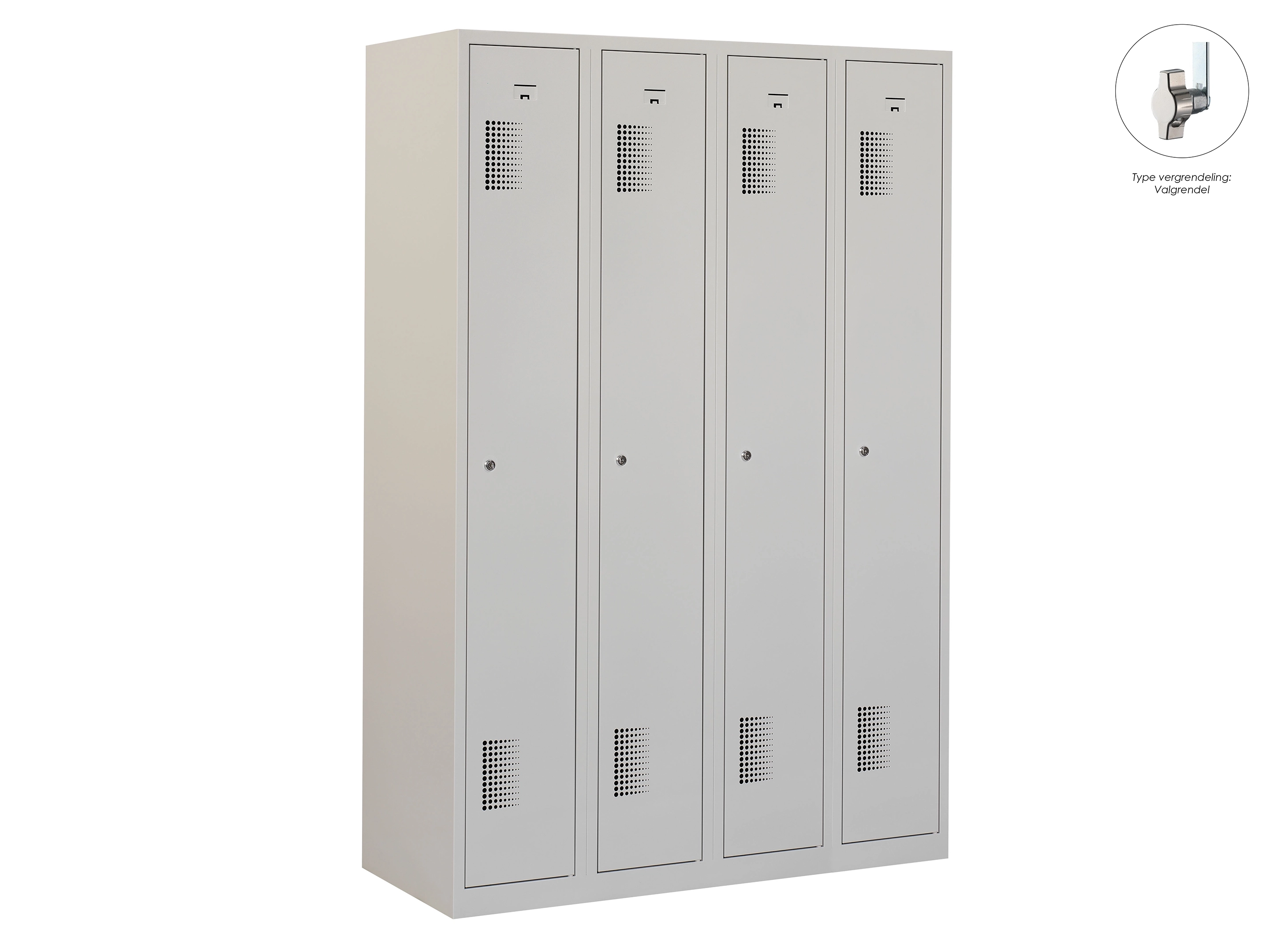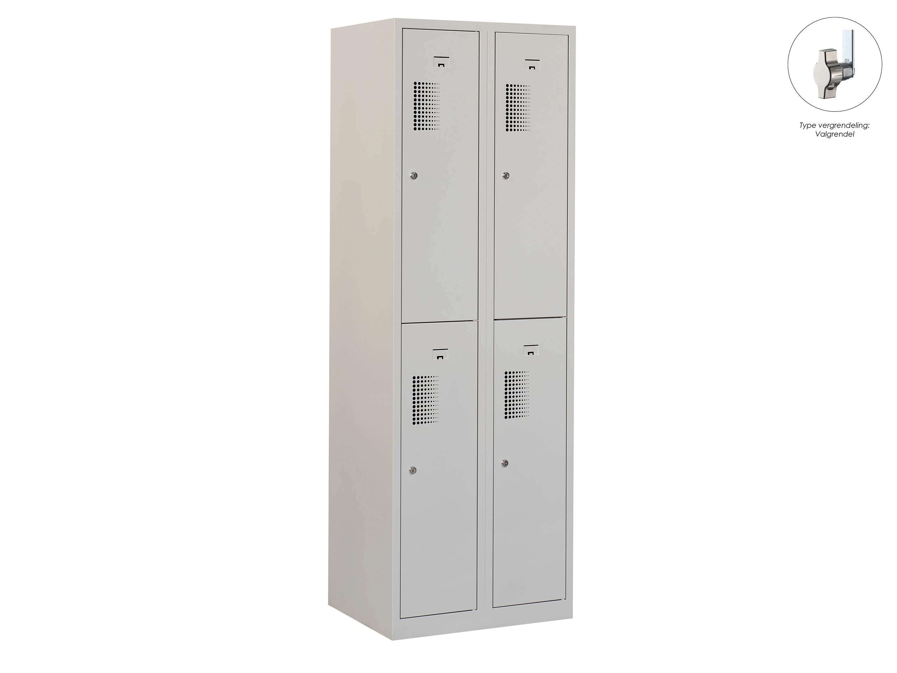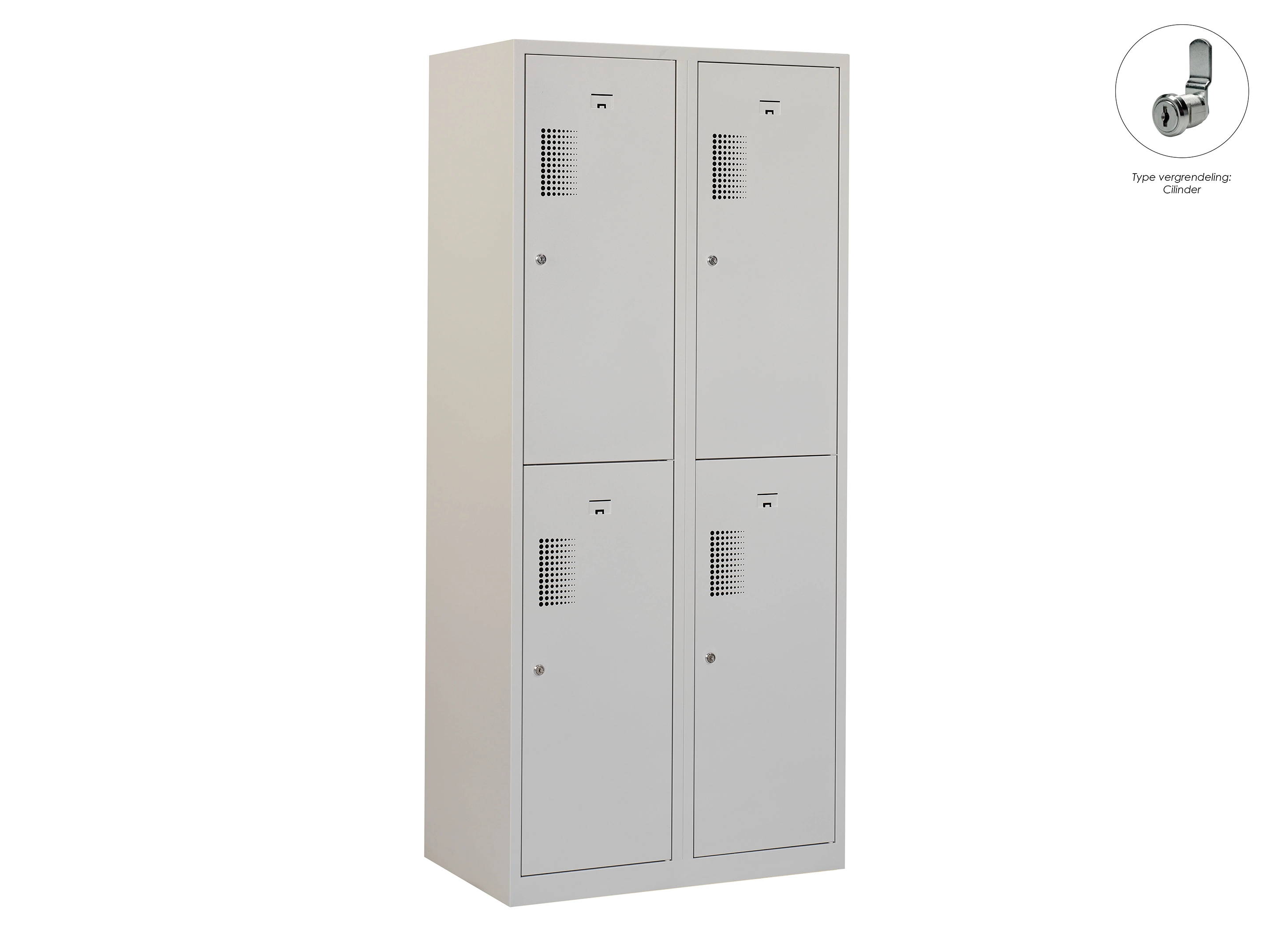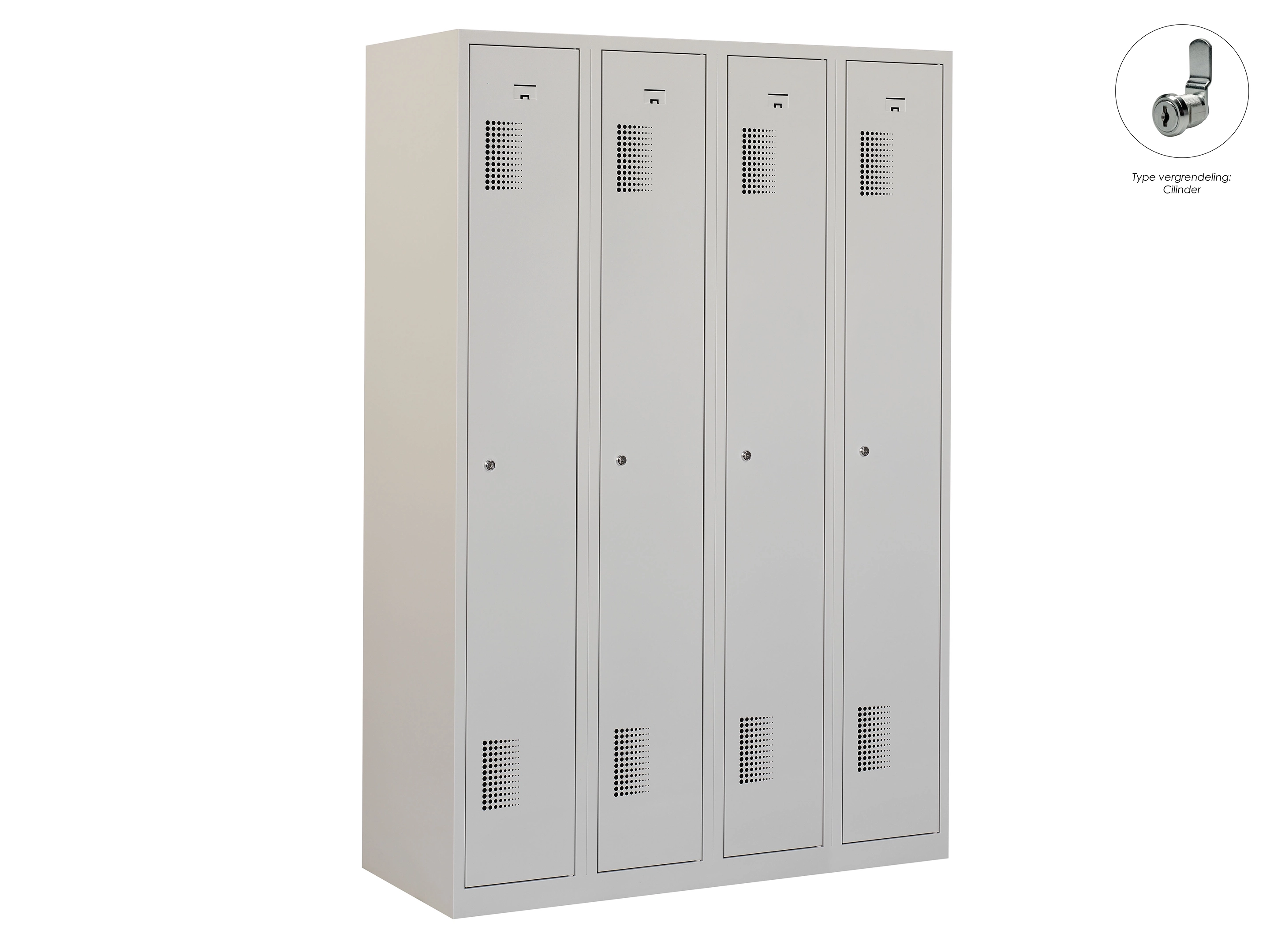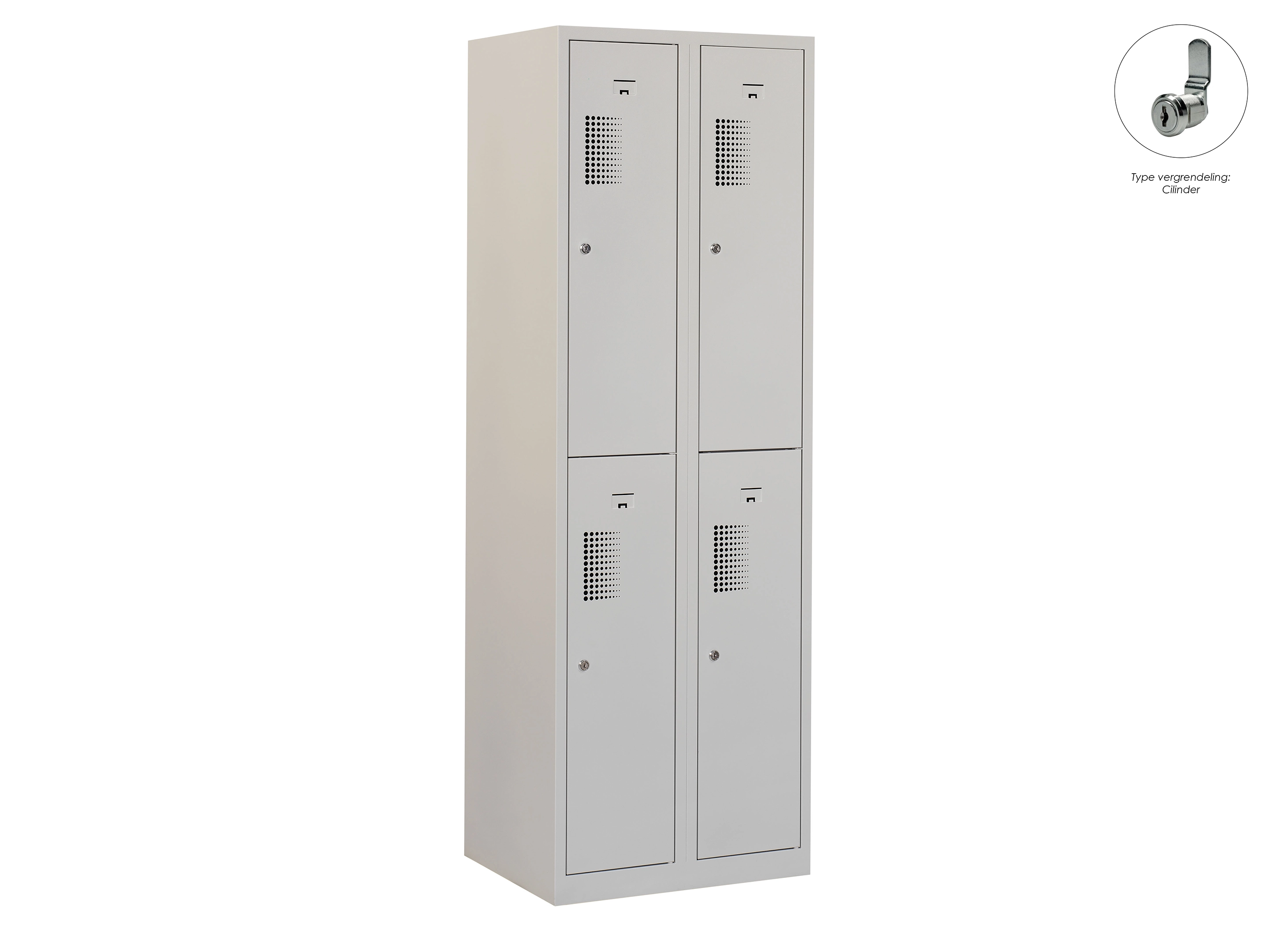Type deuren: draaideur (geperforeerd), type slot: valgrendelslot. Kleur romp: grijs (RAL7035), kleur deuren: grijs (RAL7035). Afmeting: 180x60x50 cm (HxBxD). Indeling: Kledingroede Aantal deuren: 4, aantal sleutels: geen.