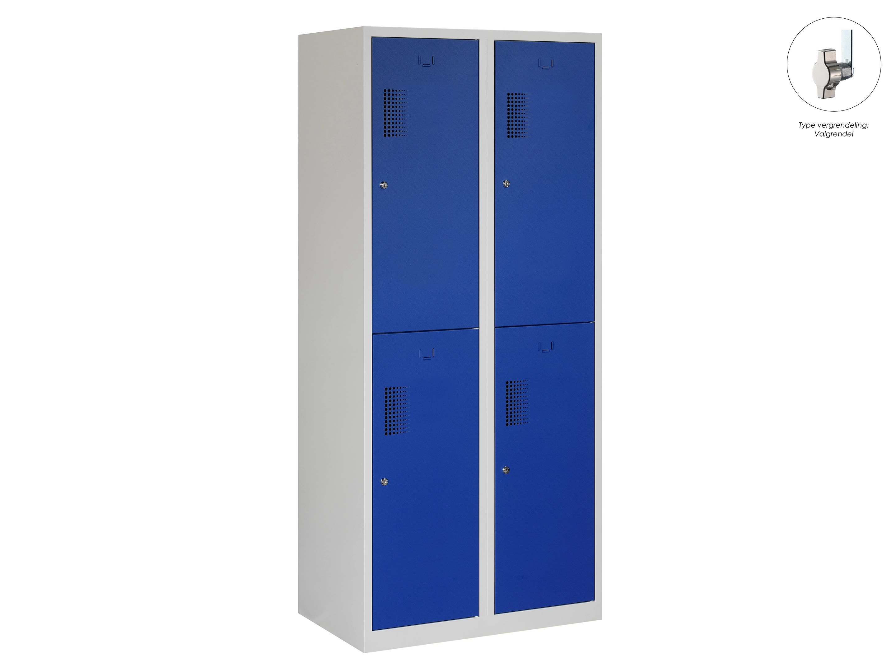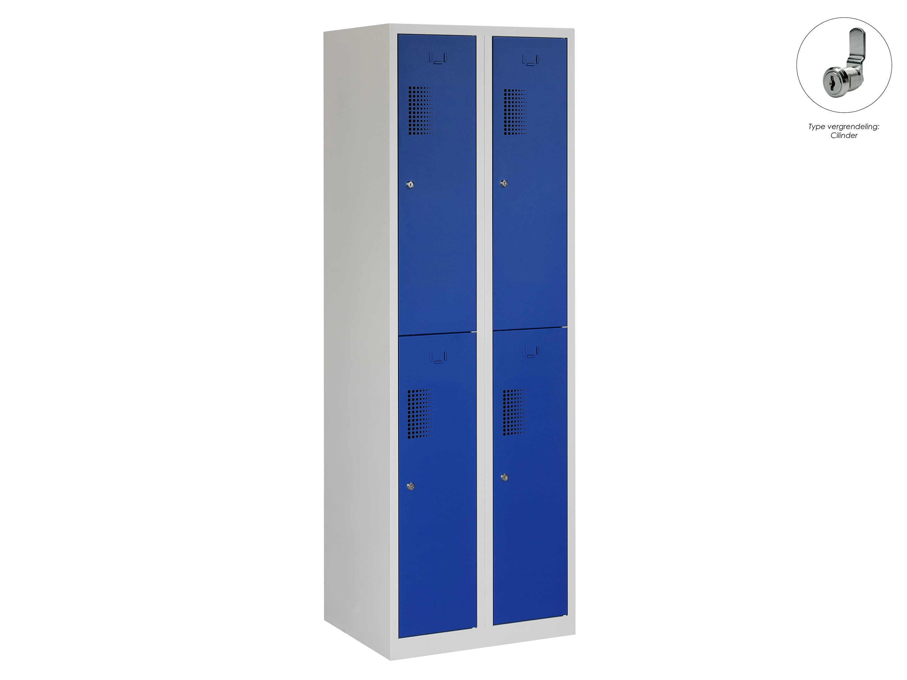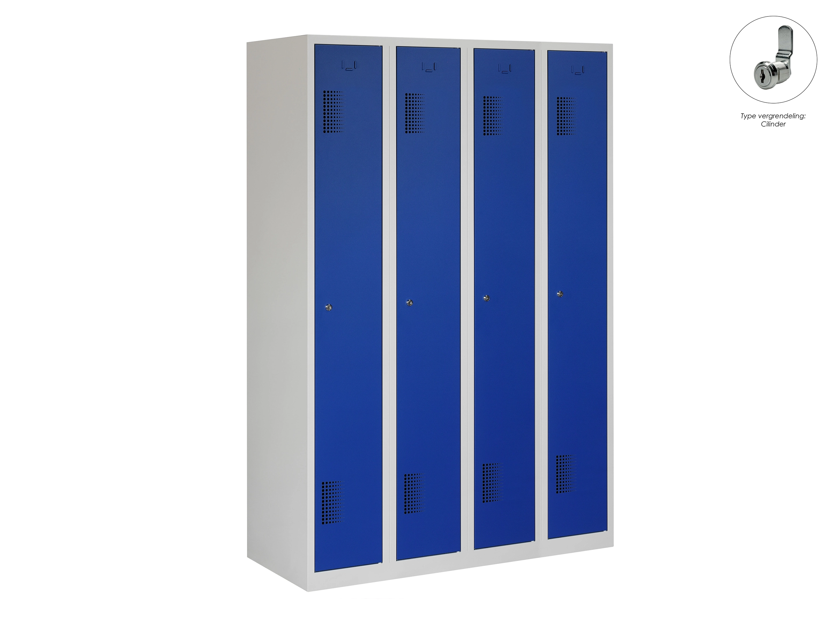 Type deuren: draaideur (geperforeerd), type slot: valgrendelslot. Kleur romp: grijs (RAL7035), kleur deuren: blauw (RAL5010). Afmeting: 180x60x50 cm (HxBxD). Indeling: Kledingroede Aantal deuren: 4, aantal sleutels: geen.