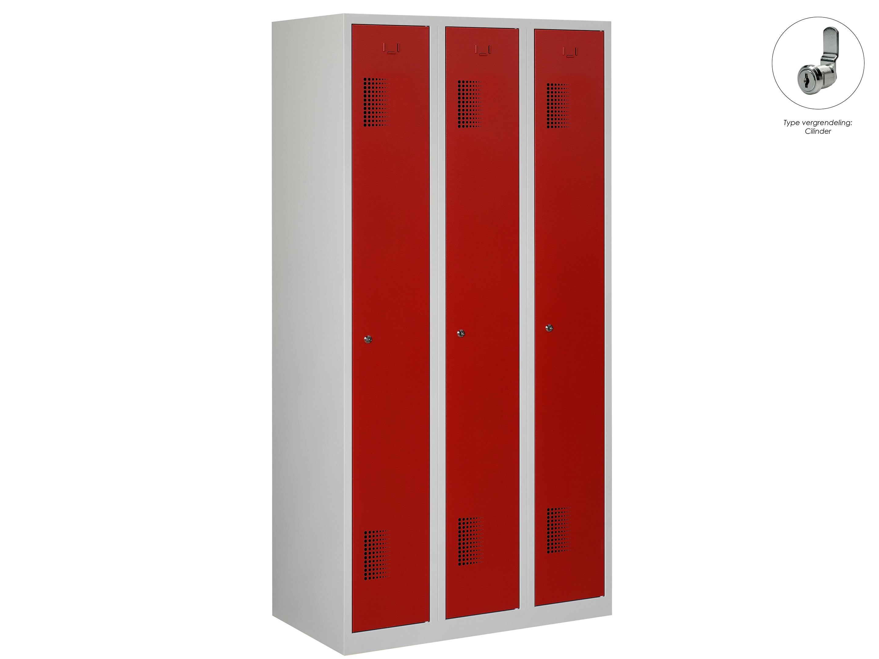 Type deuren: draaideur (geperforeerd), type slot: cilinderslot. Kleur romp: grijs (RAL7035), kleur deuren: rood (RAL3000). Afmeting: 180x90x50 cm (HxBxD). Indeling: Legbord & kledingroede Aantal deuren: 3, aantal sleutels: 2.