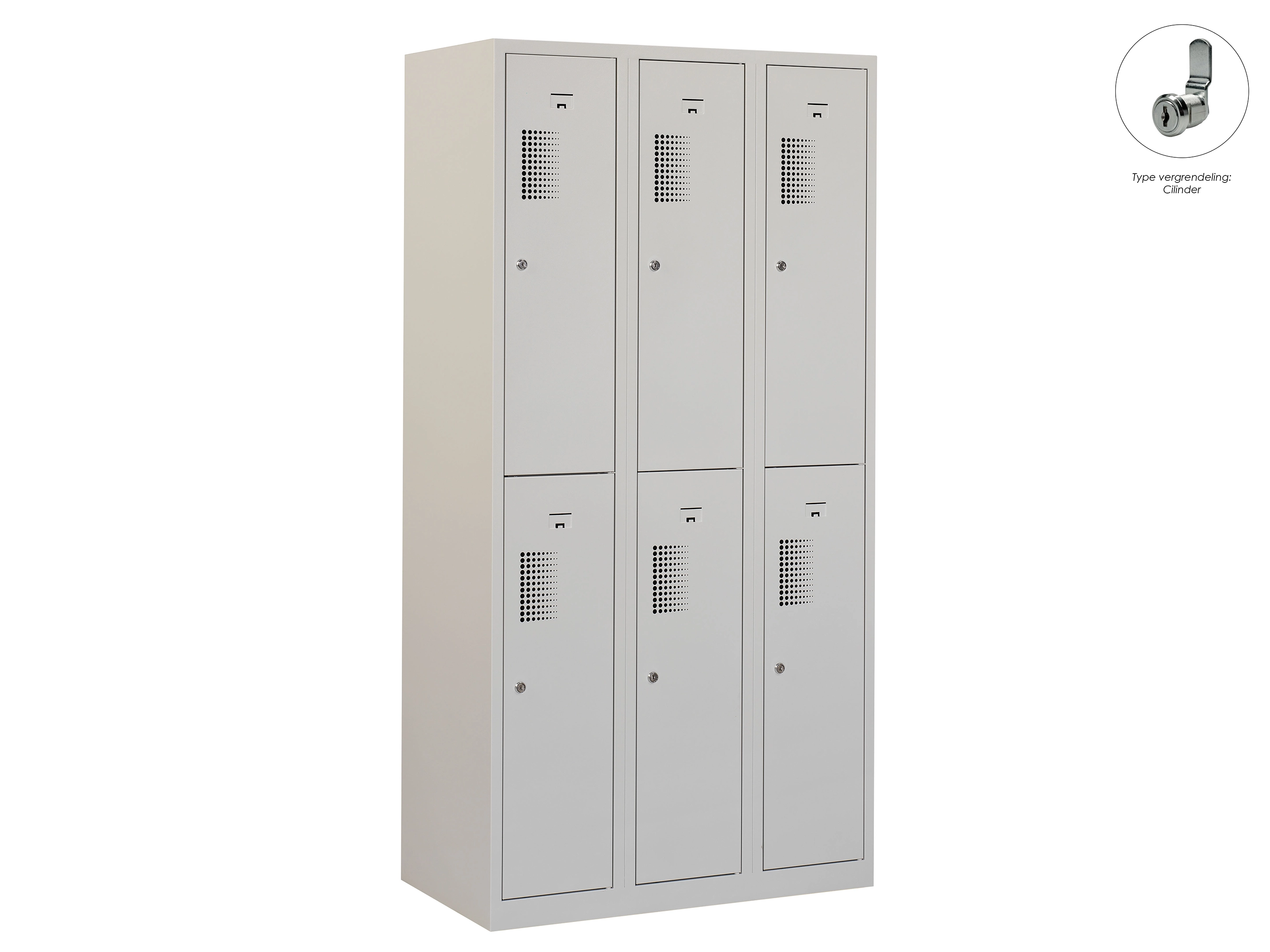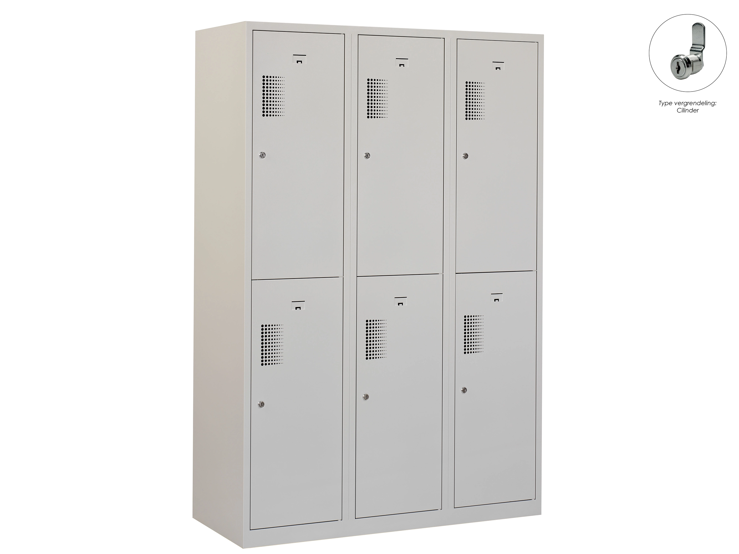 Type deuren: draaideur (geperforeerd), type slot: cilinderslot. Kleur romp: grijs (RAL7035), kleur deuren: grijs (RAL7035). Afmeting: 180x90x50 cm (HxBxD). Indeling: Kledingroede Aantal deuren: 6, aantal sleutels: 2.
