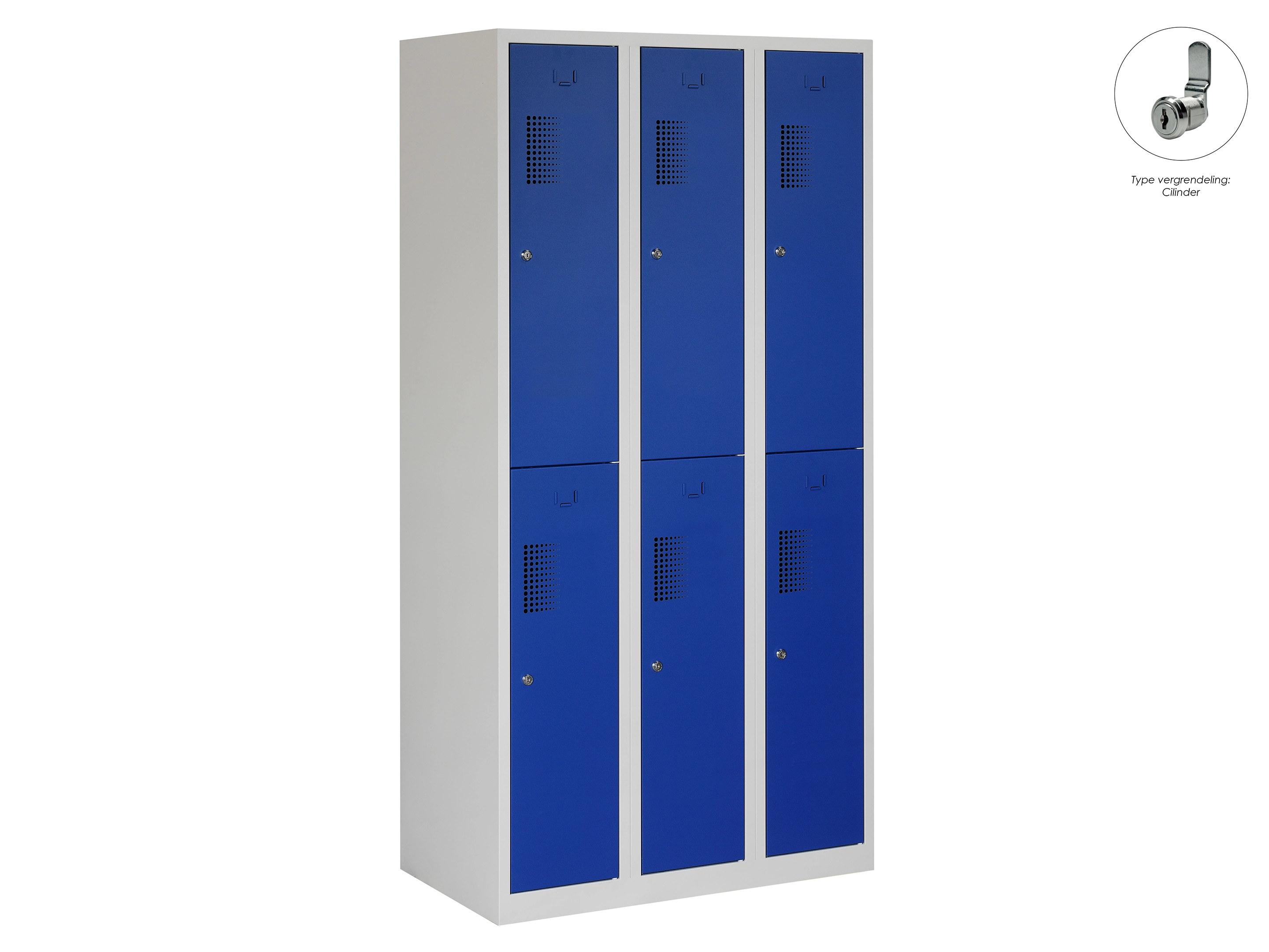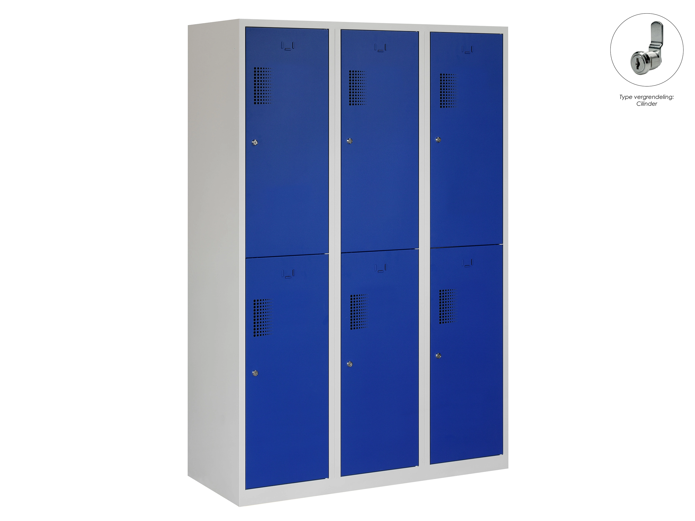 Type deuren: draaideur (geperforeerd), type slot: cilinderslot. Kleur romp: grijs (RAL7035), kleur deuren: blauw (RAL5010). Afmeting: 180x120x50 cm (HxBxD). Indeling: Kledingroede Aantal deuren: 6, aantal sleutels: 2.