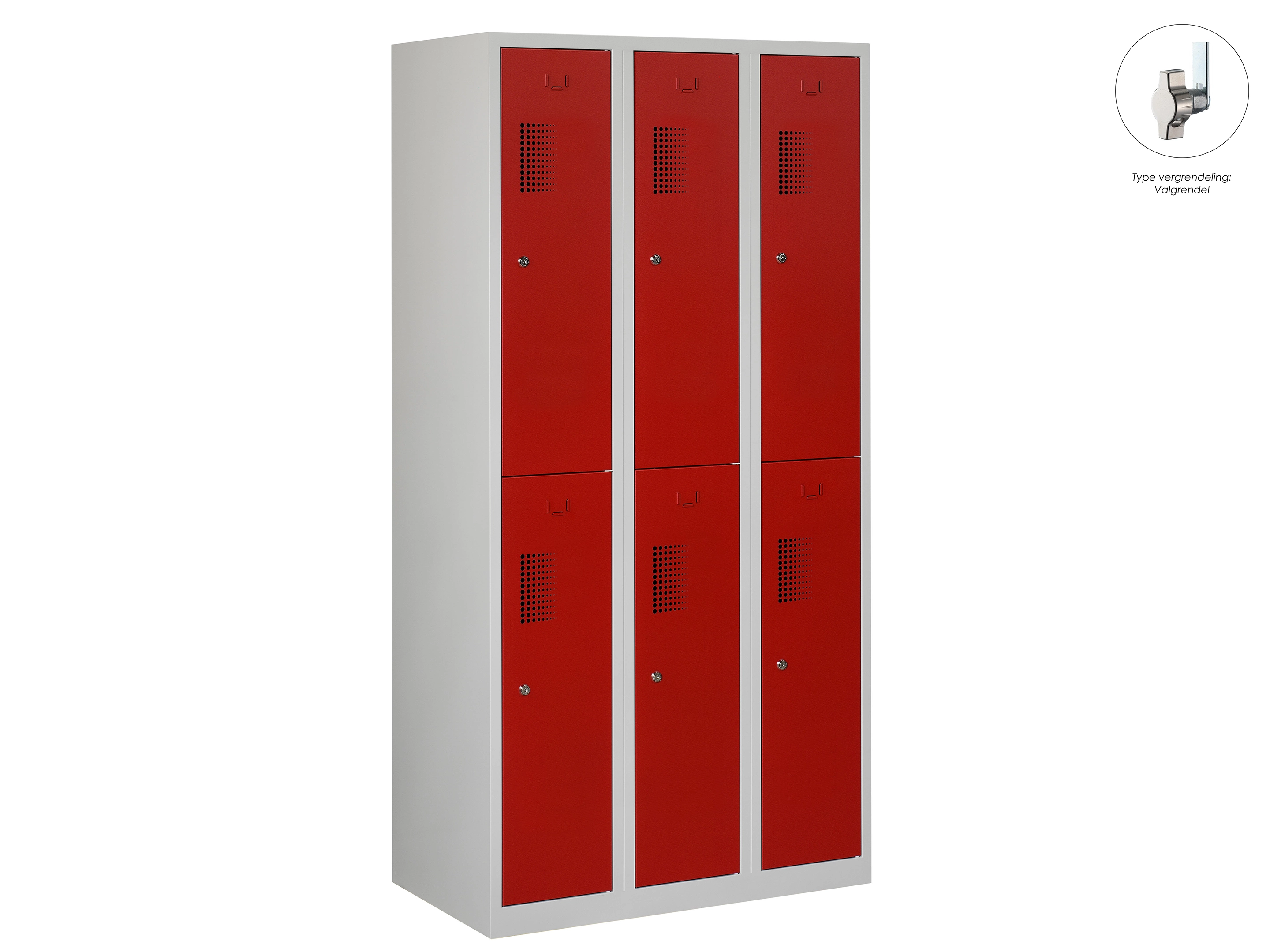Type deuren: draaideur (geperforeerd), type slot: valgrendelslot. Kleur romp: grijs (RAL7035), kleur deuren: rood (RAL3000). Afmeting: 180x90x50 cm (HxBxD). Indeling: Kledingroede Aantal deuren: 6, aantal sleutels: geen.