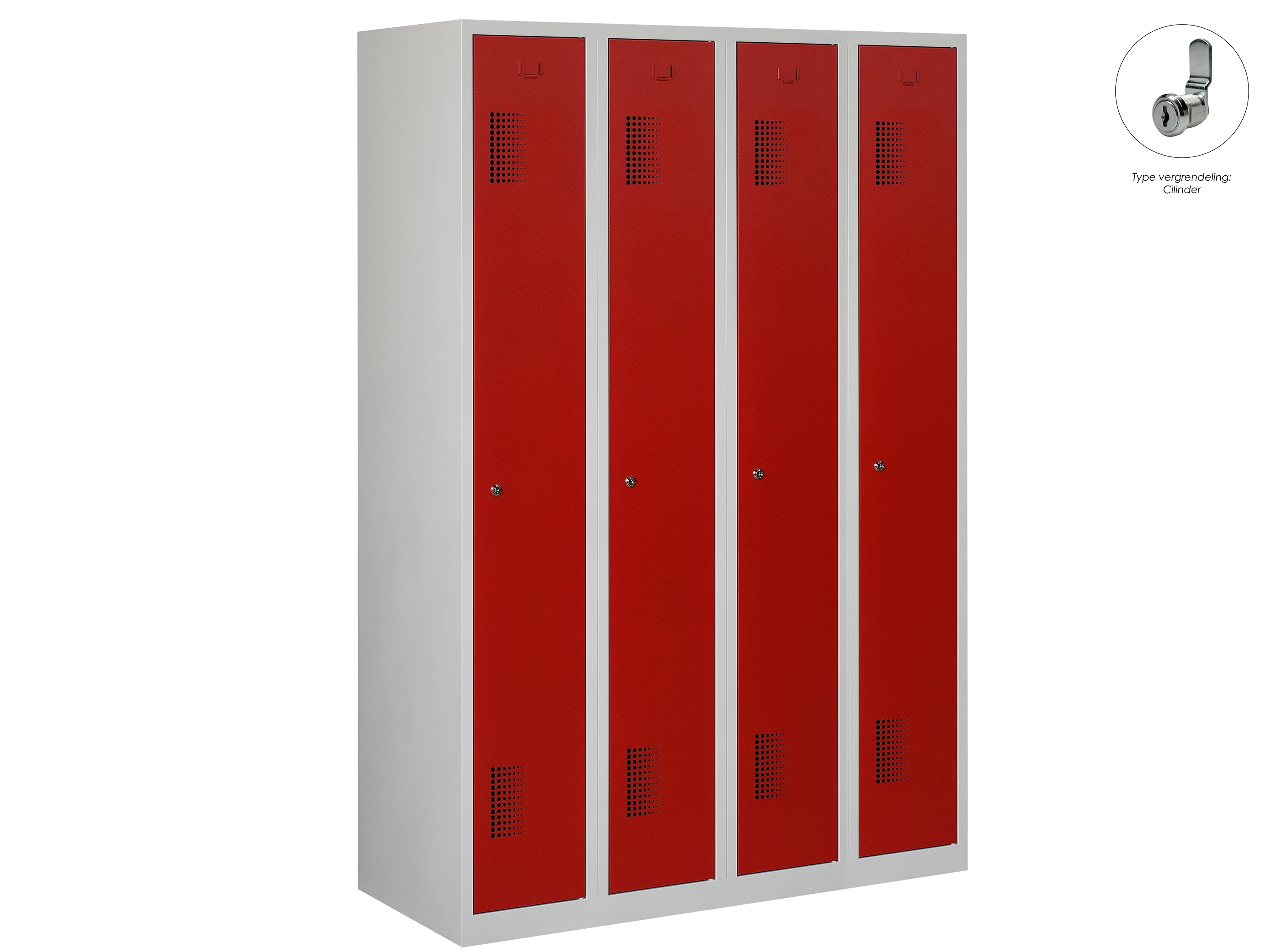 Type deuren: draaideur (geperforeerd), type slot: valgrendelslot. Kleur romp: grijs (RAL7035), kleur deuren: rood (RAL3000). Afmeting: 180x60x50 cm (HxBxD). Indeling: Kledingroede Aantal deuren: 4, aantal sleutels: geen.