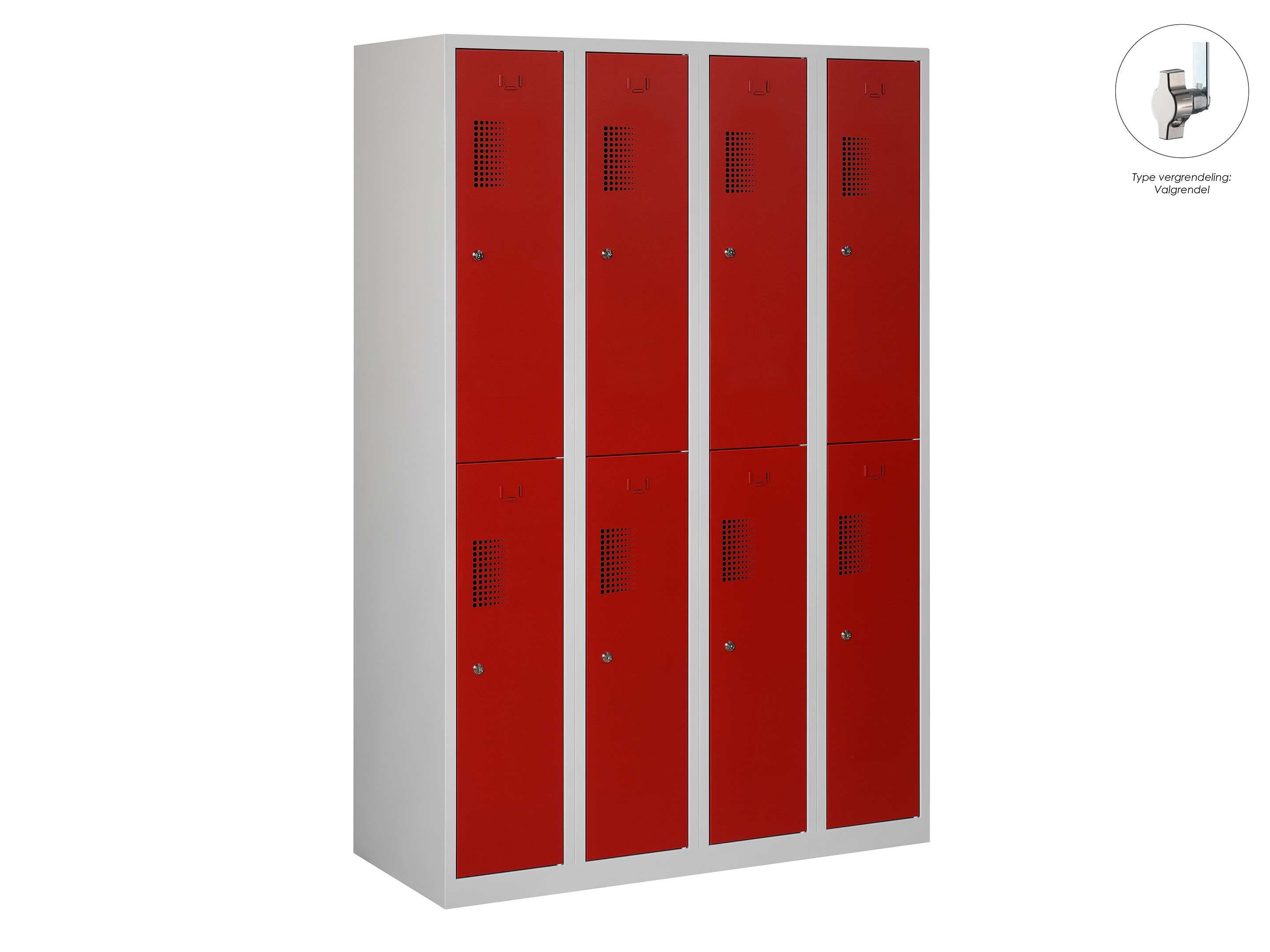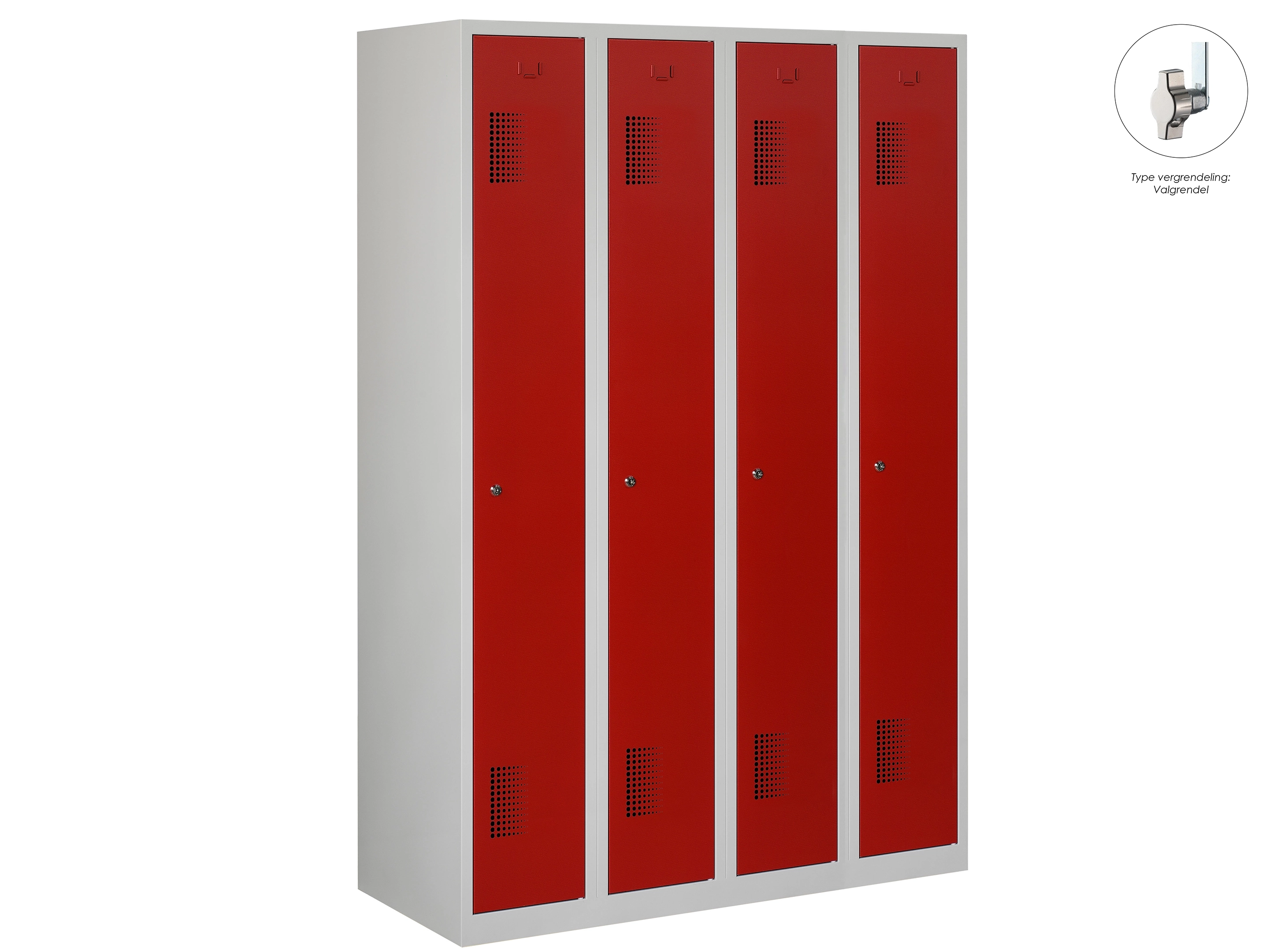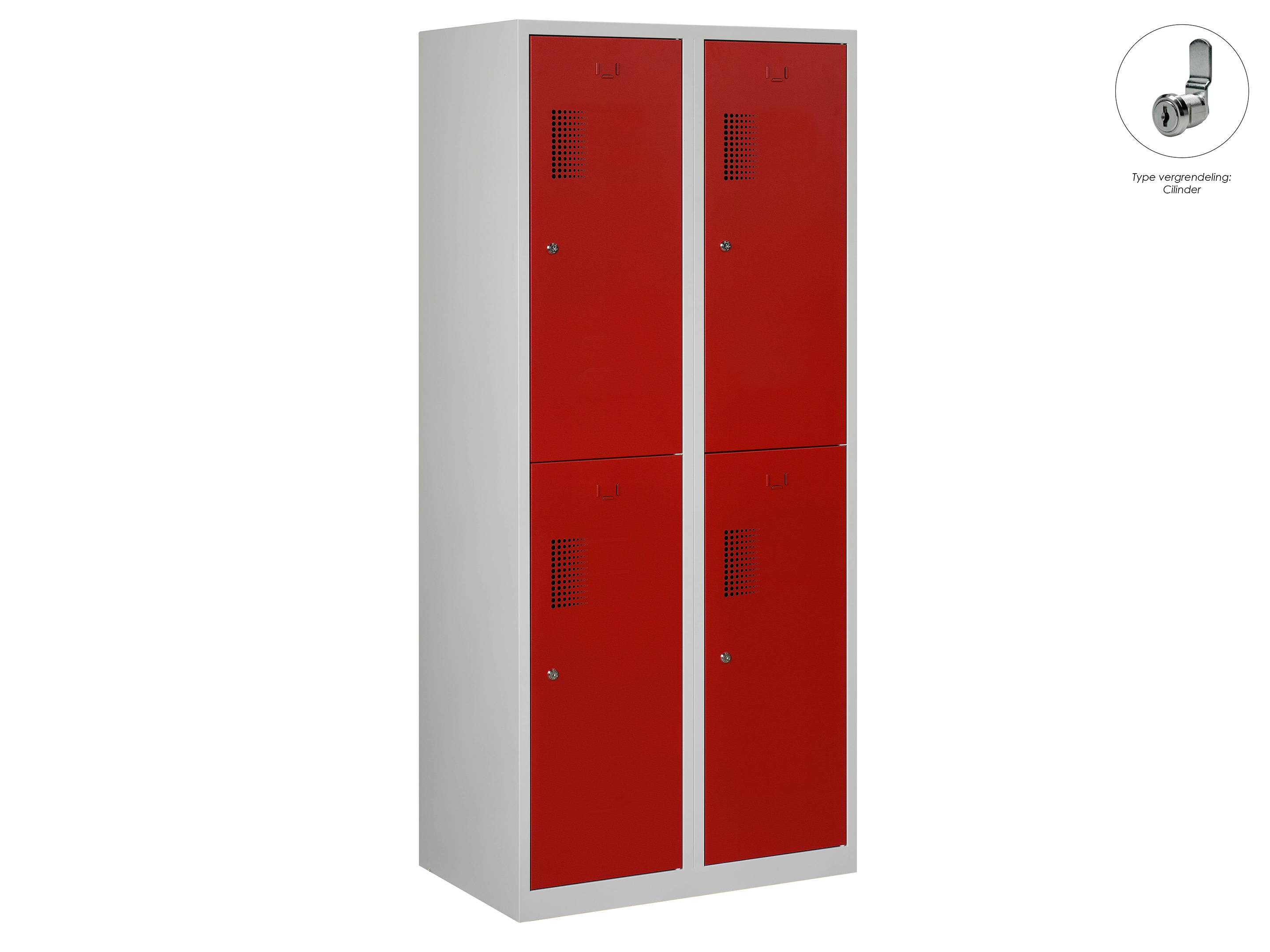 Type deuren: draaideur (geperforeerd), type slot: valgrendelslot. Kleur romp: grijs (RAL7035), kleur deuren: rood (RAL3000). Afmeting: 180x80x50 cm (HxBxD). Indeling: Kledingroede Aantal deuren: 4, aantal sleutels: geen.