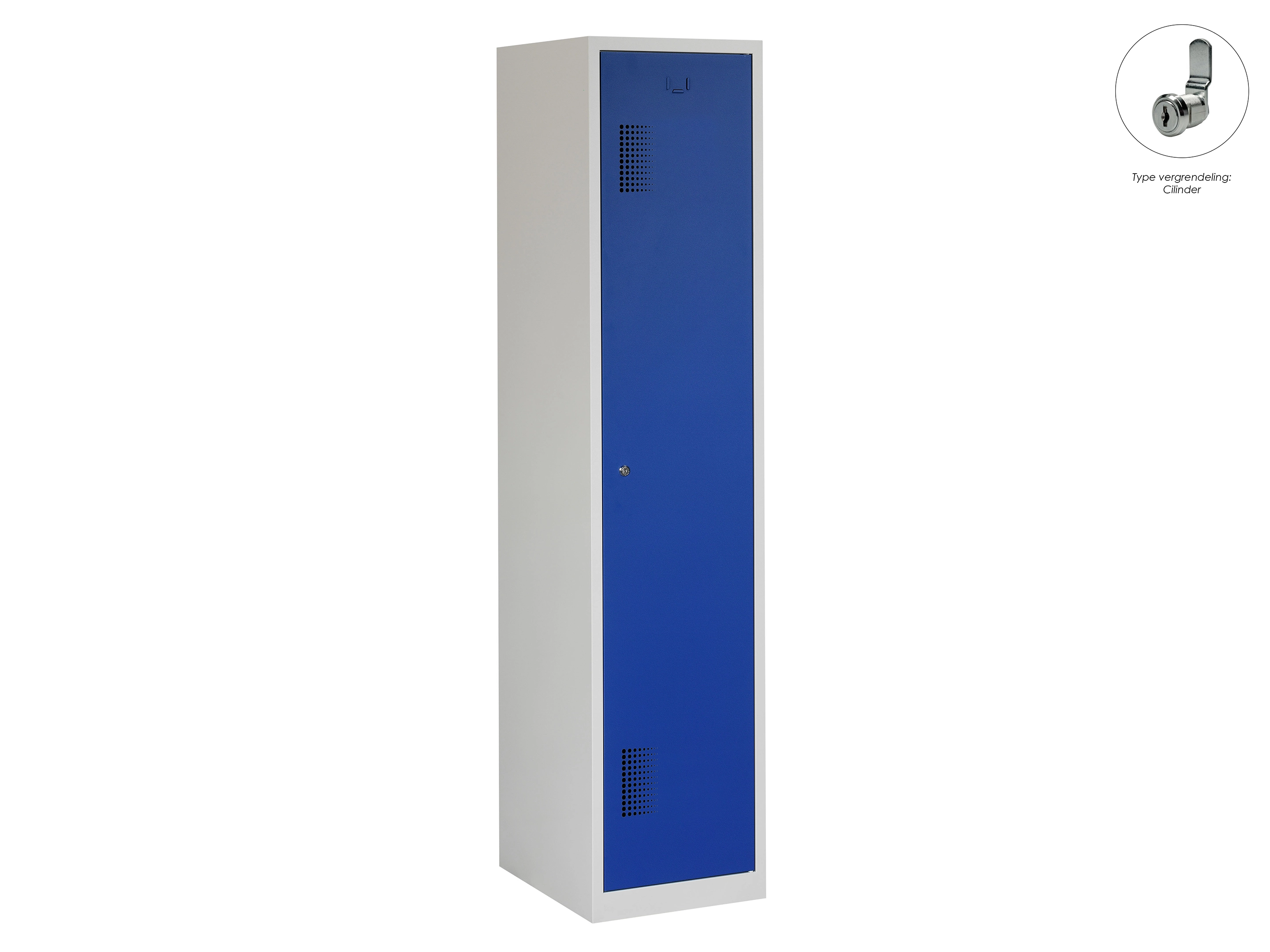 Type deuren: draaideur (geperforeerd), type slot: cilinderslot. Kleur romp: grijs (RAL7035), kleur deuren: blauw (RAL5010). Afmeting: 180x30x50 cm (HxBxD). Indeling: Legbord & kledingroede Aantal deuren: 1, aantal sleutels: 2.