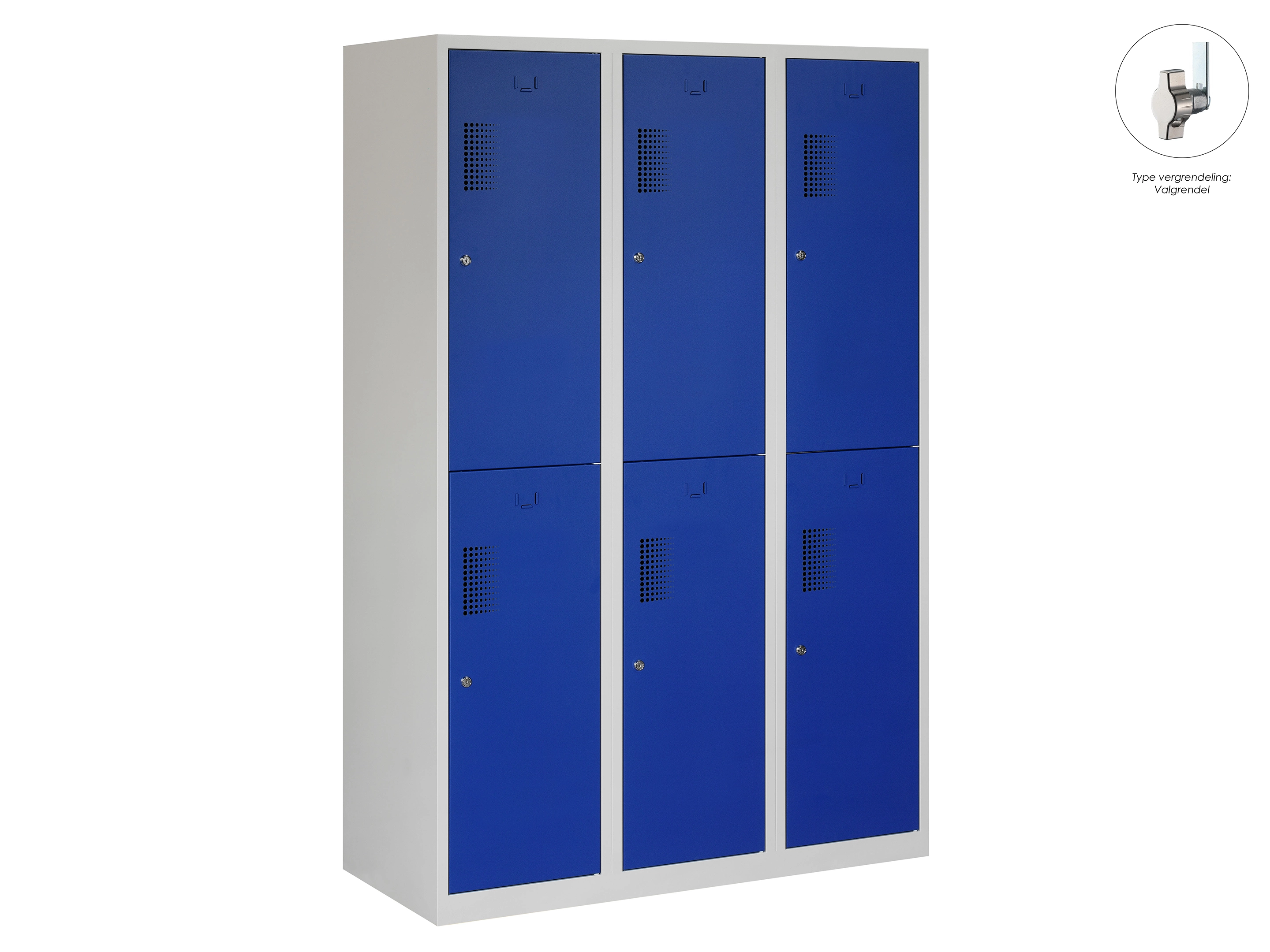 Type deuren: draaideur (geperforeerd), type slot: valgrendelslot. Kleur romp: grijs (RAL7035), kleur deuren: blauw (RAL5010). Afmeting: 180x90x50 cm (HxBxD). Indeling: Kledingroede Aantal deuren: 6, aantal sleutels: geen.