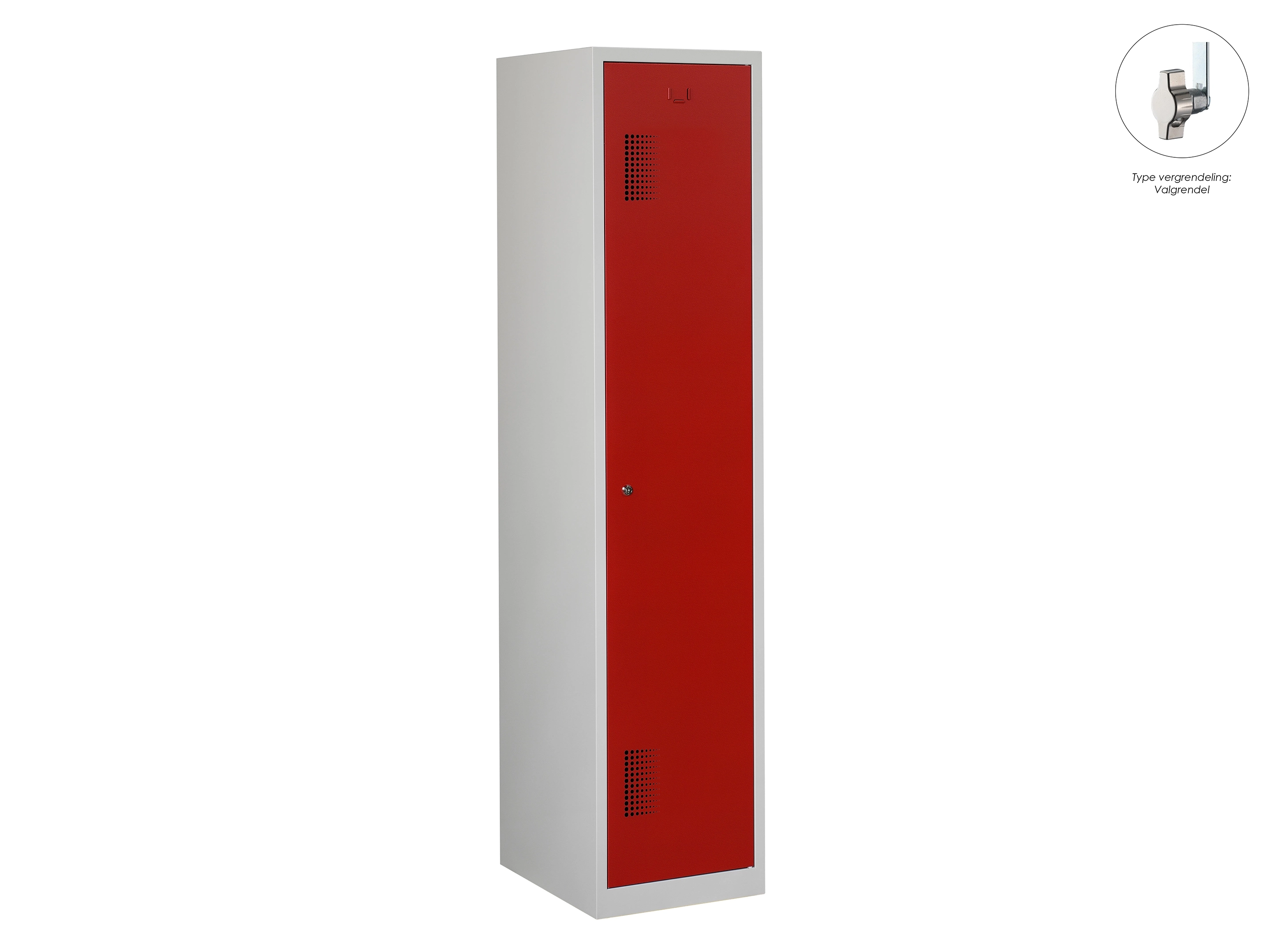 Type deuren: draaideur (geperforeerd), type slot: valgrendelslot. Kleur romp: grijs (RAL7035), kleur deuren: rood (RAL3000). Afmeting: 180x40x50 cm (HxBxD). Indeling: Kledingroede Aantal deuren: 2, aantal sleutels: geen.