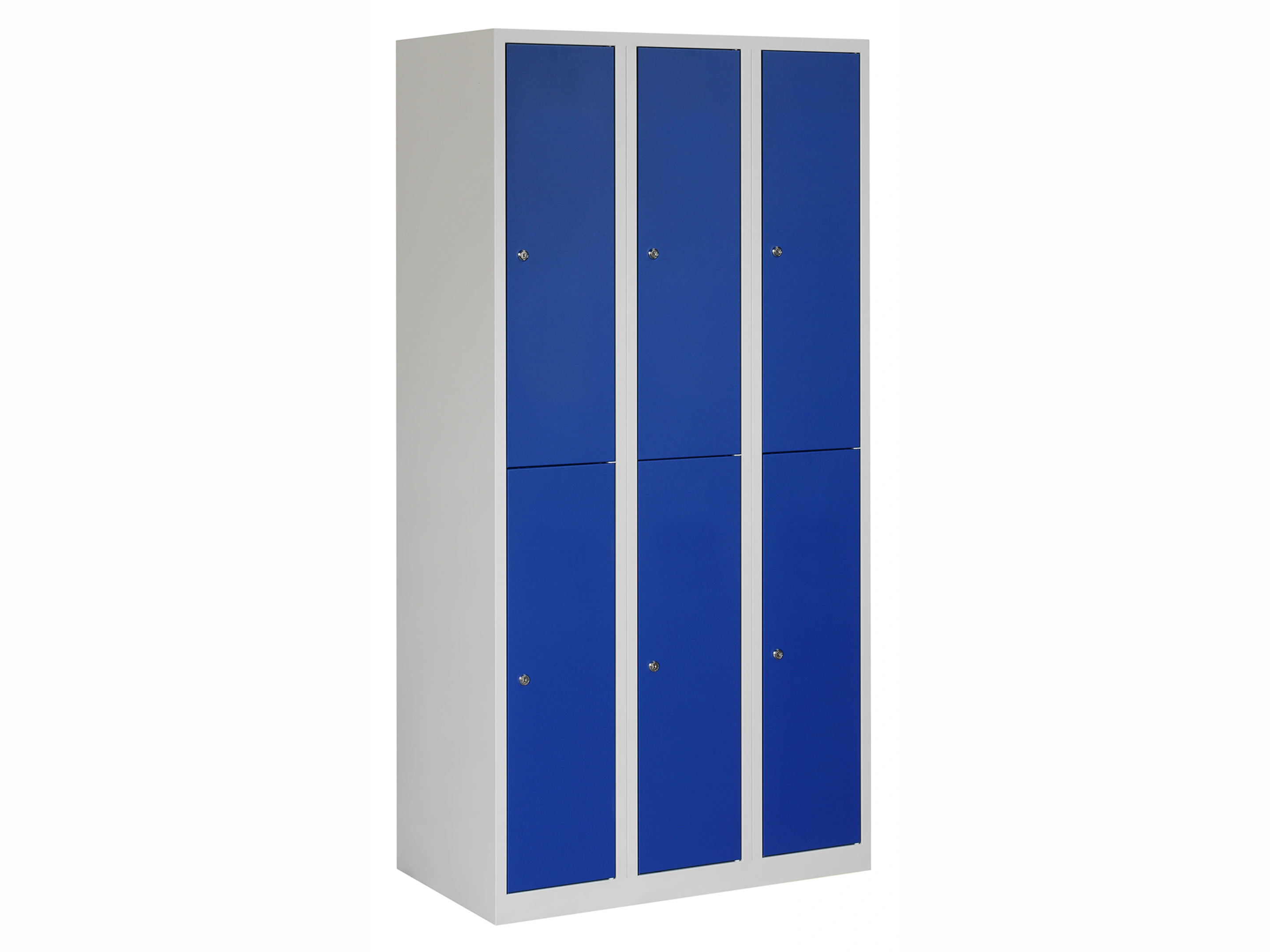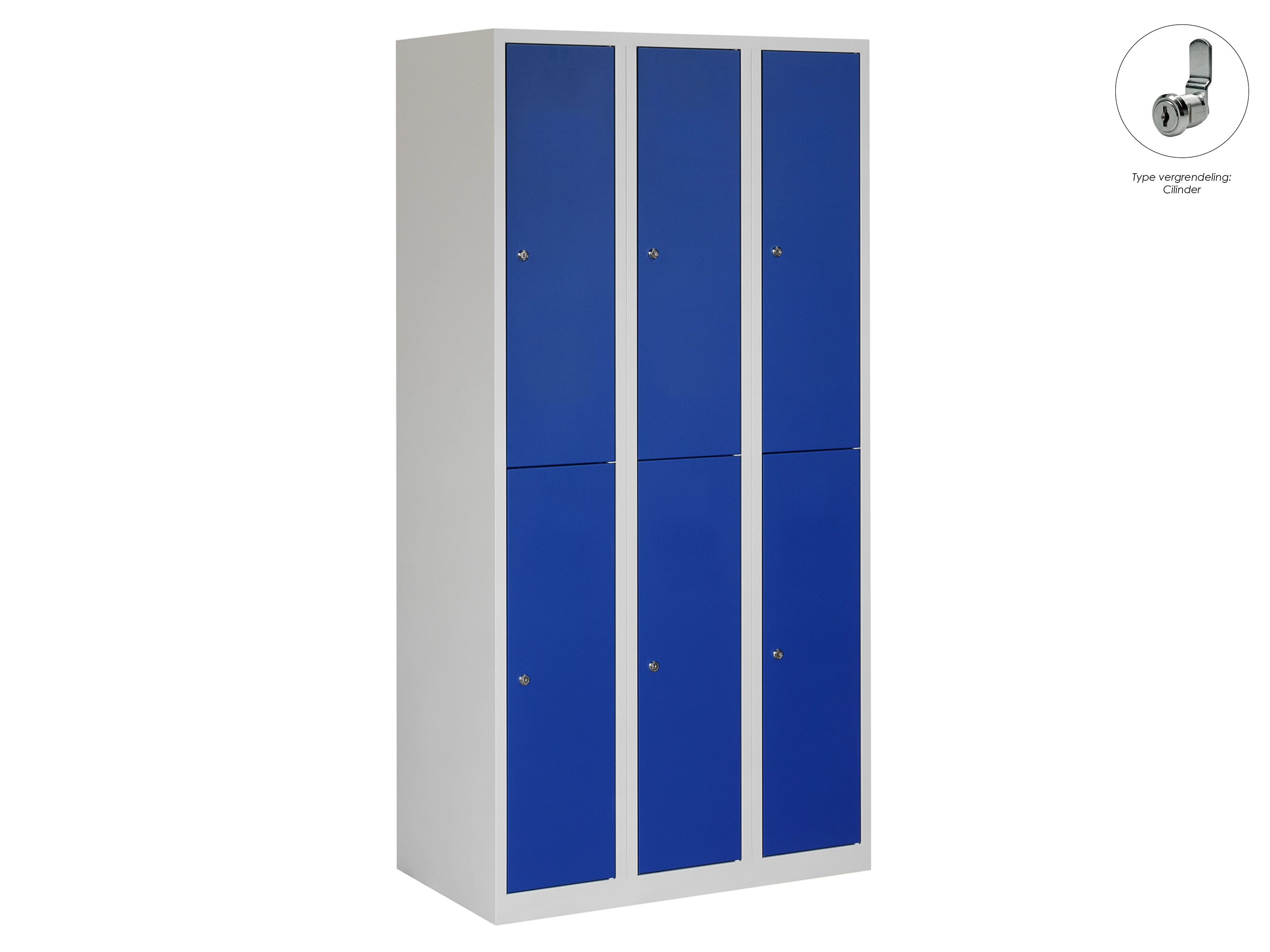 Type deuren: draaideur (glad zonder naamkaarthouder), type slot: cilinderslot. Kleur romp: grijs (RAL7035), kleur deuren: blauw (RAL5010). Afmeting: 180x90x50 cm (HxBxD). Indeling: Kledingroede Aantal deuren: 6, aantal sleutels: 2.