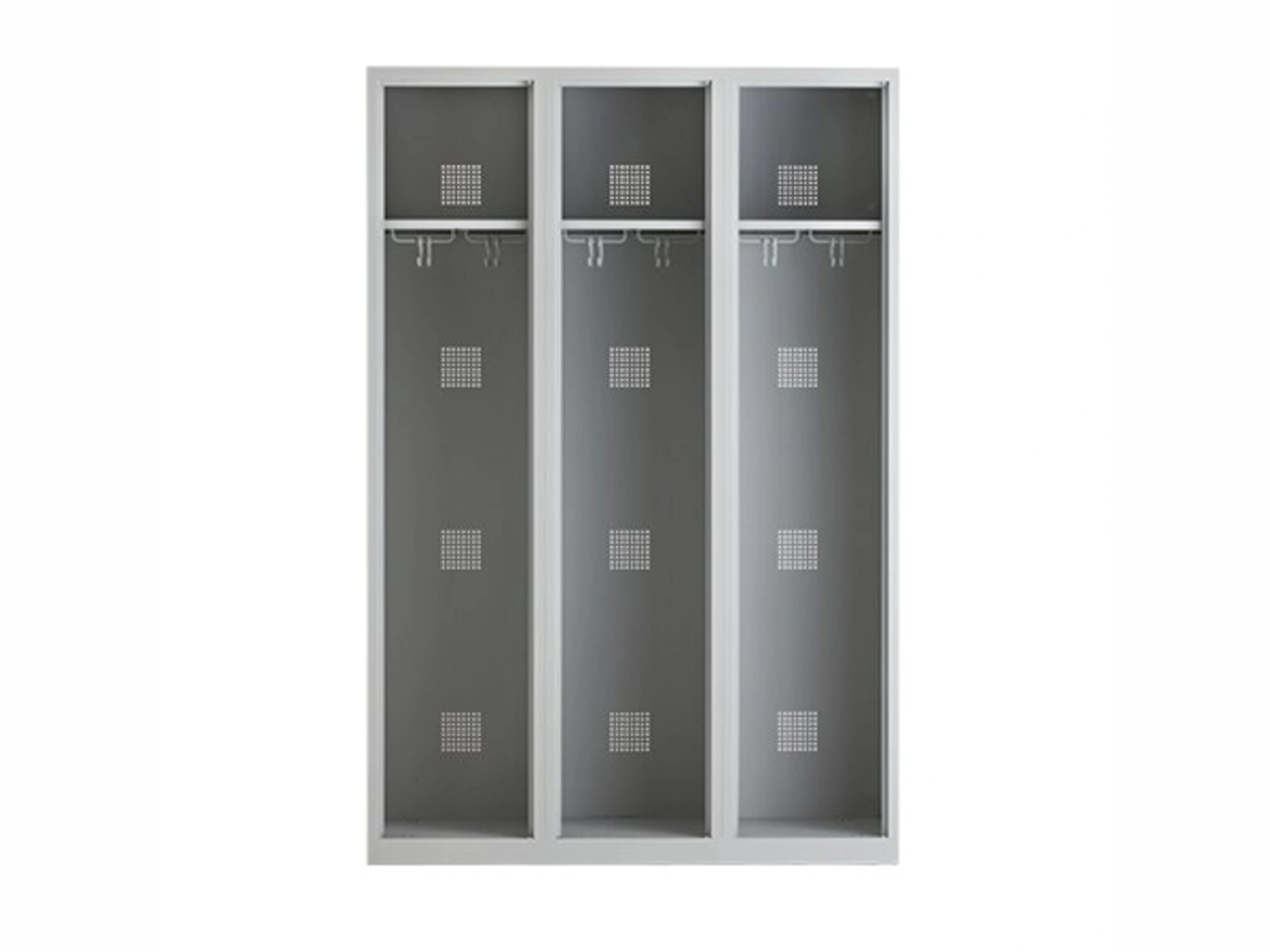 Type deuren: draaideur (ventilatiesleuven), type slot: valgrendelslot. Kleur romp: grijs (RAL7035), kleur deuren: grijs (RAL7035). Afmeting: 180x120x50 cm (HxBxD). Indeling: Legbord & kledingroede Aantal deuren: 3, aantal sleutels: geen.