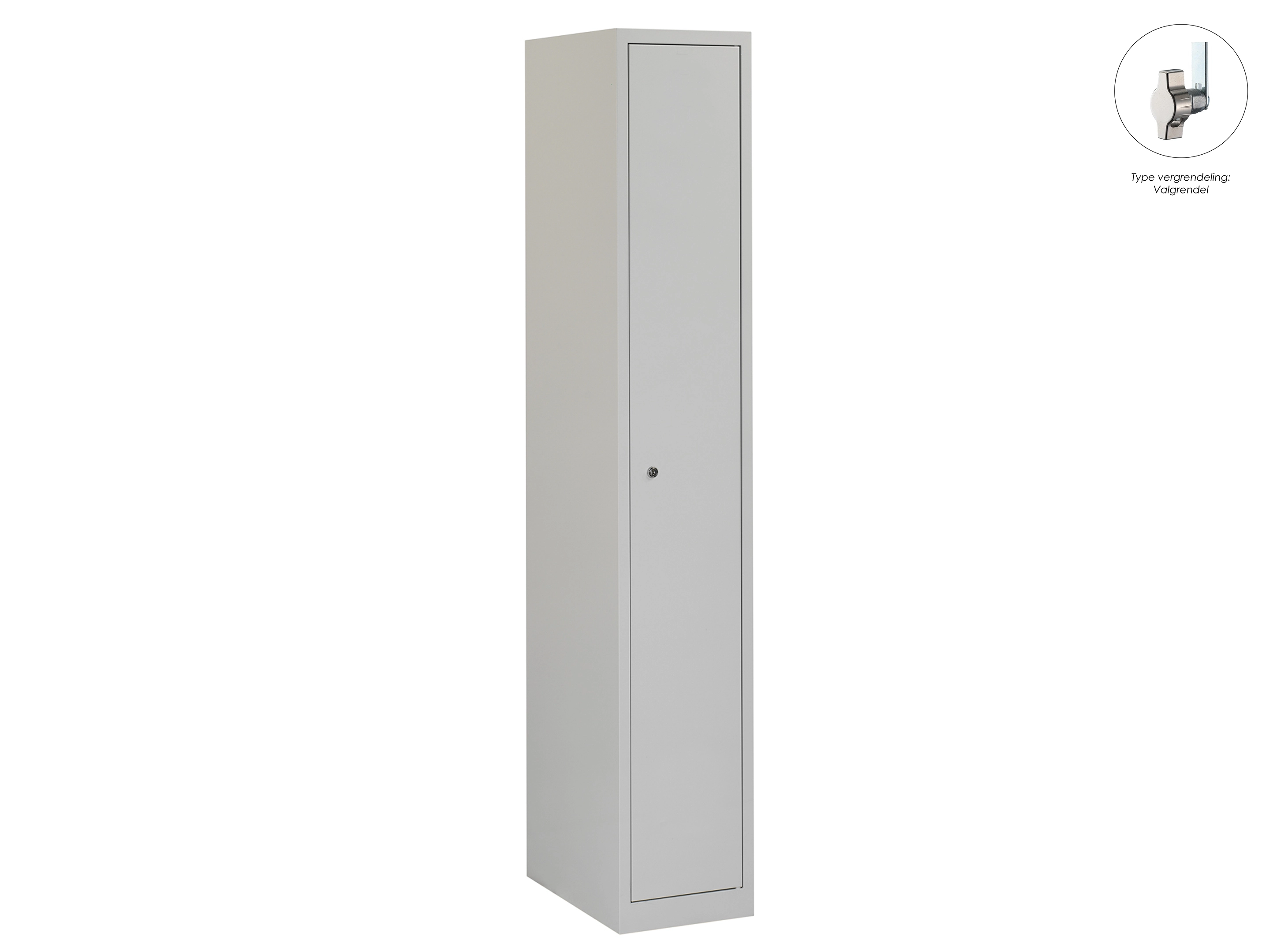Type deuren: draaideur (glad zonder naamkaarthouder), type slot: valgrendelslot. Kleur romp: grijs (RAL7035), kleur deuren: grijs (RAL7035). Afmeting: 180x30x50 cm (HxBxD). Indeling: Legbord & kledingroede Aantal deuren: 1, aantal sleutels: geen.