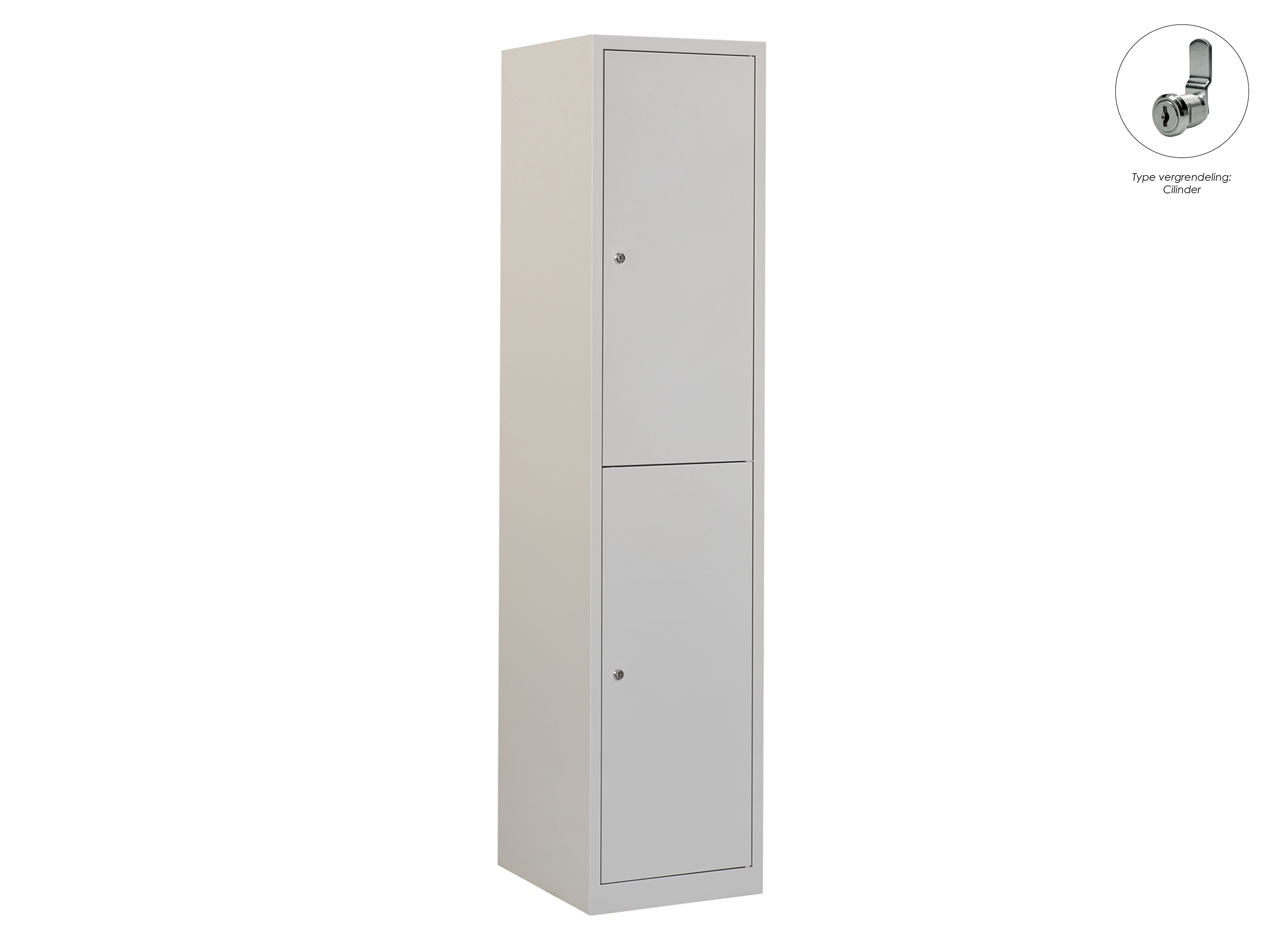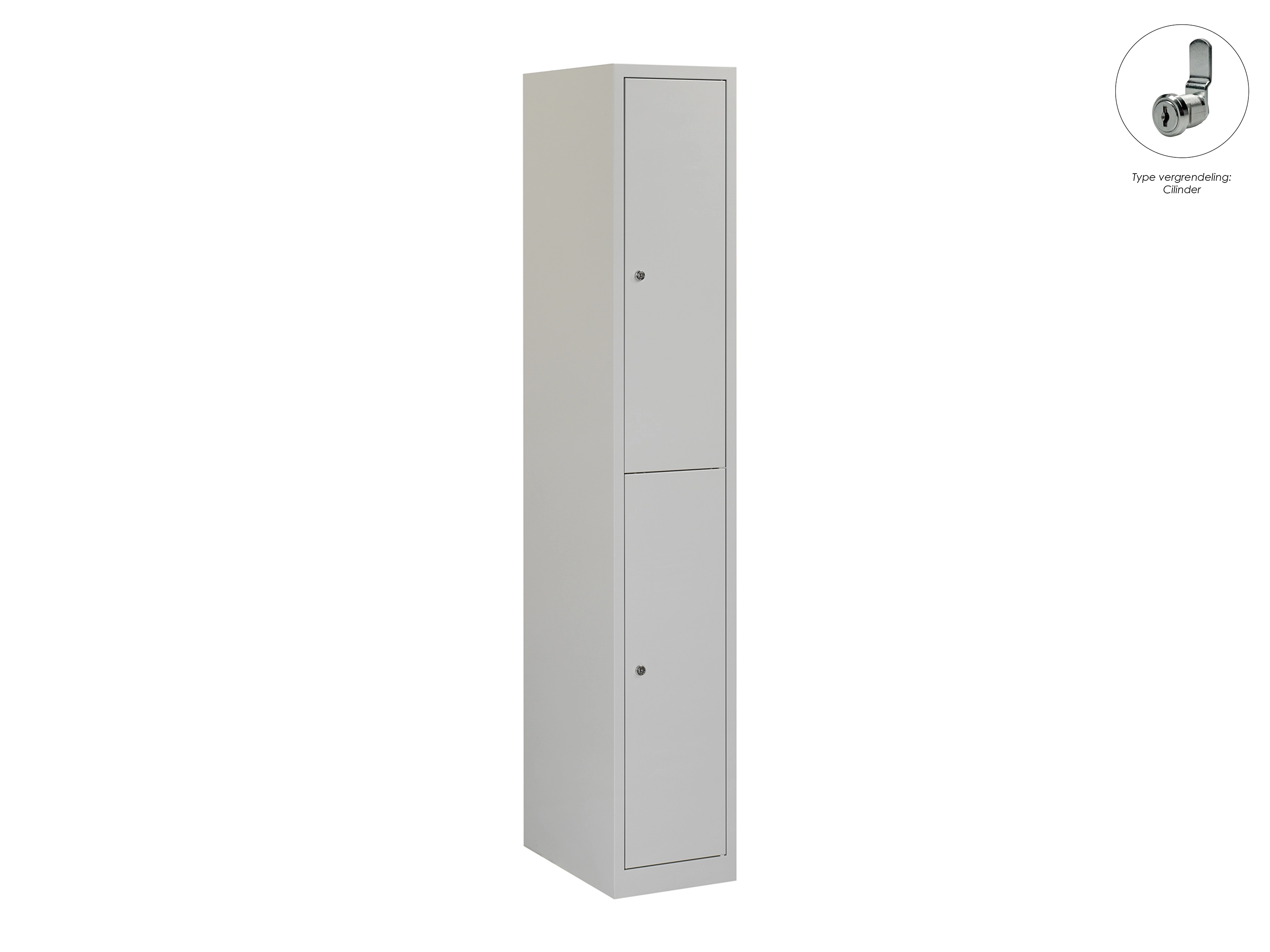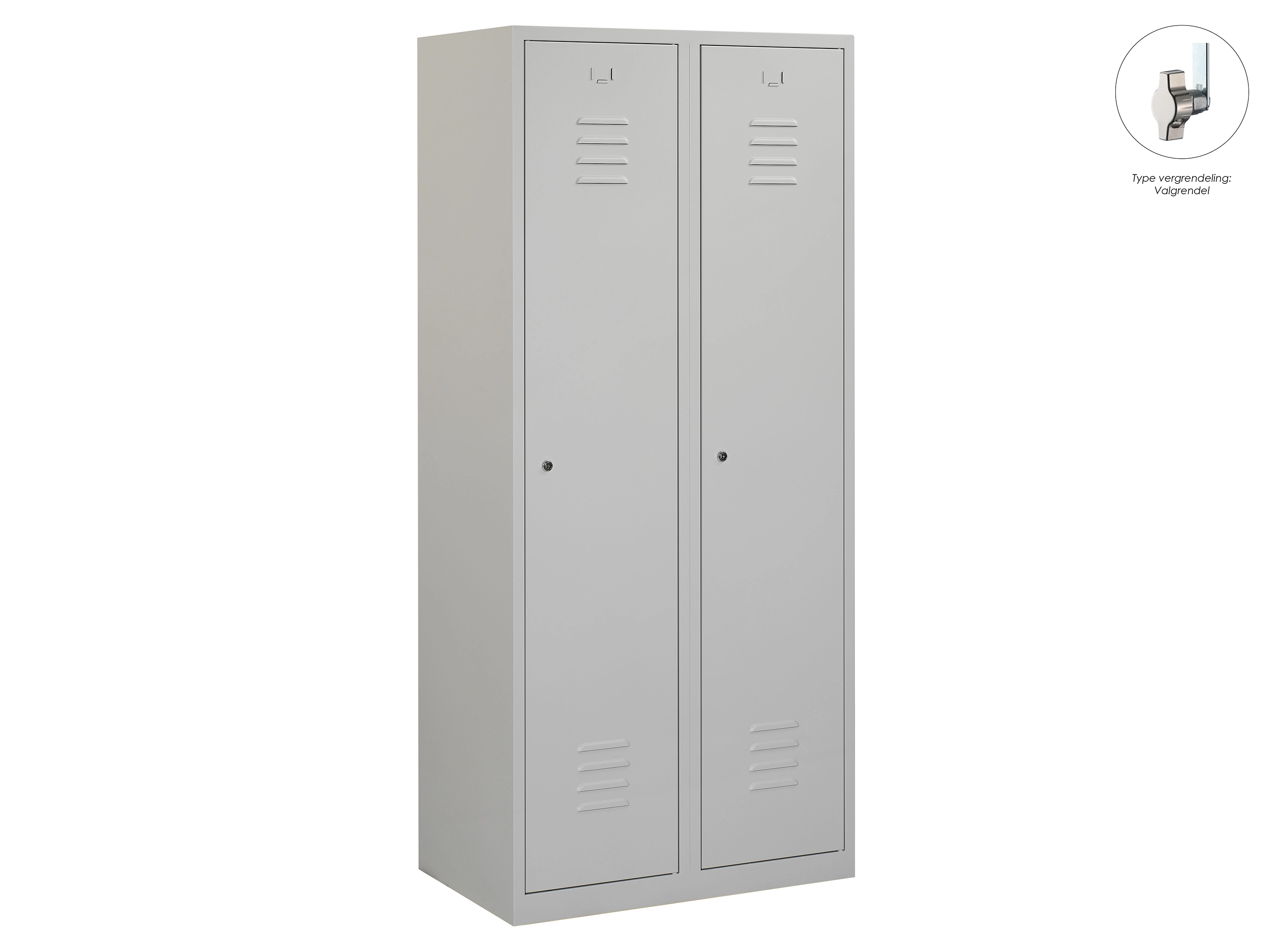 Type deuren: draaideur (ventilatiesleuven), type slot: cilinderslot. Kleur romp: grijs (RAL7035), kleur deuren: grijs (RAL7035). Afmeting: 180x80x50 cm (HxBxD). Indeling: Legbord & kledingroede Aantal deuren: 2, aantal sleutels: 2.