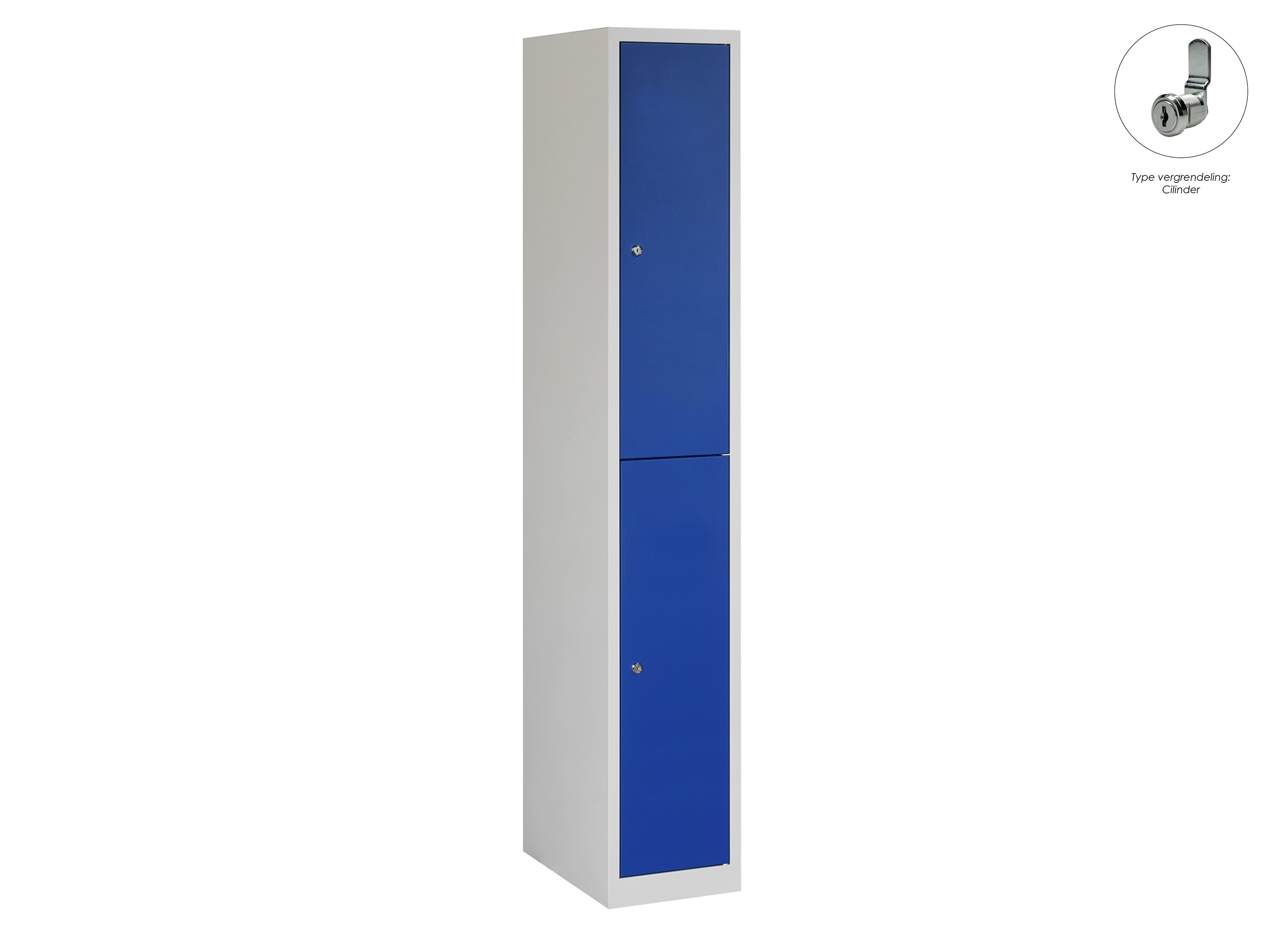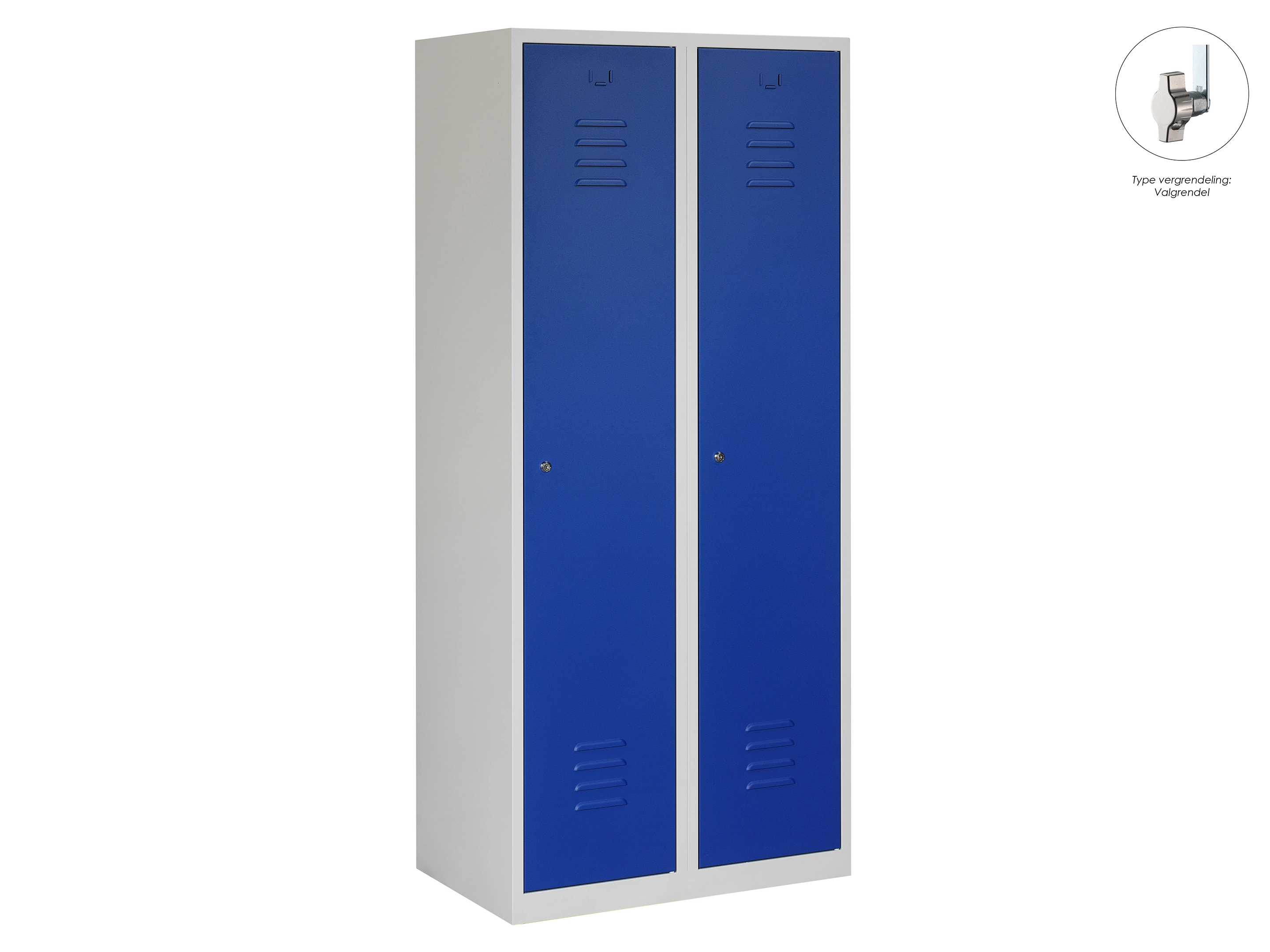 Type deuren: draaideur (ventilatiesleuven), type slot: cilinderslot. Kleur romp: grijs (RAL7035), kleur deuren: blauw (RAL5010). Afmeting: 180x80x50 cm (HxBxD). Indeling: Legbord & kledingroede Aantal deuren: 2, aantal sleutels: 2.